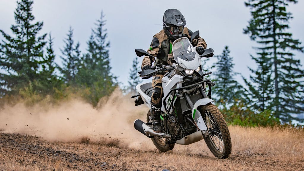 All’anteriore la KLE500 monta la ruota da 21 pollici, al posteriore c’è invece una ruota da 17 pollici. I cerchi calzano pneumatici IRC GP-410, adatti sia alla guida su asfalto che su sterrato.