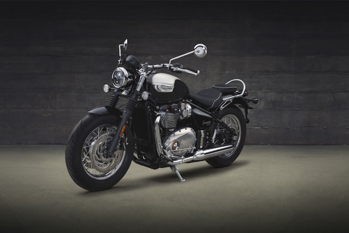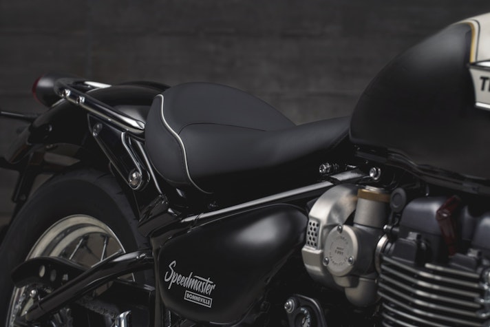 All’appello delle Bonneville del nuovo corso mancava una delle grandi protagoniste della storia recente di Triumph. Per il suo carattere eclettico, la Speedmaster è infatti stata una delle Modern Classic più apprezzate.A Hinckley la avevano catalogata come Cruiser ed era la entry level di una famiglia di cui facevano parte la Thunderbird da 1.700 cc e la Rocket III da 2.300 cc, che più o meno raddoppiavano e triplicavano la sua cubatura…PARENTE STRETTA DELLA BOBBERDunque, eccola. Nata da una costola della Bobber, ne condivide buona parte del corredo genetico, a partire dal motore 1.200 cc High Torque da 106 Nm a 4.000 giri e 77CV a 6.100 giri (il 10% in più rispetto alla Bonneville T120), che tanto è piaciuto a una larga fetta di motociclisti che ne hanno decretato il rapido successo di vendite.Alla Bobber la unisce l’avantreno con ruota da 19″, doppio disco da 310 mm con pinze Brembo a doppio pistoncino, forcella KYB con steli da 41 mm ed escursione da 90 mm e faro da 5″ full LED con funzione DRL.Anche il forcellone a gabbia con ammortizzatore nascosto sotto la sella è un elemento condiviso, così come gli scarichi corti a fetta di salame, il mozzo posteriore dal classico look a tamburo e il vano della batteria con fascia di chiusura in acciaio. Confermata anche la presenza del cruise-control azionabile con un solo pulsante.SEGNI DISTINTIVILa sua personalità è invece sottolineata dal serbatoio più capiente – 12 litri contro 9 – dalle pedane avanzate, dal manubrio in stile beach bar da 770 mm e dal telaietto posteriore con configurazione biposto (ma la sella del passeggero è asportabile…). Anche alcune quote della ciclistica sono state ridefinite per adattarsi alla differente impostazione e alla eventuale presenza di un passeggero: l’altezza sella cresce da 690 a 705 mm, l’angolo di sterzo scende di mezzo grado a 25,3° mentre l’avancorsa aumenta di 3,5 mm e si fissa a 91,4 mm a fronte di un interasse che si mantiene a 1.510 mm.Inevitabile anche un aumento del peso che cresce di 8 kg e raggiunge quota 245,5 kg.130 ACCESSORI E DUE KITEclettica era la sua progenitrice, eclettica è anche lei e non poteva essere diversamente. Oltre al solito ricco catalogo di accessori – siamo a quota 130 -, in Triumph hanno pensato a due allestimenti completi che esaltassero le anime estreme della Speddmaster: Highway è la versione touring e Maverick quella hot-rod.All’opulenza della prima, con parabrezza regolabile, selle comfort, schienalino, borse in pelle e vezzi cromati si contrappone l’essenzialità e l’aggressività della seconda, che affida la voce agli scarichi Vance & Hines e il look al manubrio sportivo, alla sella monoposto trapuntata e alle finitrure rigorosamente nere.La nuova Speedmaster è disponibile in tre colorazioni: Jet Black, Cranberry Red (molto bella nella configurazione Maverick con sella marrone, ndr) e l’elegante bicolore Fusion White/Phantom Black.
