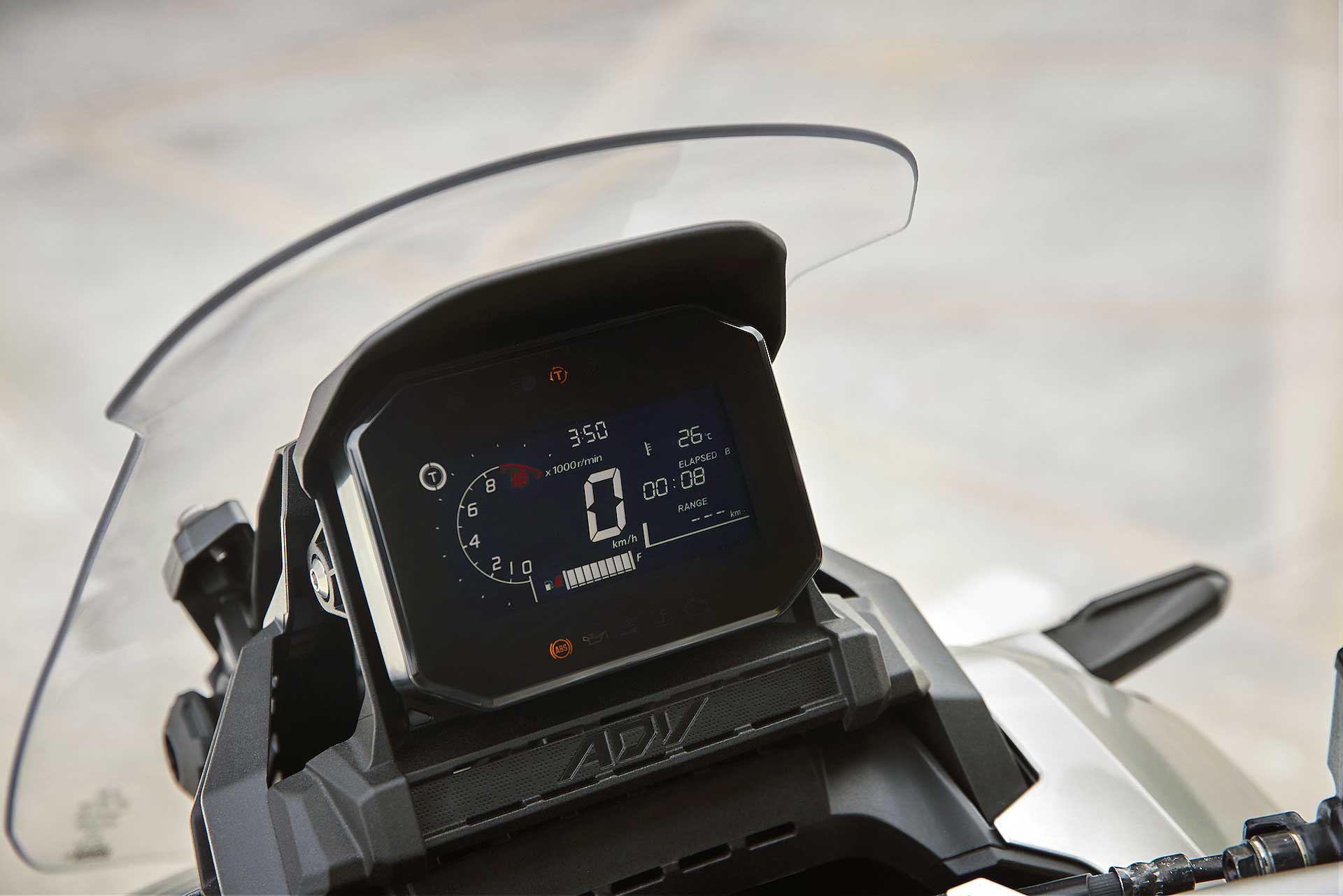 Se si parla di comfort non si possono non menzionare le sospensioni, che nel caso dell’Honda ADV350 sono ottimizzate per le strade dissestate delle città e l’off-road leggero. La forcella a steli rovesciati – da 37 mm – vanta un’escursione di 125 mm. Gli ammortizzatori posteriori presentano il serbatoio del gas separato, e molle progressive a triplo stadio, e sono fissati a un forcellone monoblocco in alluminio con escursione ruota di 130 mm. Quanto alle ruote, i cerchi sono in alluminio pressofuso, quello anteriore da 15 pollici e quello posteriore da 14 pollici. Gli pneumatici, con battistrada semitassellato, sono 120/70-15” all’anteriore e 140/70-14” al posteriore. Il telaio è a struttura di tipo tubolare ed è realizzato in acciaio; l’interasse misura 1.520 mm, l’inclinazione del cannotto di sterzo è di 26,5° e l’avancorsa misura 90 mm. Il peso con il pieno di benzina è di 186 kg.