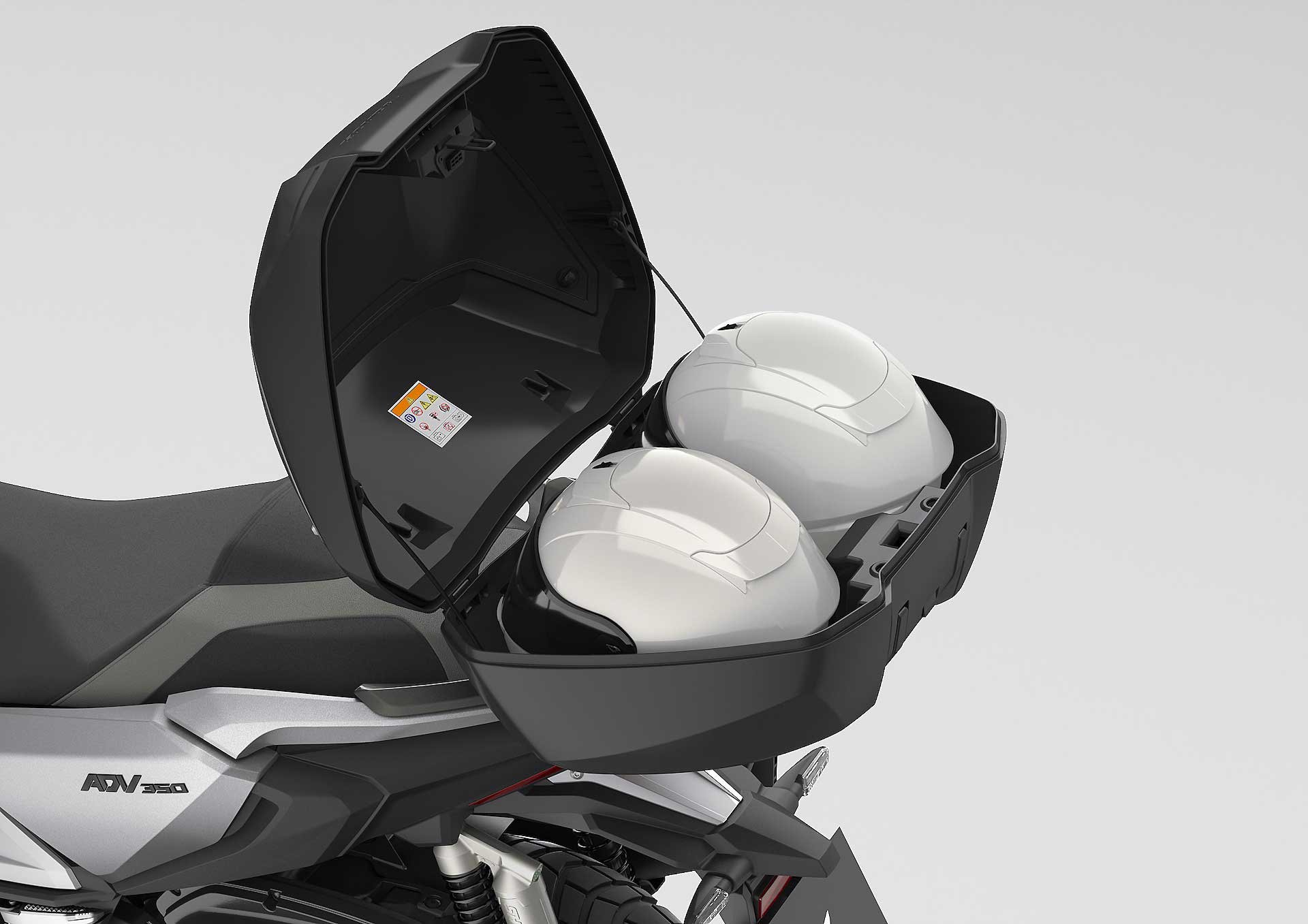 Il look dell’Honda ADV350 è avventuroso, lo spirito è molto pratico. Lo testimoniano, fra le altre cose, il vano sottosella da 48 litri (ci stanno due caschi integrali) suddivisibile con una paratia posizionabile in diversi punti e il vano portaoggetti anteriore sinistro con tanto di presa USB-C. L’altezza sella posta a 795 mm garantisce grande facilità di utilizzo a persone di tutte le stature.