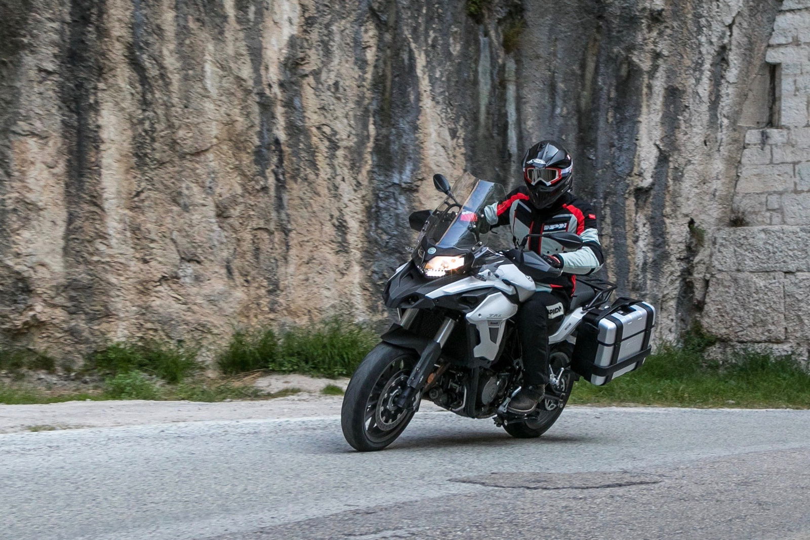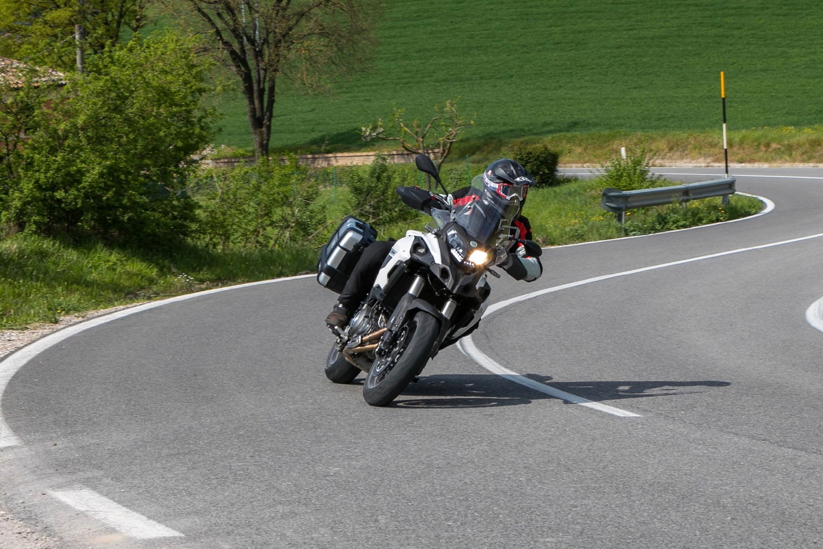 Questa Benelli continua a dimostrarsi facile anche con il salire della velocità. Non si tratta della proverbiale bicicletta, perché l’interasse di 1.525 mm è da mezzo di grossa cilindrata (e infatti in futuro dovrebbe arrivare anche una TRK di maggior cubatura), ma ogni manovra si compie in modo molto graduale e naturale, senza che al pilota sia richiesto un grande sforzo per indirizzare la moto a destra e a manca. Gli inserimenti in curva sono omogenei e la moto è stabile in traiettoria, capace di digerire senza scomporsi tanto anche buche e avvallamenti incontrati sulla strada. La guida che preferisce è quella tonda e pulita e ripaga l’uso di maniere gentili con reazioni prevedibili, anche quando il passo si fa allegro. Cercare di aggredire il misto con il coltello tra i denti in stile motard non ha invece molto senso, perché non è nelle corde della TRK 502. Lo dimostrano anche i freni, più modulabili che potenti, e il temperamento del motore.
