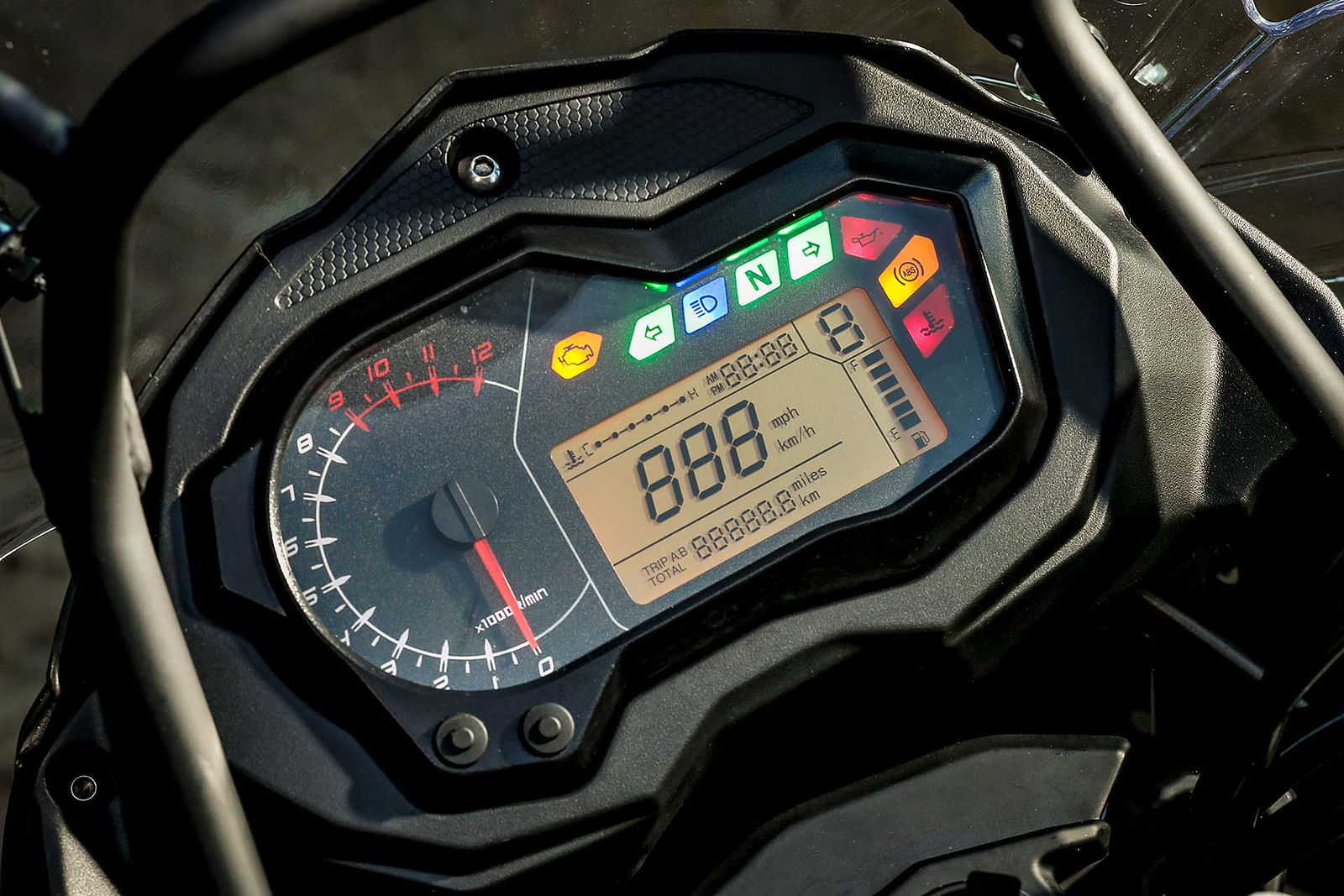 Issata sul cavalletto centrale, la Benelli TRK 502 X non dà certo l’impressione di essere una moto di piccola cilindrata. Voluminosa e un po’ ingombrante, potrebbe piacere anche a chi in moto ha voglia di tornare dopo una pausa, oltre che a tutti coloro che cercano un modello da cui iniziare. La qualità degli accoppiamenti è discreta, ma si potrebbe fare meglio nei dettagli, come i cavi degli indicatori di direzione posteriori, agganciati al portapacchi con un paio di fascette, o il plexiglas che distorce leggermente la visuale.