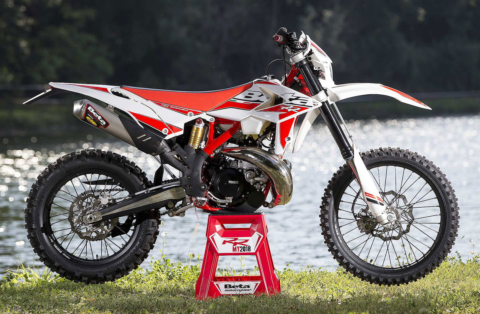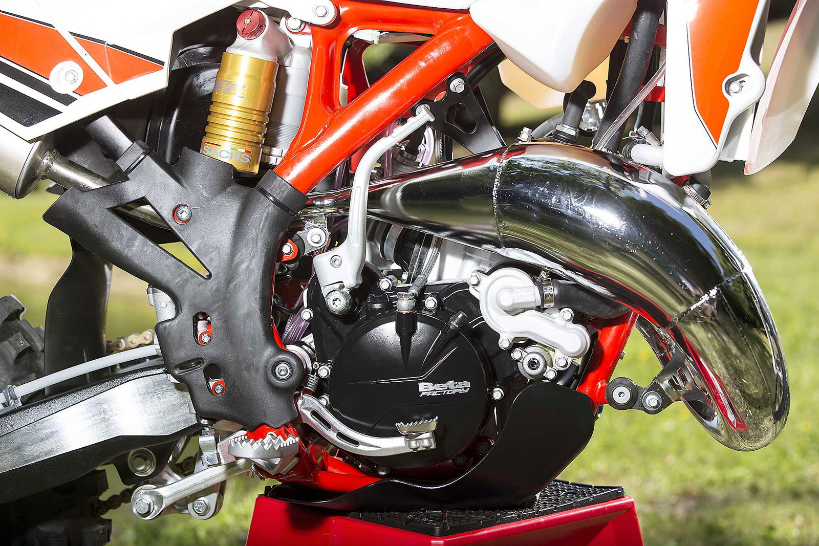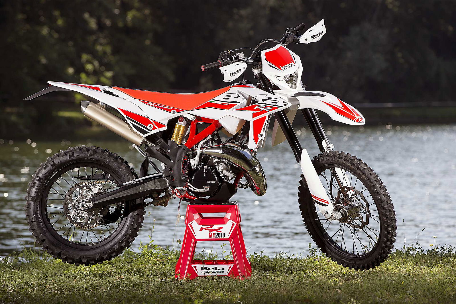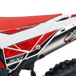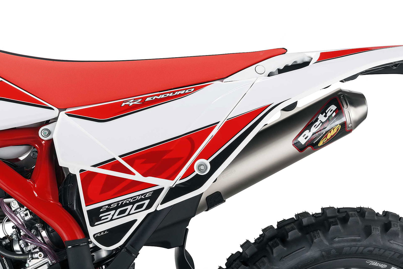 Per tornare all’aggiornamento della gamma 2 e 4 tempi 2018, le principali novità riguardano come detto la notevole riduzione di peso su entrambe le categorie. Ciò è stato reso possibile grazie ad un grandissimo lavoro dei tecnici Beta che sono intervenuti su vari aspetti. I principali sono la riprogettazione di tutta la parte anteriore del telaio in acciaio dalla bellissima colorazione rossa, l’abbandono del kick starter su tutti i modelli, che rimane comunque disponibile come accessorio a richiesta, e l’adozione di materiali e componenti più leggeri. La sospensione anteriore Sachs da 48 mm ha nuovi foderi, più leggeri, ed insieme al mono Sachs, è stata tarata per lavorare al meglio in sintonia con il nuovo telaio. Nuovi sono anche il parafango posteriore e la cassa filtro, più rastremata, ed i silenziatori sulle versioni a 4T, anch’essi più compatti negli ingombri, che accentuano la sensazione di snellezza generale anche dal punto di vista visivo. Completano il piacevole impatto estetico le nuove grafiche con livrea bianca su telaio rosso e cerchi Takasago Excel neri.