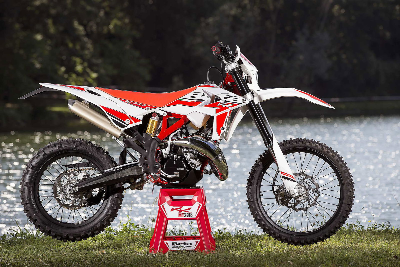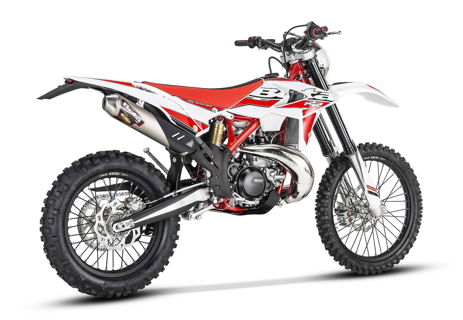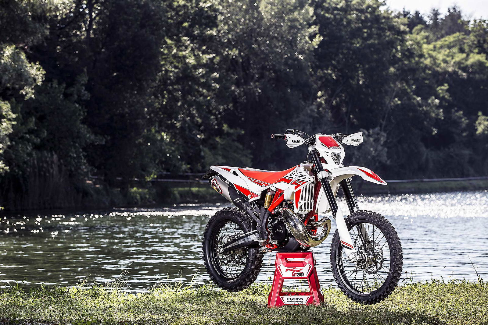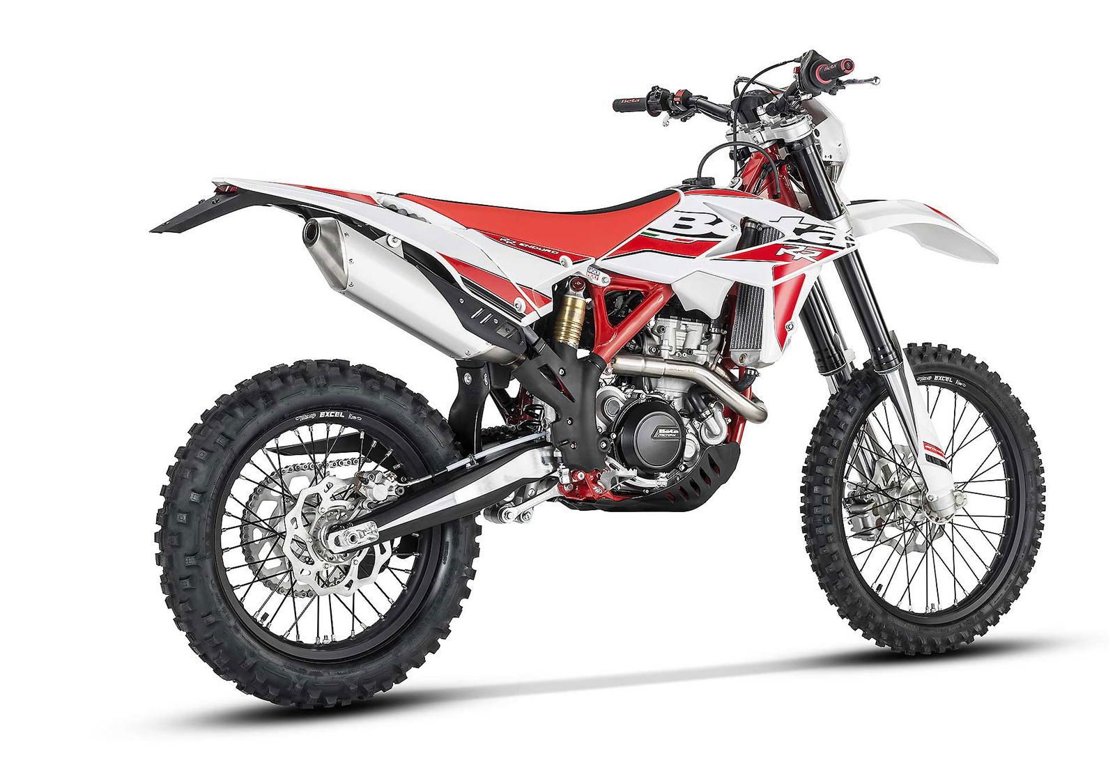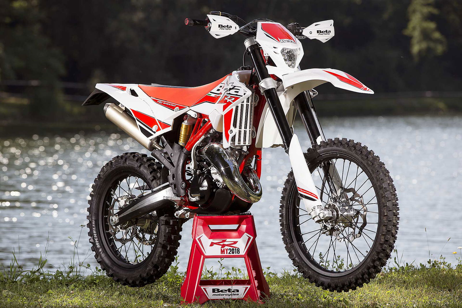 Per tornare all’aggiornamento della gamma 2 e 4 tempi 2018, le principali novità riguardano come detto la notevole riduzione di peso su entrambe le categorie. Ciò è stato reso possibile grazie ad un grandissimo lavoro dei tecnici Beta che sono intervenuti su vari aspetti. I principali sono la riprogettazione di tutta la parte anteriore del telaio in acciaio dalla bellissima colorazione rossa, l’abbandono del kick starter su tutti i modelli, che rimane comunque disponibile come accessorio a richiesta, e l’adozione di materiali e componenti più leggeri. La sospensione anteriore Sachs da 48 mm ha nuovi foderi, più leggeri, ed insieme al mono Sachs, è stata tarata per lavorare al meglio in sintonia con il nuovo telaio. Nuovi sono anche il parafango posteriore e la cassa filtro, più rastremata, ed i silenziatori sulle versioni a 4T, anch’essi più compatti negli ingombri, che accentuano la sensazione di snellezza generale anche dal punto di vista visivo. Completano il piacevole impatto estetico le nuove grafiche con livrea bianca su telaio rosso e cerchi Takasago Excel neri.