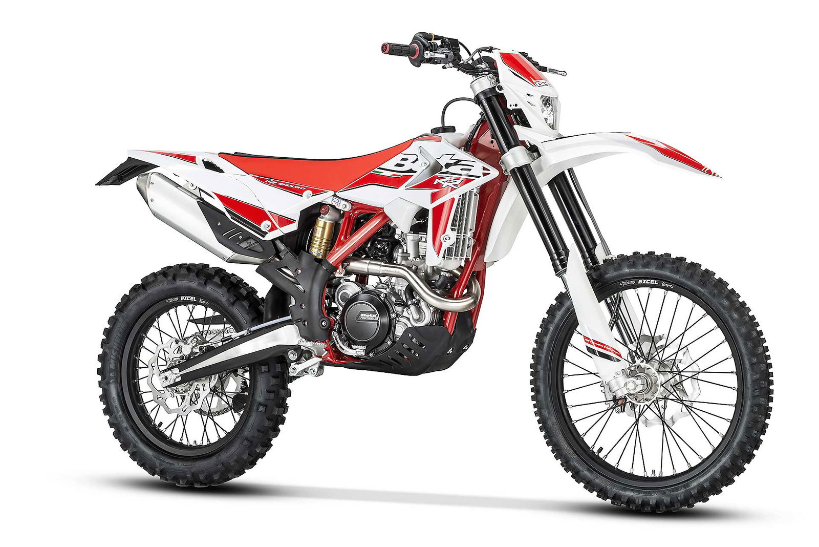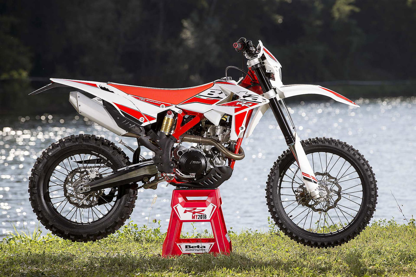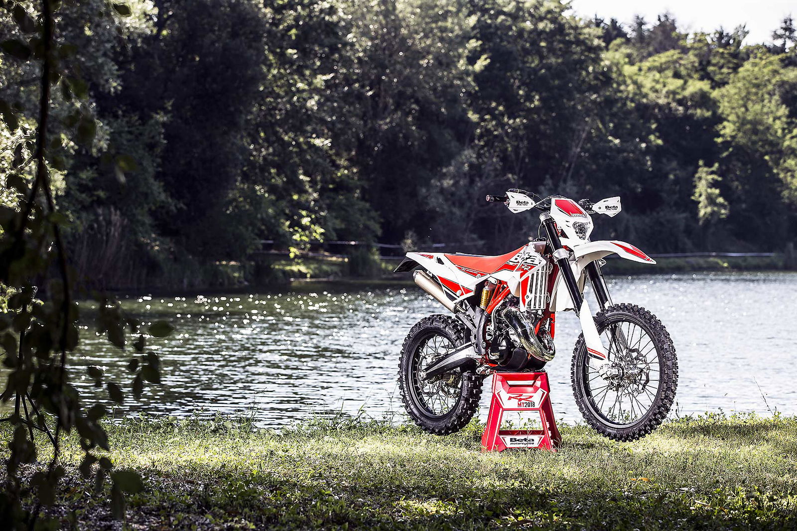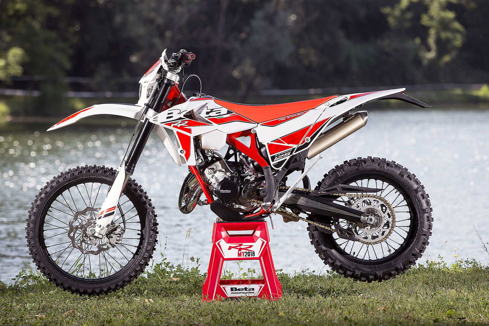Per tornare all’aggiornamento della gamma 2 e 4 tempi 2018, le principali novità riguardano come detto la notevole riduzione di peso su entrambe le categorie. Ciò è stato reso possibile grazie ad un grandissimo lavoro dei tecnici Beta che sono intervenuti su vari aspetti. I principali sono la riprogettazione di tutta la parte anteriore del telaio in acciaio dalla bellissima colorazione rossa, l’abbandono del kick starter su tutti i modelli, che rimane comunque disponibile come accessorio a richiesta, e l’adozione di materiali e componenti più leggeri. La sospensione anteriore Sachs da 48 mm ha nuovi foderi, più leggeri, ed insieme al mono Sachs, è stata tarata per lavorare al meglio in sintonia con il nuovo telaio. Nuovi sono anche il parafango posteriore e la cassa filtro, più rastremata, ed i silenziatori sulle versioni a 4T, anch’essi più compatti negli ingombri, che accentuano la sensazione di snellezza generale anche dal punto di vista visivo. Completano il piacevole impatto estetico le nuove grafiche con livrea bianca su telaio rosso e cerchi Takasago Excel neri.