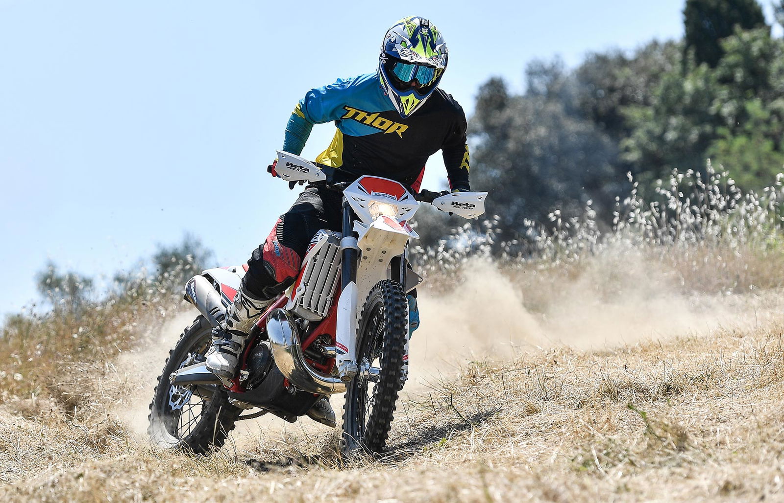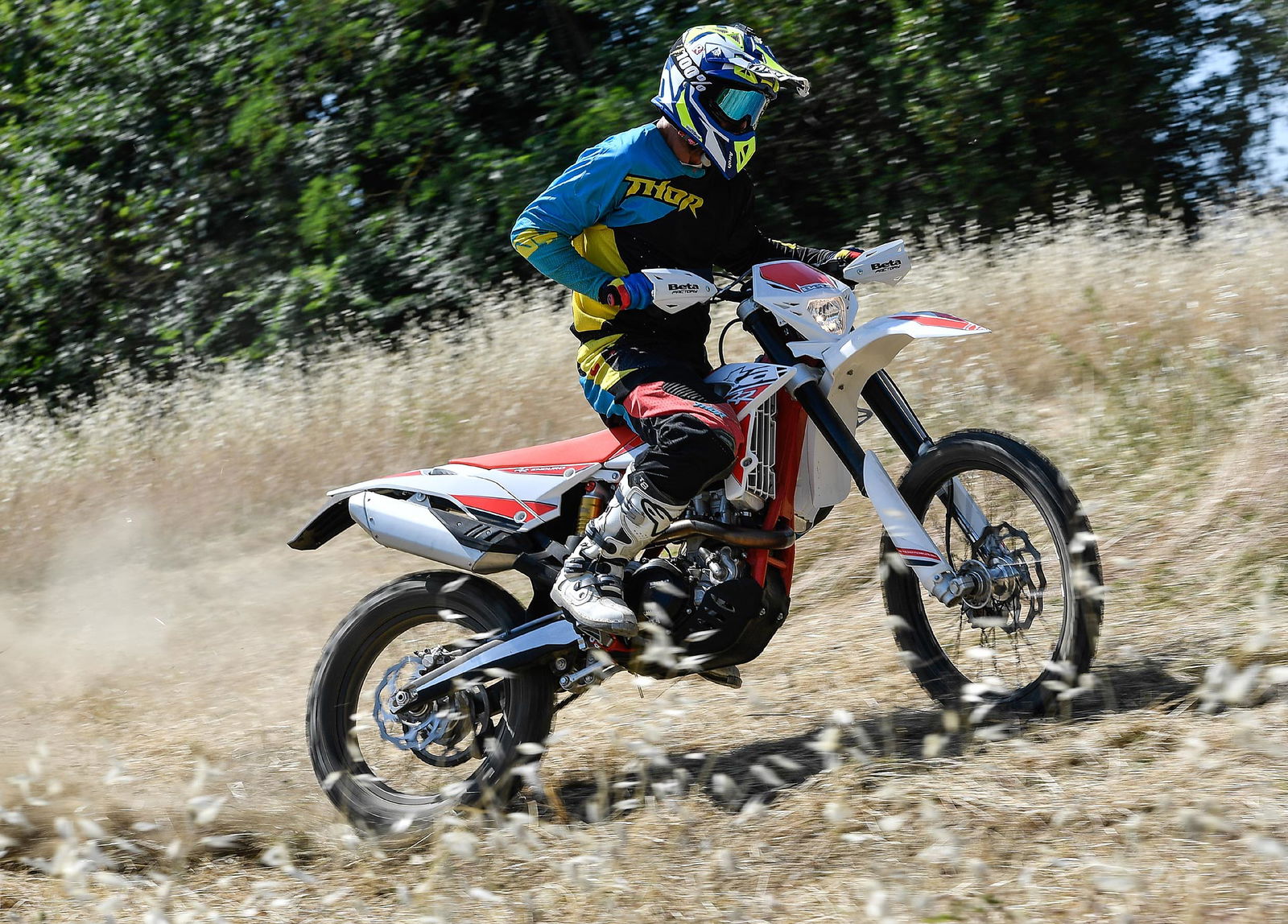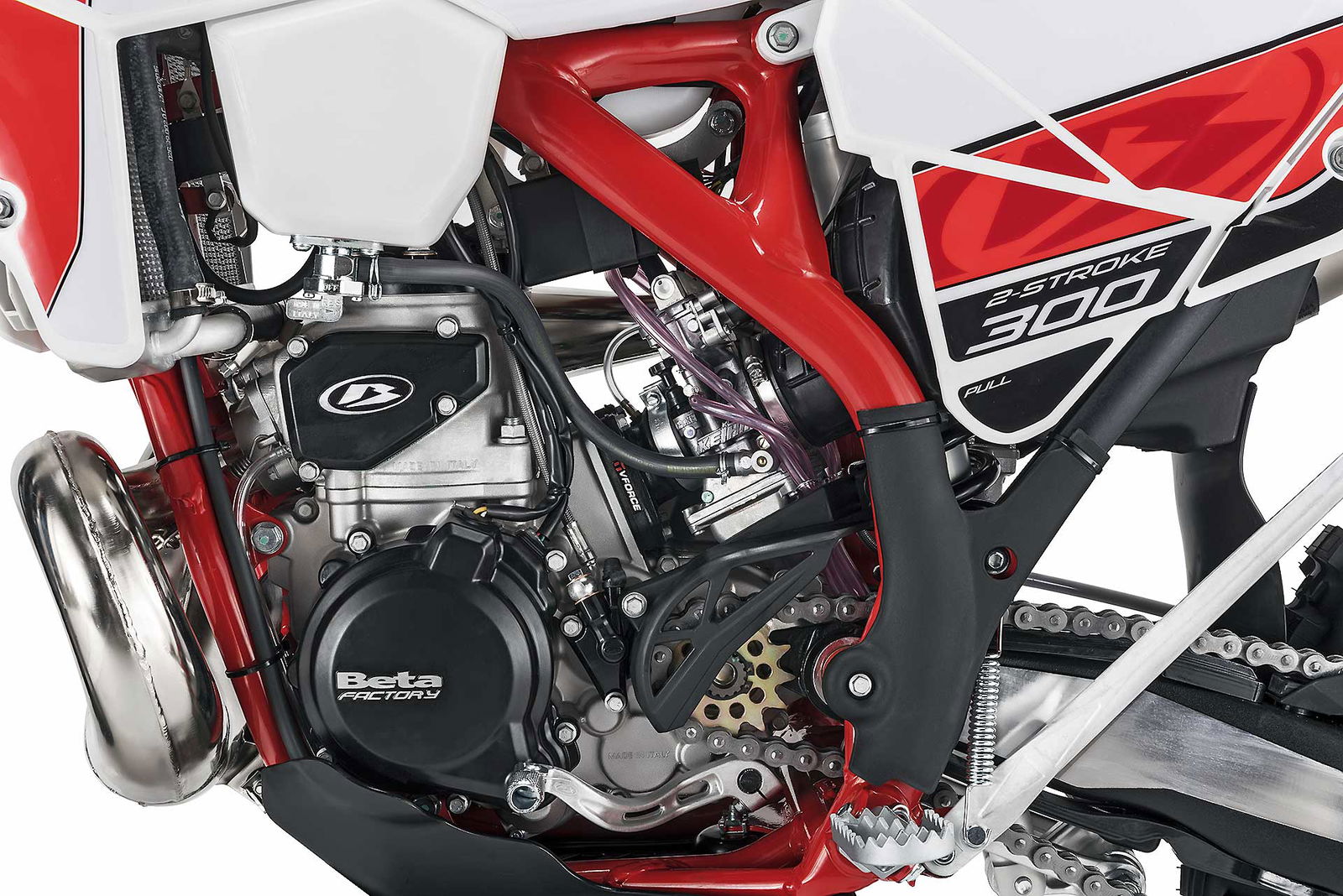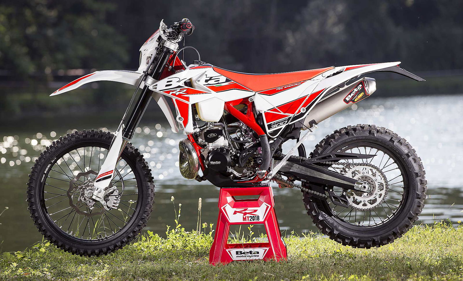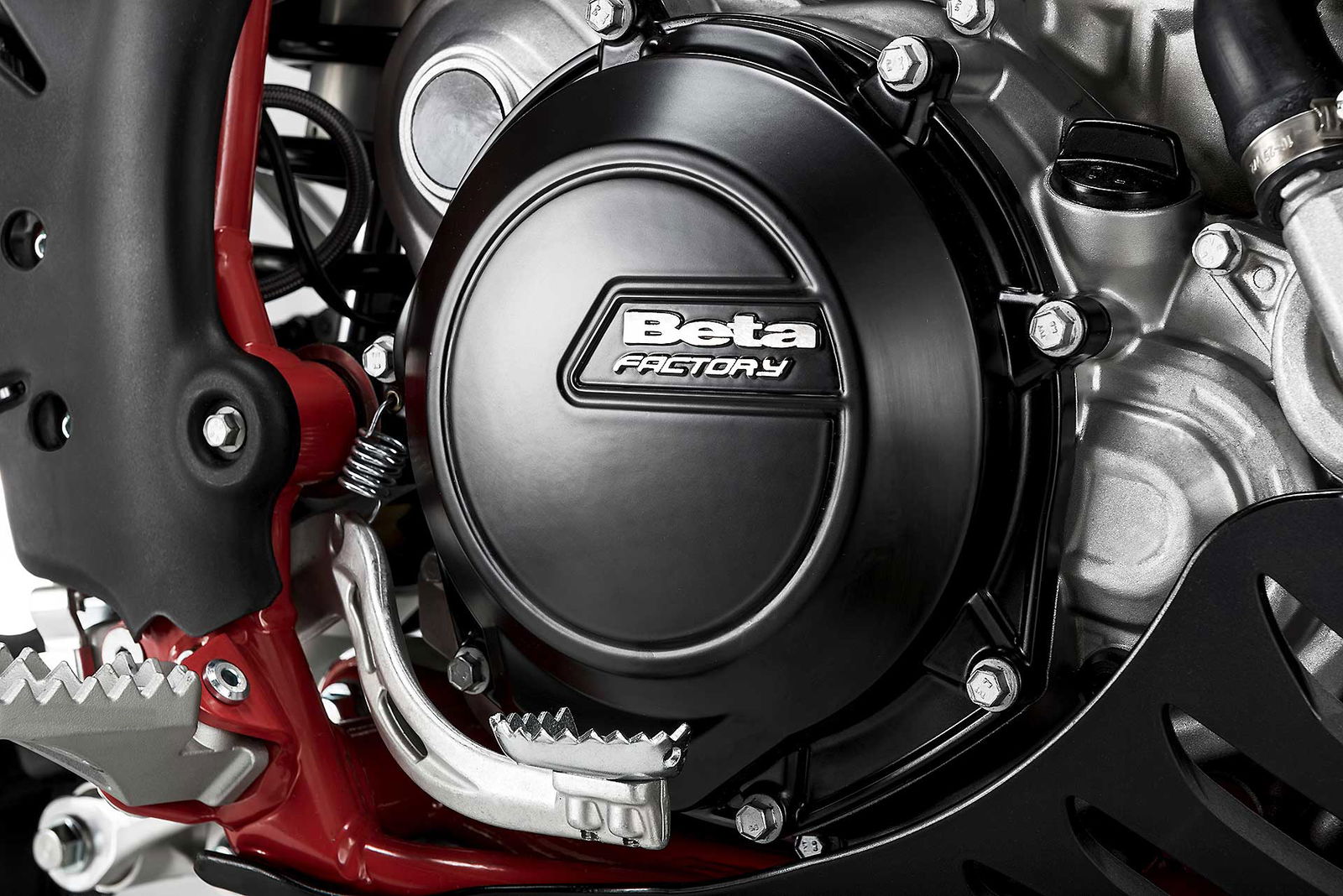 Per tornare all’aggiornamento della gamma 2 e 4 tempi 2018, le principali novità riguardano come detto la notevole riduzione di peso su entrambe le categorie. Ciò è stato reso possibile grazie ad un grandissimo lavoro dei tecnici Beta che sono intervenuti su vari aspetti. I principali sono la riprogettazione di tutta la parte anteriore del telaio in acciaio dalla bellissima colorazione rossa, l’abbandono del kick starter su tutti i modelli, che rimane comunque disponibile come accessorio a richiesta, e l’adozione di materiali e componenti più leggeri. La sospensione anteriore Sachs da 48 mm ha nuovi foderi, più leggeri, ed insieme al mono Sachs, è stata tarata per lavorare al meglio in sintonia con il nuovo telaio. Nuovi sono anche il parafango posteriore e la cassa filtro, più rastremata, ed i silenziatori sulle versioni a 4T, anch’essi più compatti negli ingombri, che accentuano la sensazione di snellezza generale anche dal punto di vista visivo. Completano il piacevole impatto estetico le nuove grafiche con livrea bianca su telaio rosso e cerchi Takasago Excel neri.