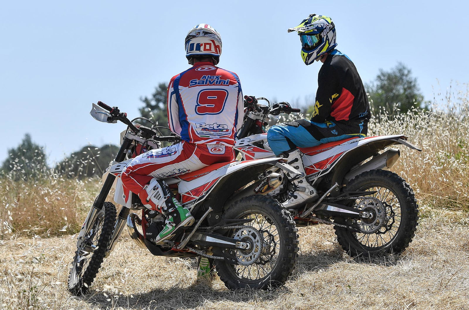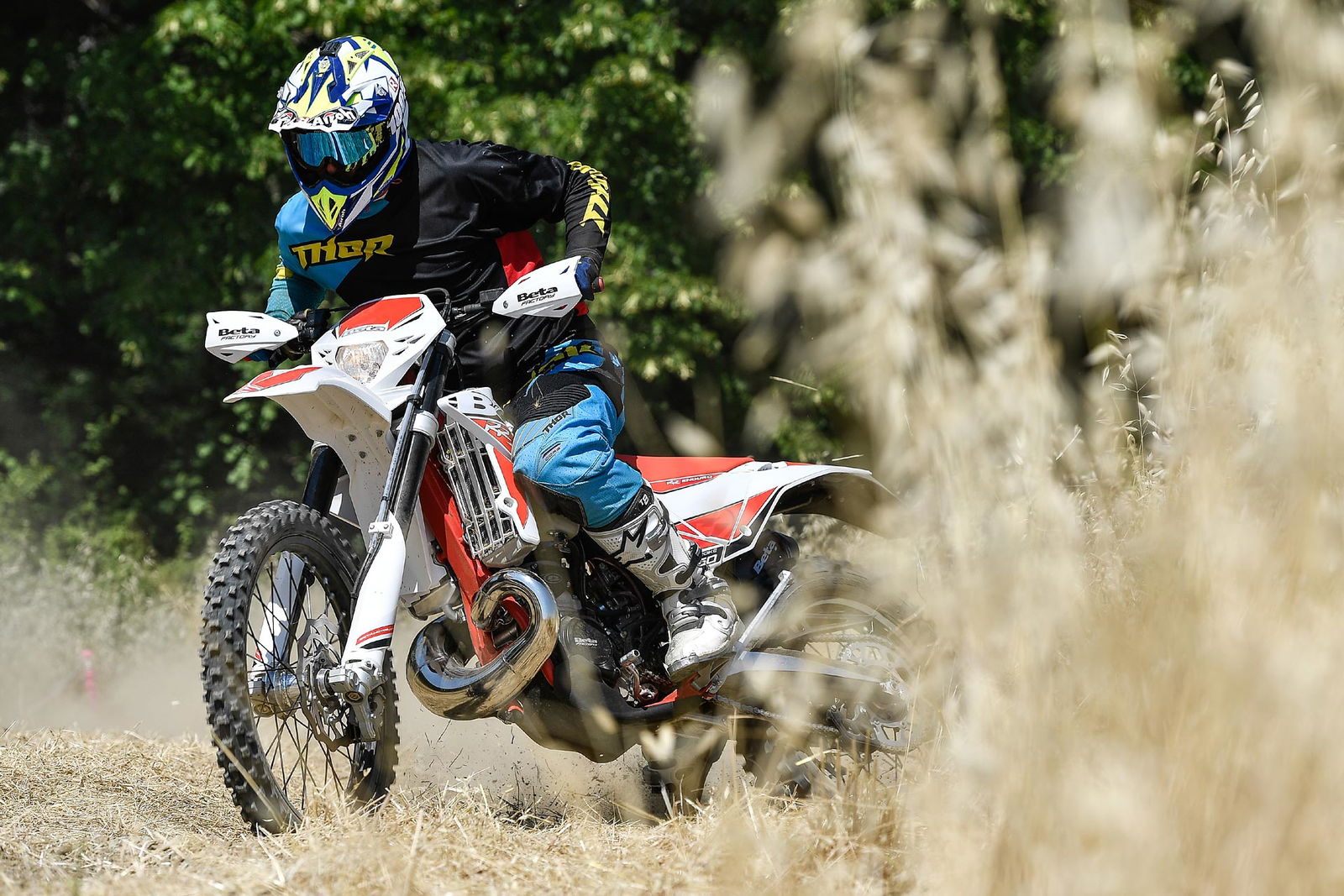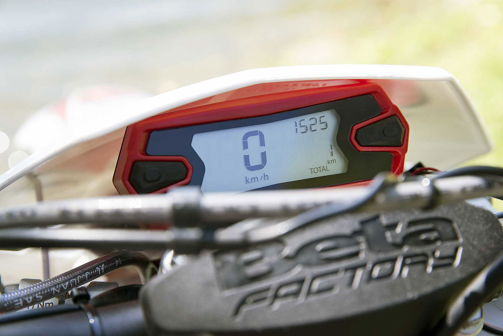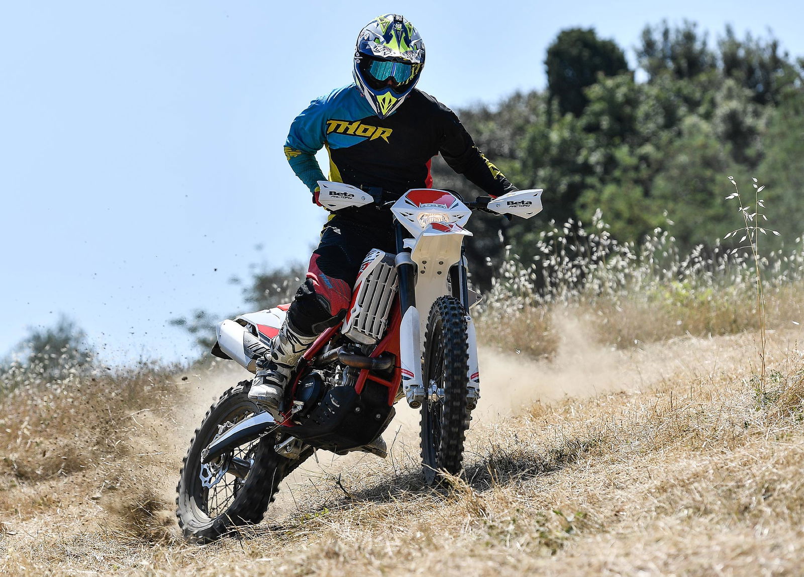 Per tornare all’aggiornamento della gamma 2 e 4 tempi 2018, le principali novità riguardano come detto la notevole riduzione di peso su entrambe le categorie. Ciò è stato reso possibile grazie ad un grandissimo lavoro dei tecnici Beta che sono intervenuti su vari aspetti. I principali sono la riprogettazione di tutta la parte anteriore del telaio in acciaio dalla bellissima colorazione rossa, l’abbandono del kick starter su tutti i modelli, che rimane comunque disponibile come accessorio a richiesta, e l’adozione di materiali e componenti più leggeri. La sospensione anteriore Sachs da 48 mm ha nuovi foderi, più leggeri, ed insieme al mono Sachs, è stata tarata per lavorare al meglio in sintonia con il nuovo telaio. Nuovi sono anche il parafango posteriore e la cassa filtro, più rastremata, ed i silenziatori sulle versioni a 4T, anch’essi più compatti negli ingombri, che accentuano la sensazione di snellezza generale anche dal punto di vista visivo. Completano il piacevole impatto estetico le nuove grafiche con livrea bianca su telaio rosso e cerchi Takasago Excel neri.