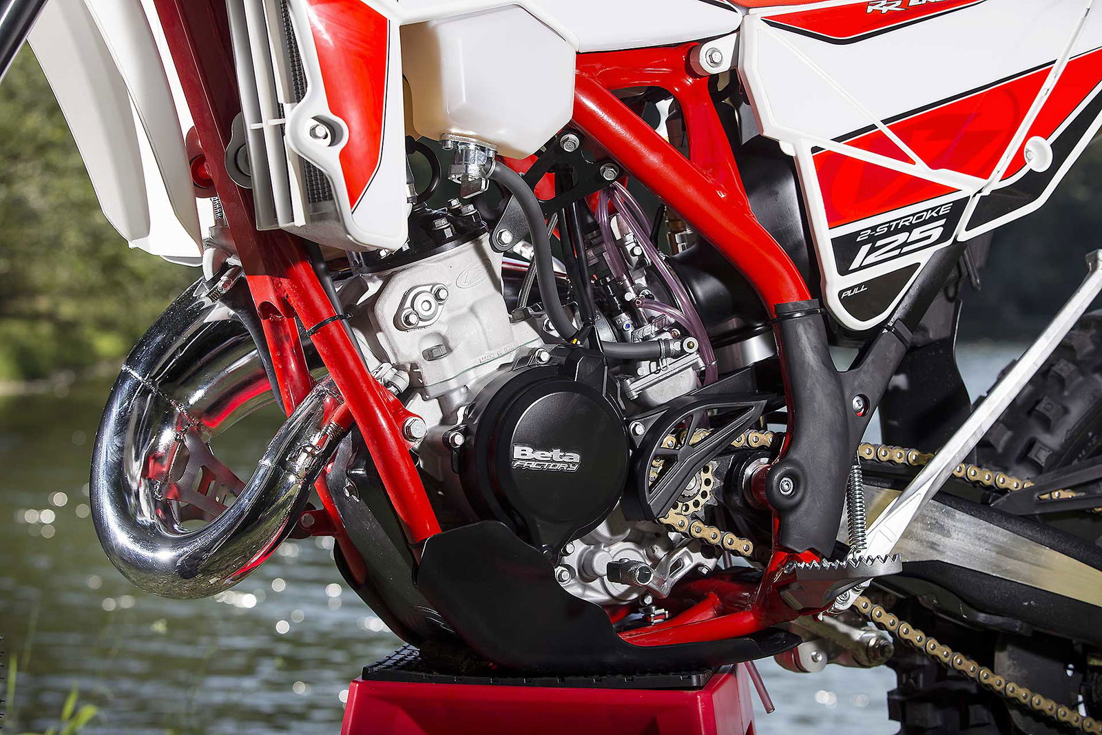 Partendo proprio da quest’ultima, possiamo dire che sicuramente un tassello molto importante nella gamma Enduro RR 2T, visto che va a colmare il “buco” tra le piccole 50 cc e le sorelle maggiori 250cc e 300 cc, per fidelizzare i giovani clienti che troveranno ora nella ottavo di litro la moto che mancava per poi passare alle cilindrate “adulte”. Ma non solo è una delle poche enduro 2T 125 omologate Euro4 e potrà accontentare gli appassionati del genere che sono rimasti “orfani” degli altri marchi”. Si tratta di un progetto completamente nuovo e 100% made in Beta. Il motore si presenta molto compatto negli ingombri, è dotato di pistone bifascia che insieme alla Beta progressive Valve, derivata dalle sorelle maggiori 250 e 300 2T, garantisce un’erogazione più progressiva e lineare della potenza. Completano il quadro tecnico i carter pressofusi in alluminio con coperchi in magnesio, la testa scomponibile, cambio a 6 rapporti e la predisposizione per l’avviamento elettrico (optional), che comunque non è necessario vista l’estrema facilità nella messa in moto data dalla cubatura ridotta.