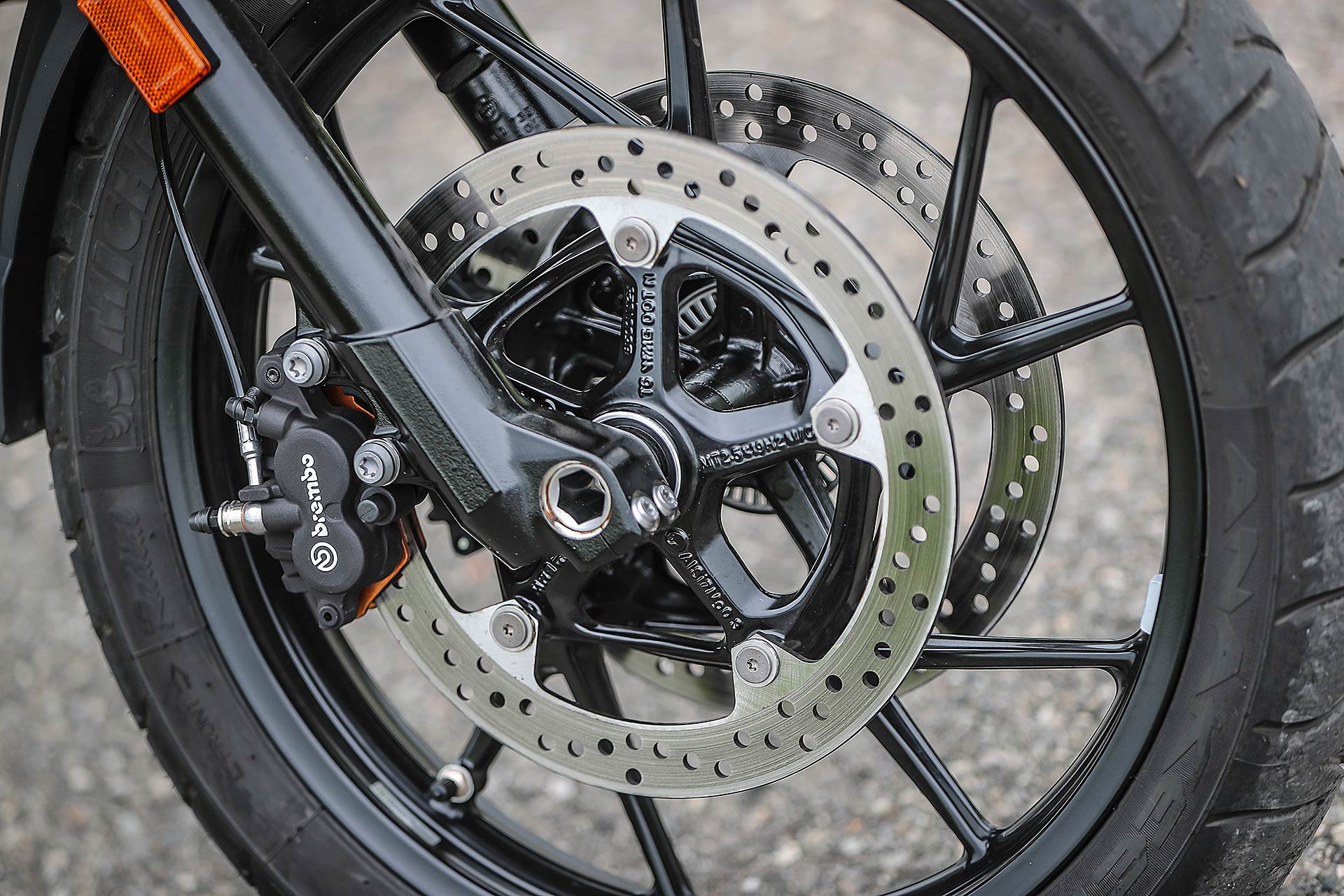 Un’annata così piovosa non la ricordavo da tempo e anche in occasione del test uno scroscio d’acqua non si è fatto attendere. L’alternanza di asfalto asciutto e bagnato contribuisce a capire quale sia il comportamento dinamico, la modulabilità dei freni, il grip degli pneumatici e il controllo di trazione ASC. Le informazioni che arrivano a chi guida sono sempre chiare, l’avantreno assorbe dignitosamente le variazioni di superficie e va nella direzione pensata. La sospensione posteriore trasmette a terra grip e cavalli anche quando la pioggia si fa intensa. L’impianto frenante con doppio disco anteriore da 305 mm si gestisce con un singolo dito ed entrambe le leve al manubrio sono regolabili nella distanza e pratiche anche per chi ha mani piccole.Connessi h24
