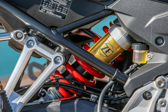 Identità condivisa A differenza della Adventure con motore boxer che da sempre si distingue per quote maggiorate rispetto alla standard la F 850 GS conserva la stessa ciclistica. Il telaio d’acciaio mono scocca è sostenuto da sospensioni della ZF Sachs che hanno escursioni di 230 mm della forcella non regolabile e 215 mm del mono ammortizzatore con regolazione elettronica ESA a richiesta.