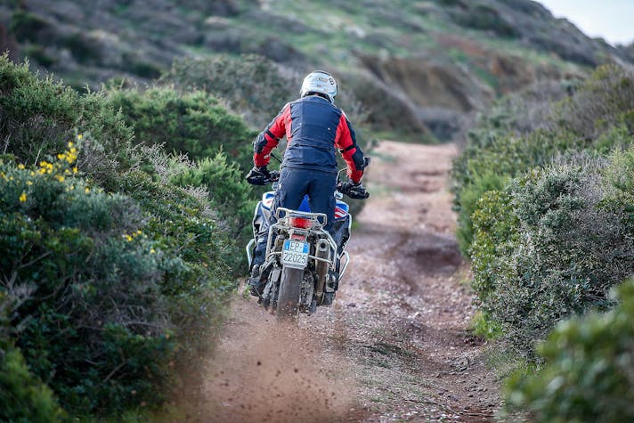 La posizione in sella cambia, complice il piano più alto di 875 mm, e il maggior carico di peso all’avantreno dovuto al serbatoio da 23 litri e alle protezioni in tubi del motore. In più la Adv ha di serie accessori, piccoli particolari che migliorano la guida. Aumenta l’altezza del manubrio, il parabrezza maggiorato e facilmente regolabile protegge bene, le pedane ampie offrono un appoggio più stabile utile nella guida in piedi in fuoristrada.