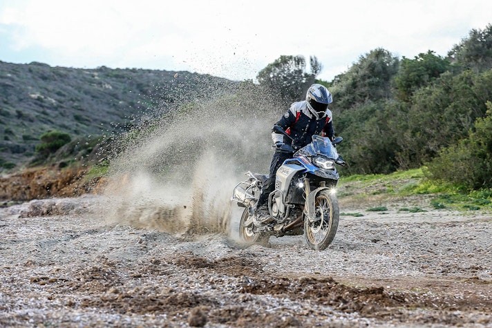 Nonostante la mole, la Adventure affronta a testa alta i percorsi fuoristradistici. L’esperienza insegna di infilarsi su strade strerrate a serbatoio pieno, eppure nonostante i 23 litri il bilanciamento dei pesi pare ben azzeccato. La forcella reagisce alle continue buche che incontriamo nei primi chilometri del test senza affondare e senza andare in crisi: non perde ritmo, assorbe e si distende rapidamente riportando la GS 850 ad un buon assetto. Anche la frenata in condizioni di bassa aderenza è soddisfacente, la risposta dei dischi e delle pinze non è mai aggressiva e l’ABS in configurazione Enduro Pro non entra mai in gioco lasciando però alla ruota posteriore la libertà di bloccaggio.