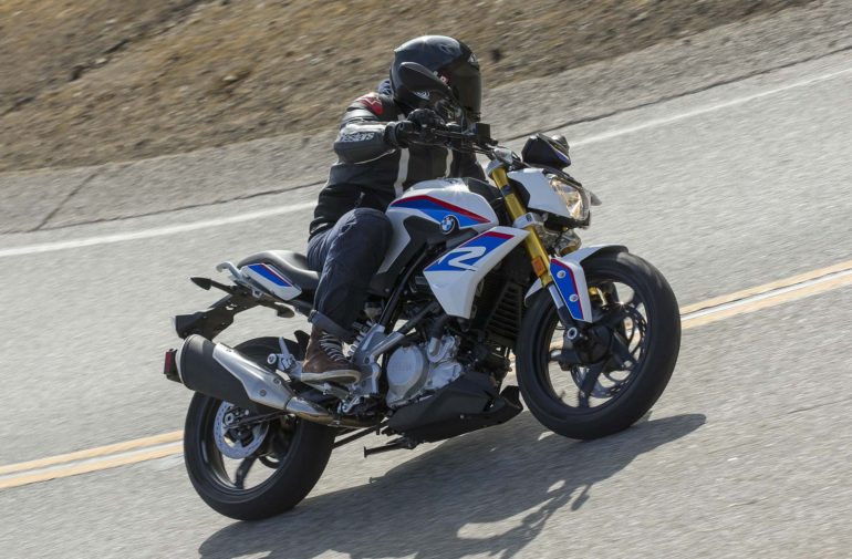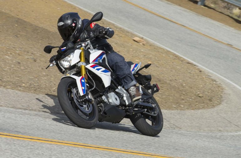 La curva di erogazione utile è in questo caso molto ampia, dato che il mono BMW accetta di scendere poco sotto i 3.000 giri senza recalcitrare, poi spinge in modo lineare, prende i giri rapidamente e ha solo una piccola pausa di riflessione attorno ai 5.000 giri, per poi cambiare ritmo a 6.000 e allungare fino agli 11.000 giri di strumento, con un regime ideale di cambiata (segnalato dal LED sul cruscotto) attorno a 10.000 giri. Un motore riuscito, silenzioso di meccanica e molto godibile a tutte le andature.Della G 310 R piace il bilanciamento generale: motore e ciclistica lavorano con grande equilibrio e quest’ultima soprattutto mostra velleità “da grande”. La G 310 R è una moto leggera, maneggevolissima, con un comportamento dinamico che non è quello di una “motoretta”: resta stabile e rassicurante anche quando la si strapazza tra le curve. Le quote ciclistiche sono azzeccate così come il setting delle sospensioni, che sono semplici ma funzionano bene e dondolano poco anche quando si alza il ritmo, copiando bene e tenendo le ruote attaccate a terra anche quando l’asfalto non è perfetto, e consentendo di guidare veloci senza troppi movimenti. Meglio la forcella (ottima) del monoammortizzatore, che a volte pare essere un po’ sfrenato. Anche i freni sono validi, e va benissimo l’ABS: la potenza è adeguata al peso e alle prestazioni; l’anteriore morde bene mentre il posteriore ha una leva con una escursione piuttosto lunga che richiede un movimento eccessivo del piede.
