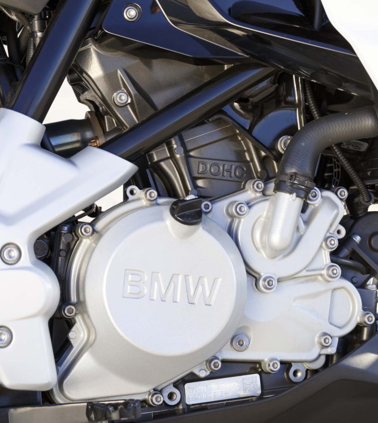 Il motore è un inedito monocilindrico bialbero da 313 cc con cilindro inclinato all’indietro (come le Yamaha da off road o la Honda Moto3, per intenderci) che utilizza una testa “girata” (aspirazione posta anteriormente, scarico posteriormente) ed è capace di erogare 34 cv a 9.500 giri con una coppia di 28 Nm a 7.500 giri. Una scelta tecnica senza dubbio distintiva, che ha consentito a BMW di centralizzare le masse e montare il motore in posizione più avanzata, realizzando al tempo stesso un forcellone estremamente lungo (650 mm) e ottimizzando la distribuzione dei pesi. L’abbinamento tra passo corto (1.374 mm) e forcellone lungo è ottimo per ottenere maneggevolezza, stabilità e trazione. La scelta BMW, quindi, esce dalla massa: va sottolineato come questo non sia un motore “povero”, anzi le soluzioni tecnologiche siano di primo piano. Basti pensare all’utilizzo di un contralbero antivibrazioni o, ad esempio, ai bilancieri a dito rivestiti in DLC per le punterie, la stessa soluzione adottata dalla S1000RR.Il comparto ciclistico è classico per questo segmento, con il telaio in acciaio a fare da ossatura e il già citato forcellone che ha un disegno particolare, visto che la parte superiore simula un traliccio. Forcella a steli rovesciati (41 mm) e pinza radiale (ByBre, il marchio “entry” di Brembo) che lavora un disco singolo da 300 mm donano un aspetto importante all’avantreno; le misure degli pneumatici sono da moto “grande” con il posteriore da 150/60. Tutto per un peso complessivo di 158,5 kg, ABS a due canali compreso.