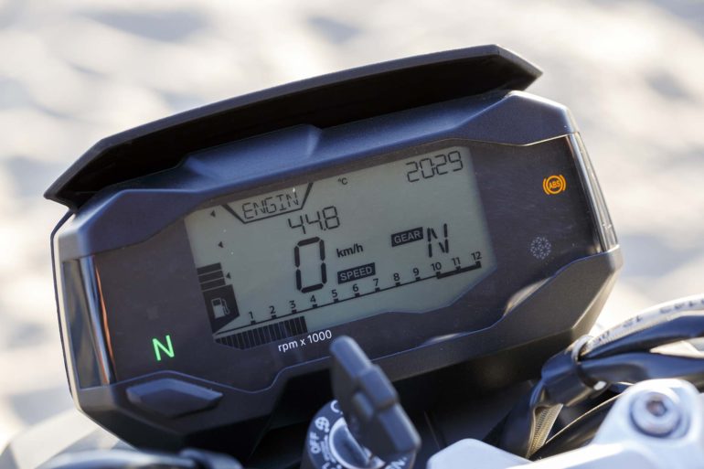Il dimensionamento è corretto: la moto è compatta ma abitabile anche per chi ha una statura normale; l’impressione, grazie alle cover del serbatoio (da 11 litri) generosamente dimensionate, è di essere al cospetto di una moto più “importante” di quanto la G 310 sia in realtà. In sella la piastra superiore di sterzo, il fissaggio dei riser con logo 3D, il manubrio verniciato e il cruscotto LCD (il migliore della categoria) offrono un bel punto di vista. In generale le finiture sono valide: apprezzabili le cover laterali del telaio in metallo (molte giapponesi le hanno di plastica) o le maniglie del passeggero, anch’esse in metallo. Peccato manchi la leva del freno regolabile, che vorrei su moto di qualsiasi prezzo.La posizione in sella è azzeccata, la sella standard è bassa: 785 mm; il manubrio si trova proprio dove deve essere. Le dimensioni sono quelle giuste per ospitare anche i normolinei, che troveranno forse solo le pedane un po’ alte e avanzate.Il motore è un altro tassello ben riuscito del progetto G 310 R: il mono tedesco frulla bene, vibra quasi niente – solo a 7.000 giri si percepiscono vibrazioni in zona serbatoio e una risonanza a livello di aspirazione – e soprattutto ha un’erogazione particolarmente azzeccata. Non è il più potente del lotto (c’è chi fa meglio anche tra i monocilindrici), tuttavia in BMW hanno studiato una curva di coppia spostata verso il basso e una rapportatura finale più corta che lunga, così la G 310 R si lascia guidare benissimo anche con marce “alte”. Non è, insomma, uno di quei frullini che chiedono che sia continuamente chiamato in causa il cambio – peraltro davvero eccellente, per velocità e escursione contenuta, uno dei miglior cambi BMW) -perché il tiro ai bassi è consistente e permette di muoversi svelti.
