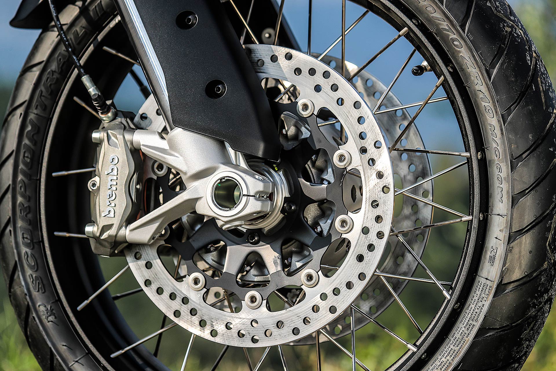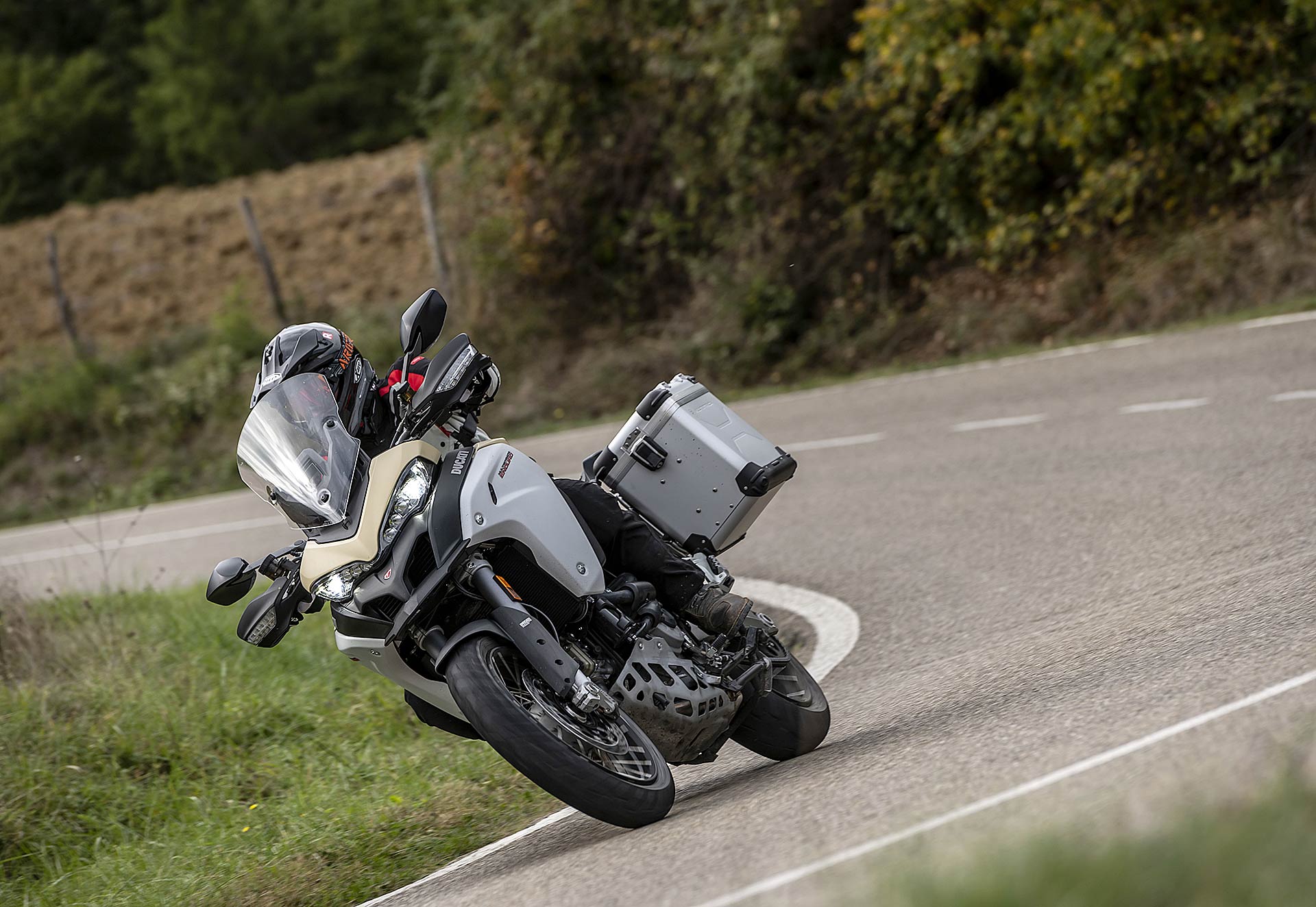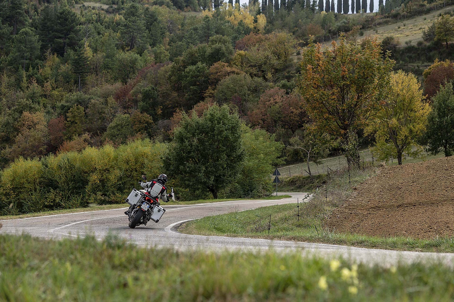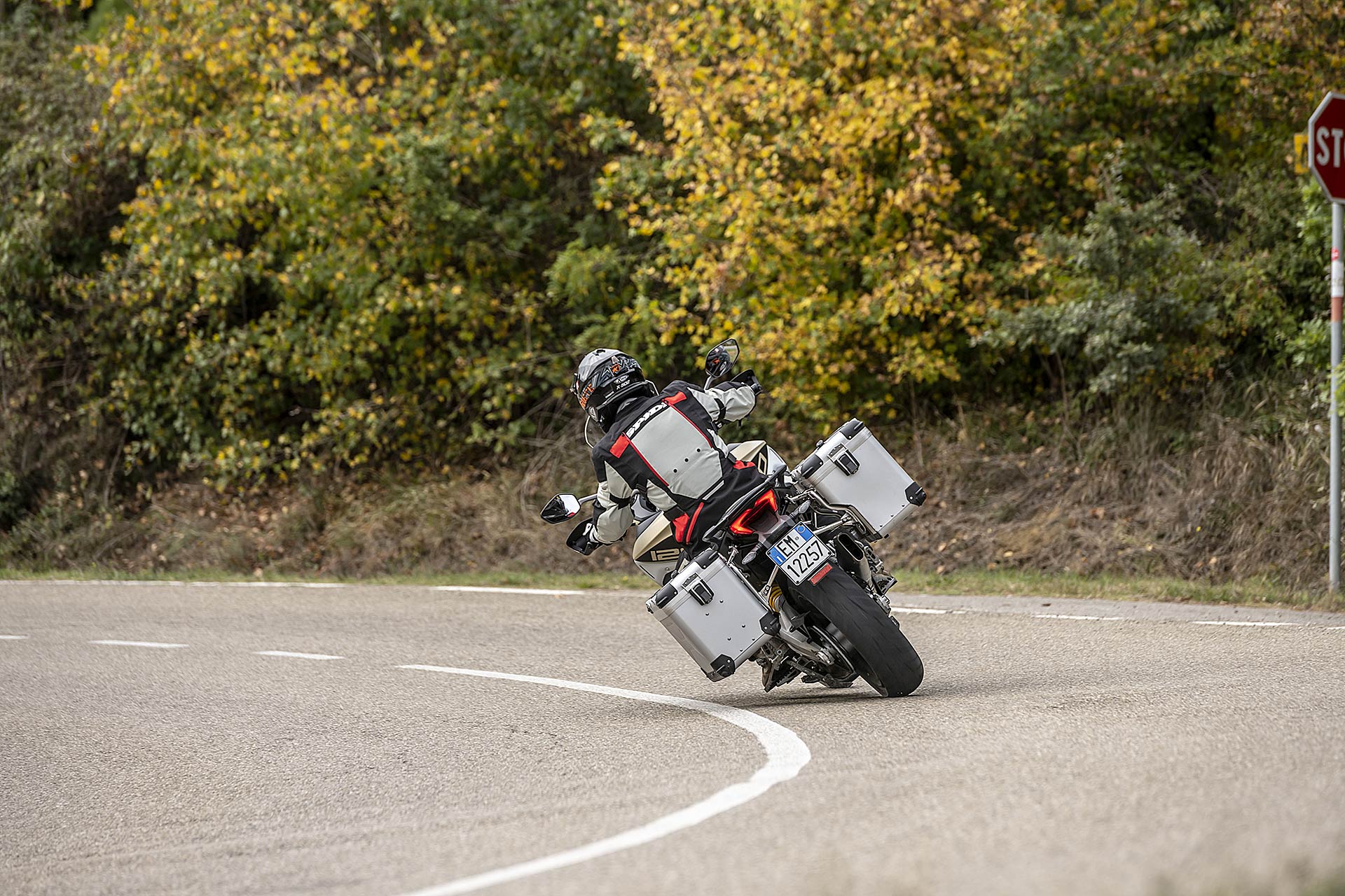 SPORTIVA NEL DNANon sembra di guidare una moto da turismo perché è facile da direzionare, da condurre dentro la curva anche con i freni in mano, grazie alla risposta dei due dischi anteriori da 320 con pinze radiali, mai aggressiva. In questo l’elettronica di serie riveste un ruolo fondamentale, che tiene conto delle esigenze del viaggiatore, desideroso di sicurezza anche nelle peggiori condizioni meteo: merito del traction control e del moderno Cornering ABS sviluppato con Bosch. Quando la grana grossa e asciutta delle strade lontane dalle metropoli permette di “liberare” tutta la potenza i due dispositivi sono molto efficaci.Oltre i 3.000 giri e fino a 4.500 giri il bicilindrico Testastretta DVT offre il migliore potenziale, accompagnato da qualche vibrazione diffusa su sella e manubrio, anche se oltre i 6.000 giri si scatena il carattere più puro e sportivo, supportato da un quick shifter veloce al punto giusto sia in salita che in scalata, che ricorda le carenate con i semi manubri di famiglia.