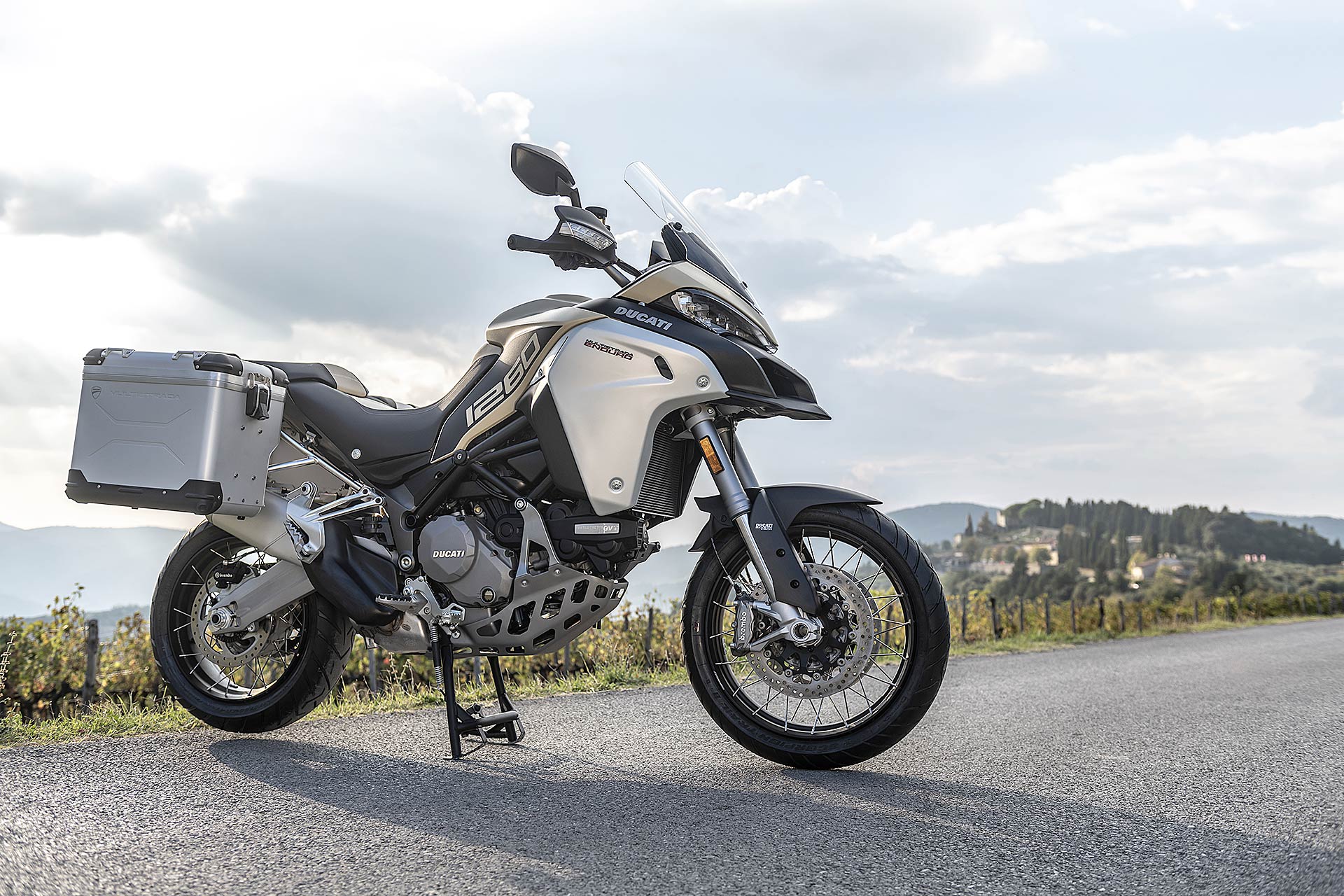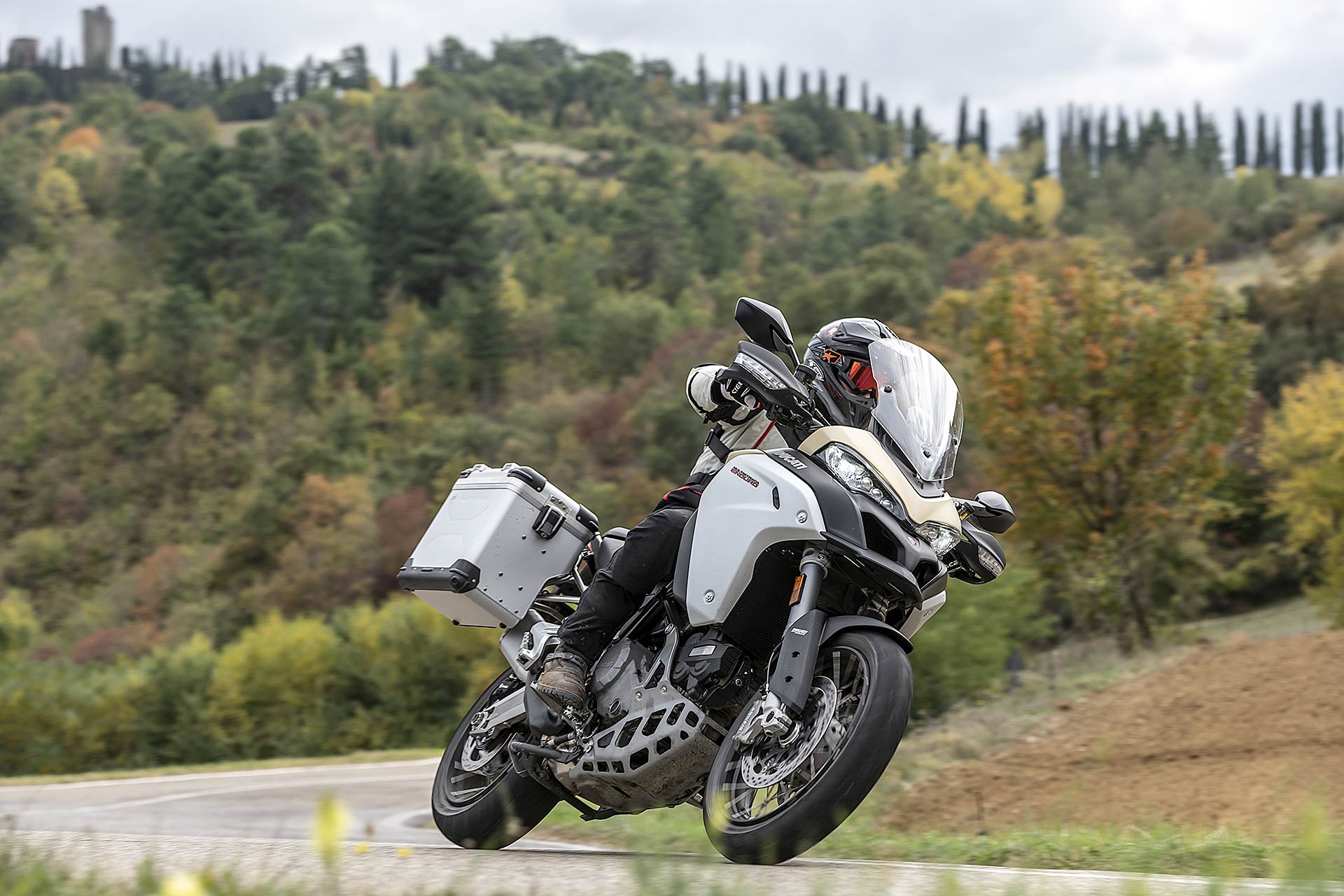 CICLISTICA EVOLUTAConfermato il telaio a traliccio in tubi d’acciaio che abbraccia il motore; l’angolo di sterzo non cambia ma è aumentata l’avancorsa di 1 mm a quota 112 mm, per rendere la Multistrada Enduro 1260 più stabile sul veloce e più fluida nella guida. Il forcellone è più leggero di 500 grammi; confermato lo schema classico delle maxi enduro stradali con ruota anteriore da 19 pollici e posteriore da 17 pollici, pneumatici Pirelli Scorpion Trail 2; doppio disco anteriore da 320 mm con pinze radiali M4.32 della Brembo e disco posteriore da 265 mm.ELETTRONICA DI SERIE Le prestazioni viaggiano a braccetto con l’ormai indispensabile ABS Cornering Bosch, la luci anteriori (Cornering Lights) che seguono la strada, oltre agli indispensabili controlli di trazione, anti impennamento e il Vehicle Hold Control che facilita le partenze in salita. Una gamma di accessori imprescindibile su moto di questa categoria.