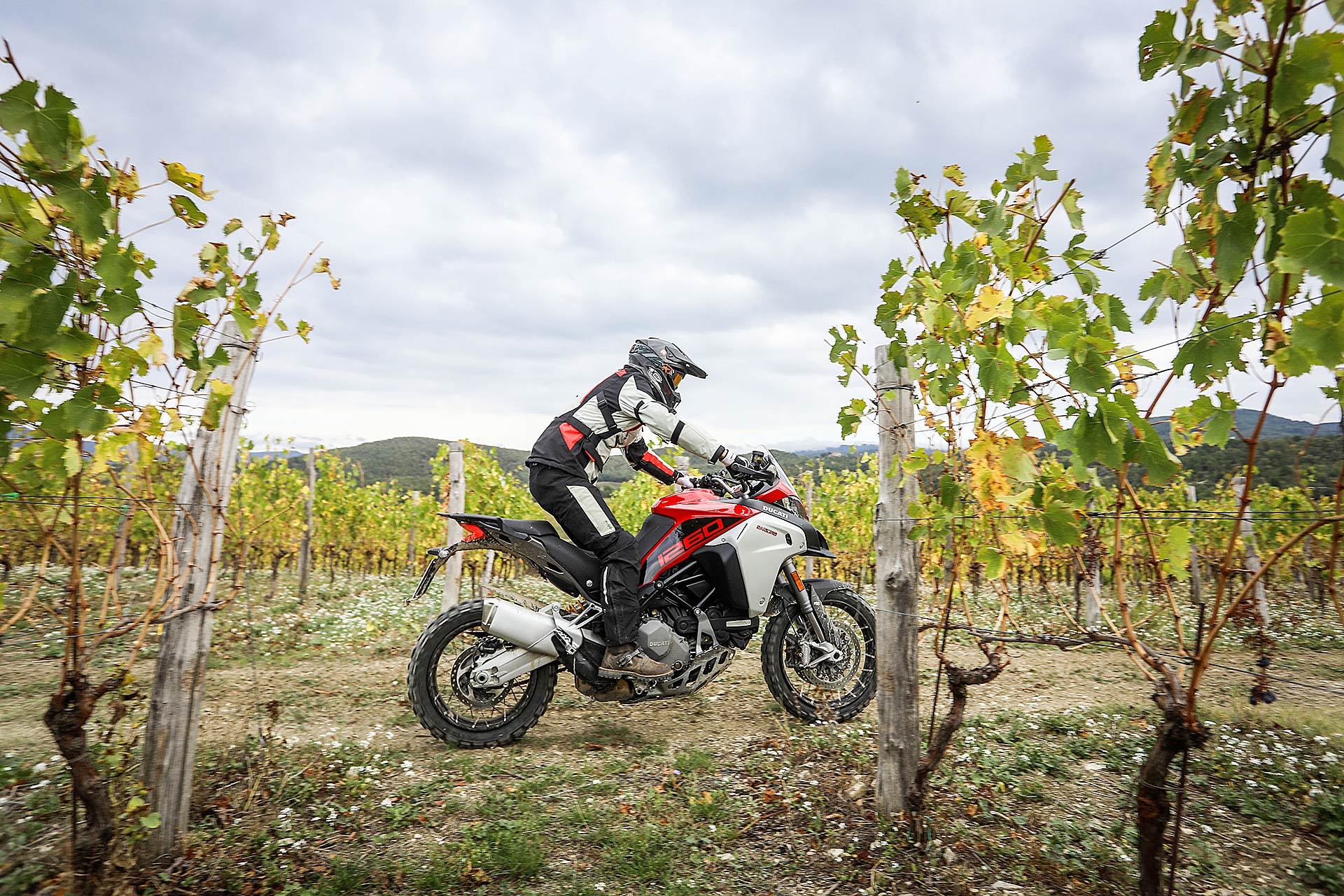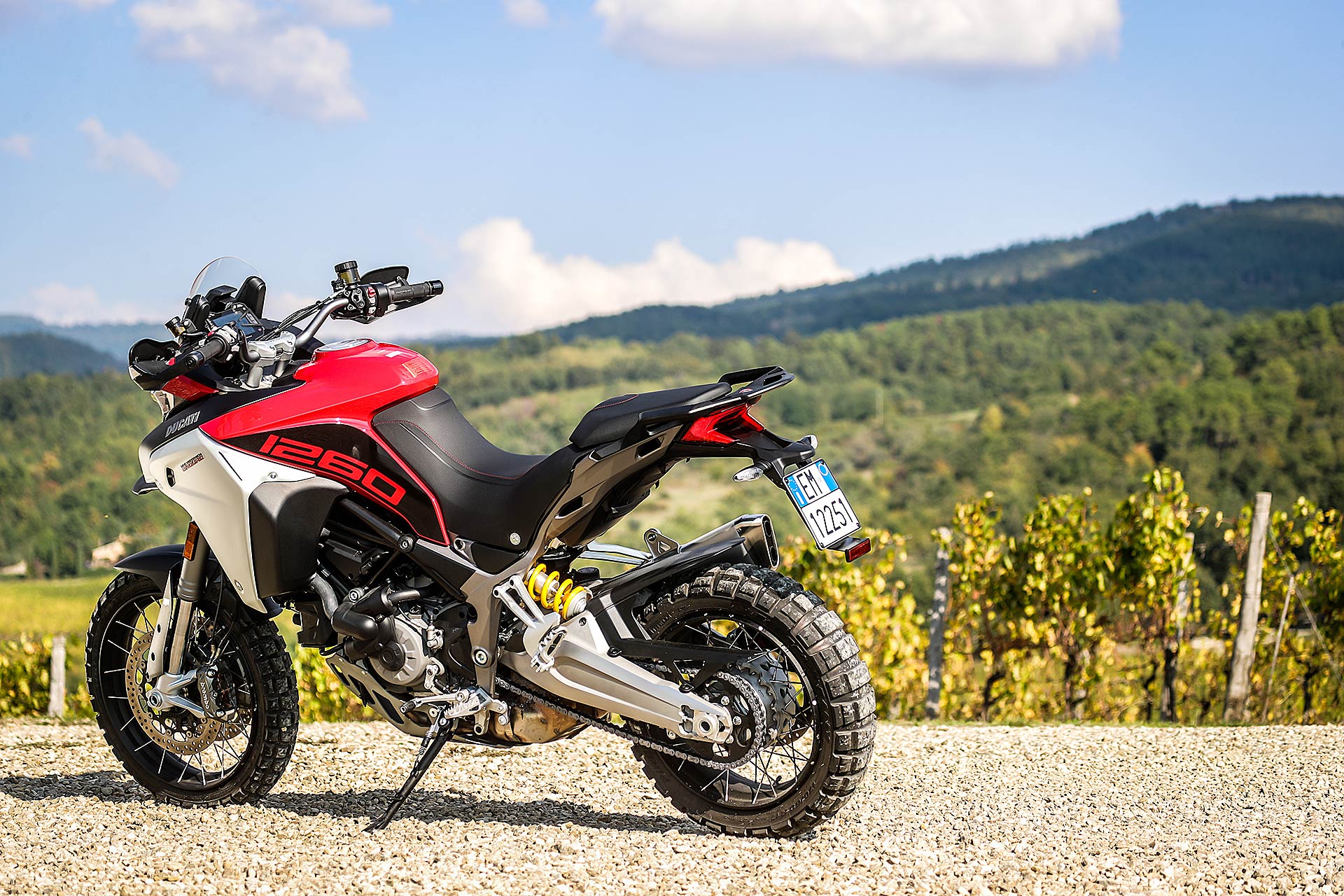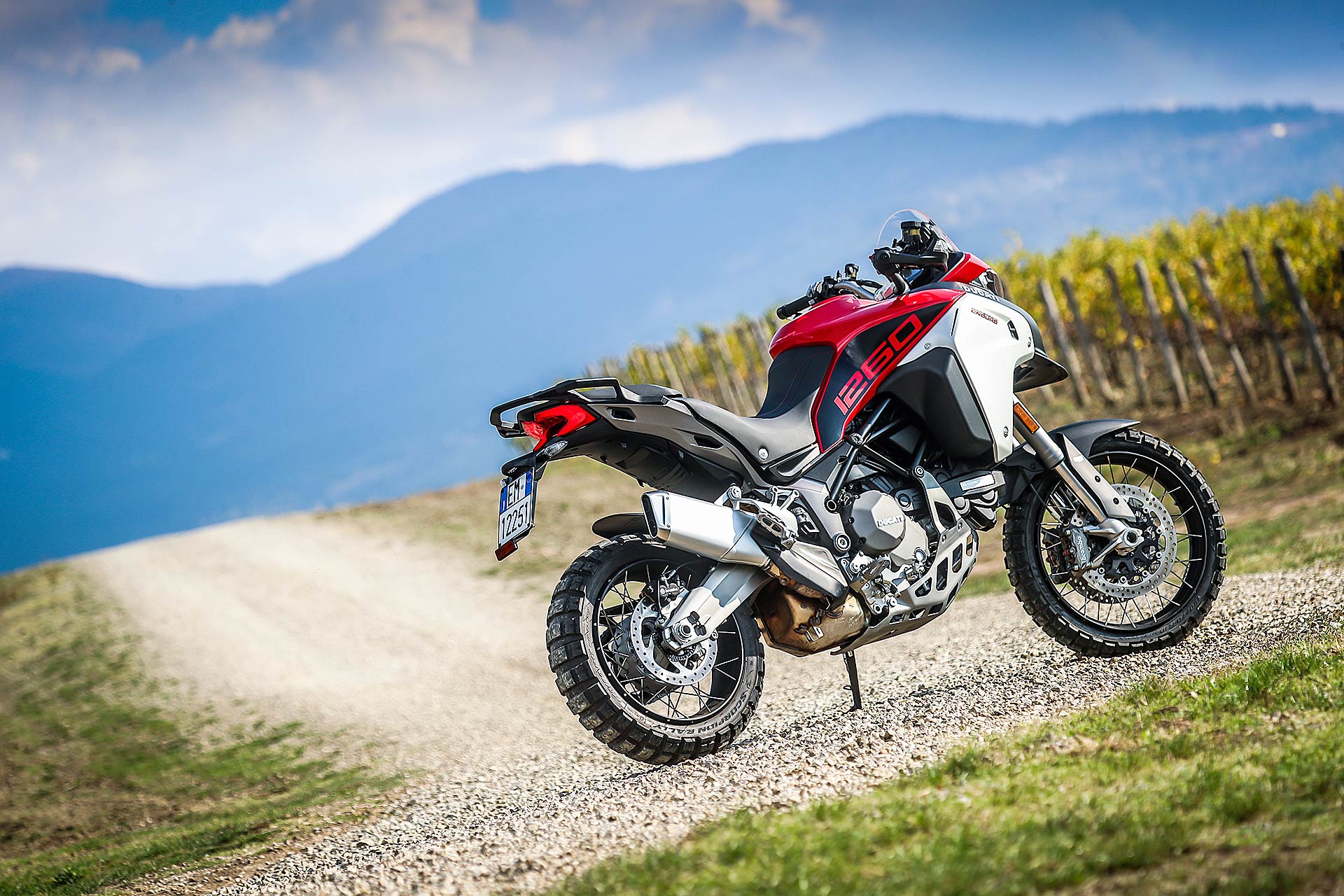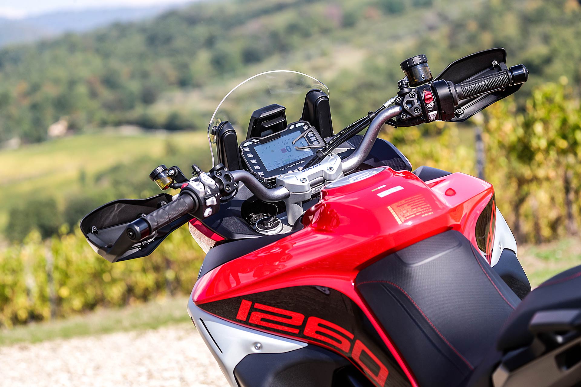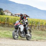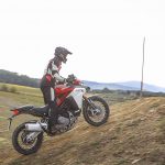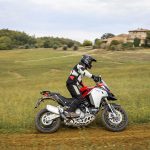La posizione di guida è più efficace delle aspettative perché la zona tra serbatoio e motore è molto snella, ti senti inserito nella moto e non adagiato su un piano troppo alto, che renderebbe anche le manovre ordinarie un problema e una complicazione in fuoristrada. Certo, osservare la Multistrada Enduro 1260 da ferma fa impressione soprattutto se si tiene sempre in primo piano il grande serbatoio e a mente il dato tecnico del peso di 230 kg.Partiamo con il motore sulla mappa Enduro con potenza a 100 cavalli e sospensioni regolate su guidatore e bagagli. I primi metri servono a prendere confidenza con i 30 litri del serbatoio, l’avantreno che è alto con la forcella sostenuta per affrontare gli ostacoli e le gomme tassellate. La posizione in piedi sulle pedane è correttamente angolata con la linea e l’altezza del manubrio, che per gusto personale avrei preferito leggermente più alta.FINE DELL’ASFALTO: DIVERTIMENTODucati Multistrada Enduro 1260 si fa spazio anche nei sentieri più stretti con una facilità inaspettata. Ha un avantreno solido e piuttosto preciso, passa sopra gli ostacoli e anche se non ha la ruota da 21” – perfect size per l’enduro professionale – non scarta alla prima difficoltà e non prende sotto. In supporto c’è un motore dal buon carattere: morbido e sufficientemente pronto sotto dove, grazie alla coppia più che ai cavalli, con un filo di gas si ha sempre la giusta spinta anche con poco grip. Il tutto aiutato dalla prima marcia e dalla trasmissione finale più corti.