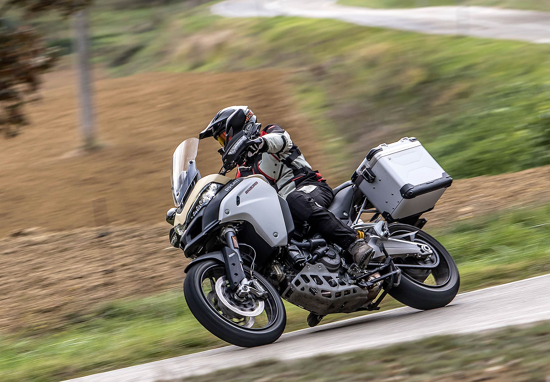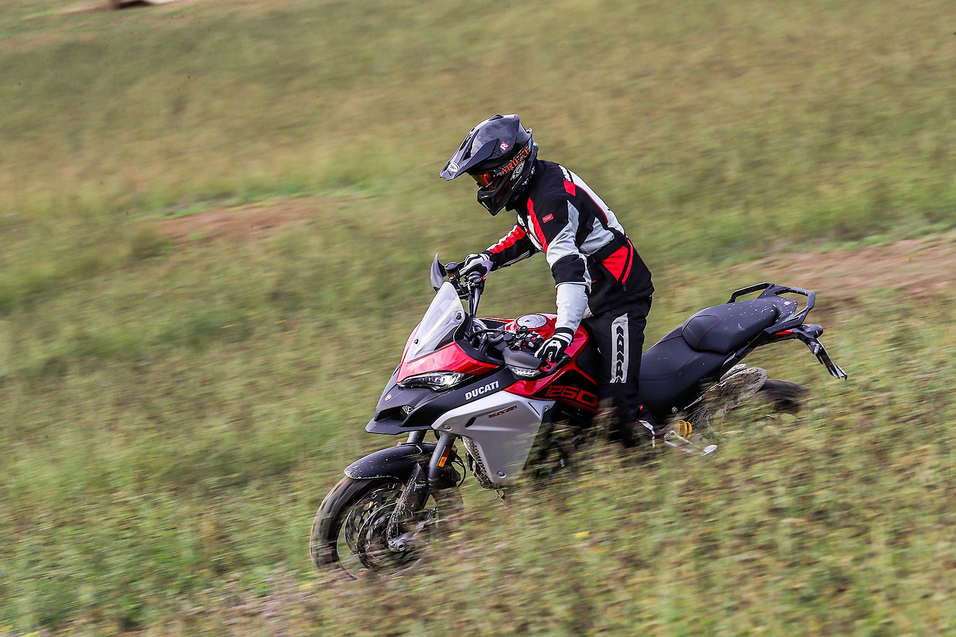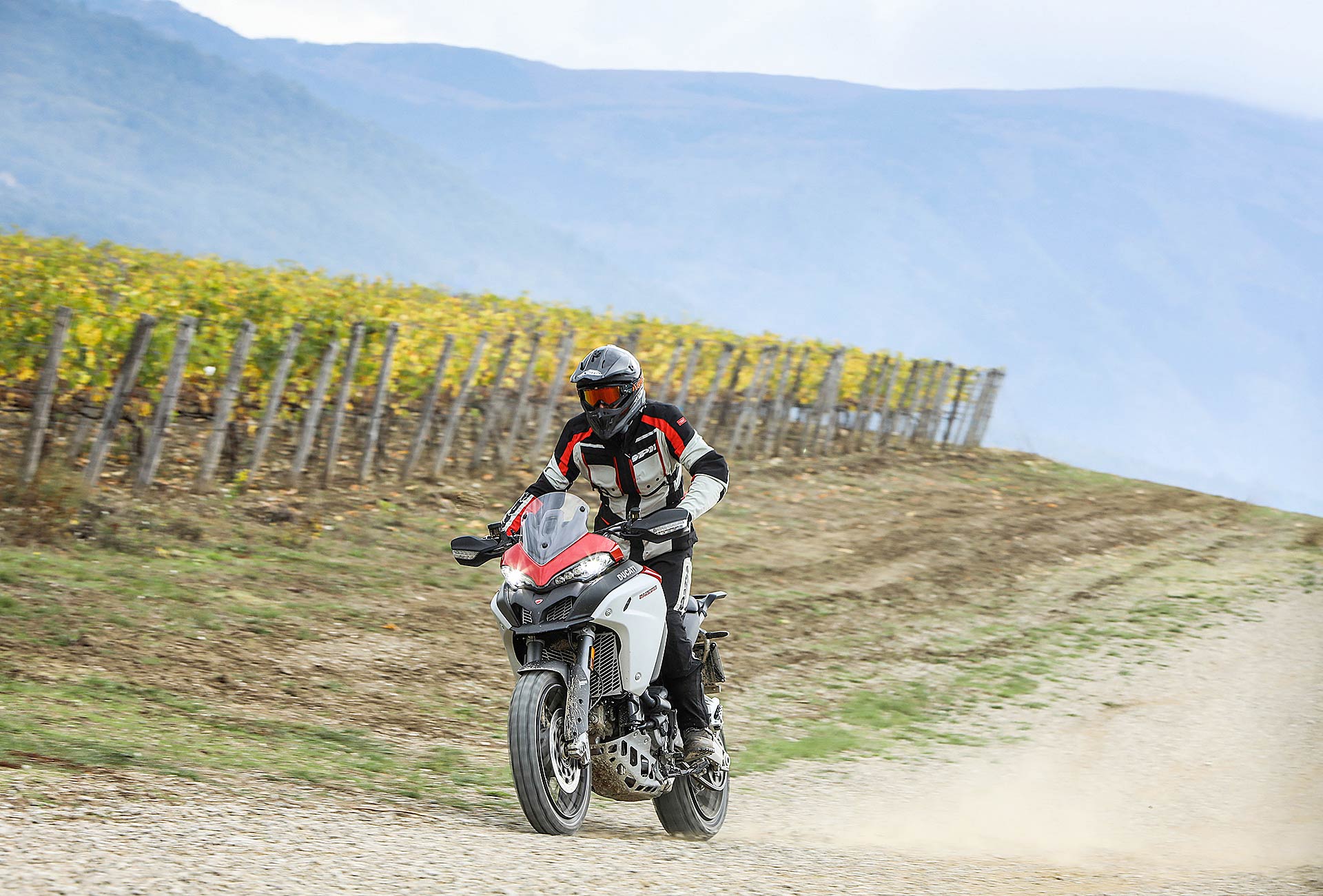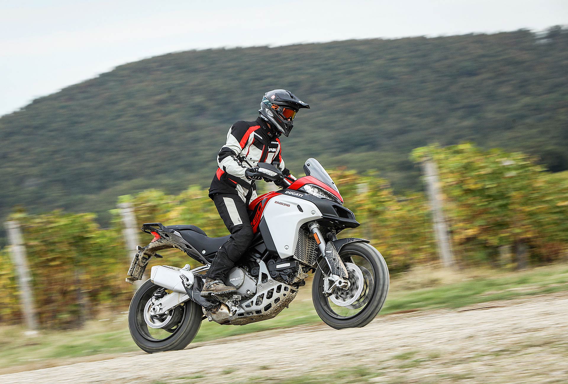 La posizione di guida è più efficace delle aspettative perché la zona tra serbatoio e motore è molto snella, ti senti inserito nella moto e non adagiato su un piano troppo alto, che renderebbe anche le manovre ordinarie un problema e una complicazione in fuoristrada. Certo, osservare la Multistrada Enduro 1260 da ferma fa impressione soprattutto se si tiene sempre in primo piano il grande serbatoio e a mente il dato tecnico del peso di 230 kg.Partiamo con il motore sulla mappa Enduro con potenza a 100 cavalli e sospensioni regolate su guidatore e bagagli. I primi metri servono a prendere confidenza con i 30 litri del serbatoio, l’avantreno che è alto con la forcella sostenuta per affrontare gli ostacoli e le gomme tassellate. La posizione in piedi sulle pedane è correttamente angolata con la linea e l’altezza del manubrio, che per gusto personale avrei preferito leggermente più alta.FINE DELL’ASFALTO: DIVERTIMENTODucati Multistrada Enduro 1260 si fa spazio anche nei sentieri più stretti con una facilità inaspettata. Ha un avantreno solido e piuttosto preciso, passa sopra gli ostacoli e anche se non ha la ruota da 21” – perfect size per l’enduro professionale – non scarta alla prima difficoltà e non prende sotto. In supporto c’è un motore dal buon carattere: morbido e sufficientemente pronto sotto dove, grazie alla coppia più che ai cavalli, con un filo di gas si ha sempre la giusta spinta anche con poco grip. Il tutto aiutato dalla prima marcia e dalla trasmissione finale più corti.