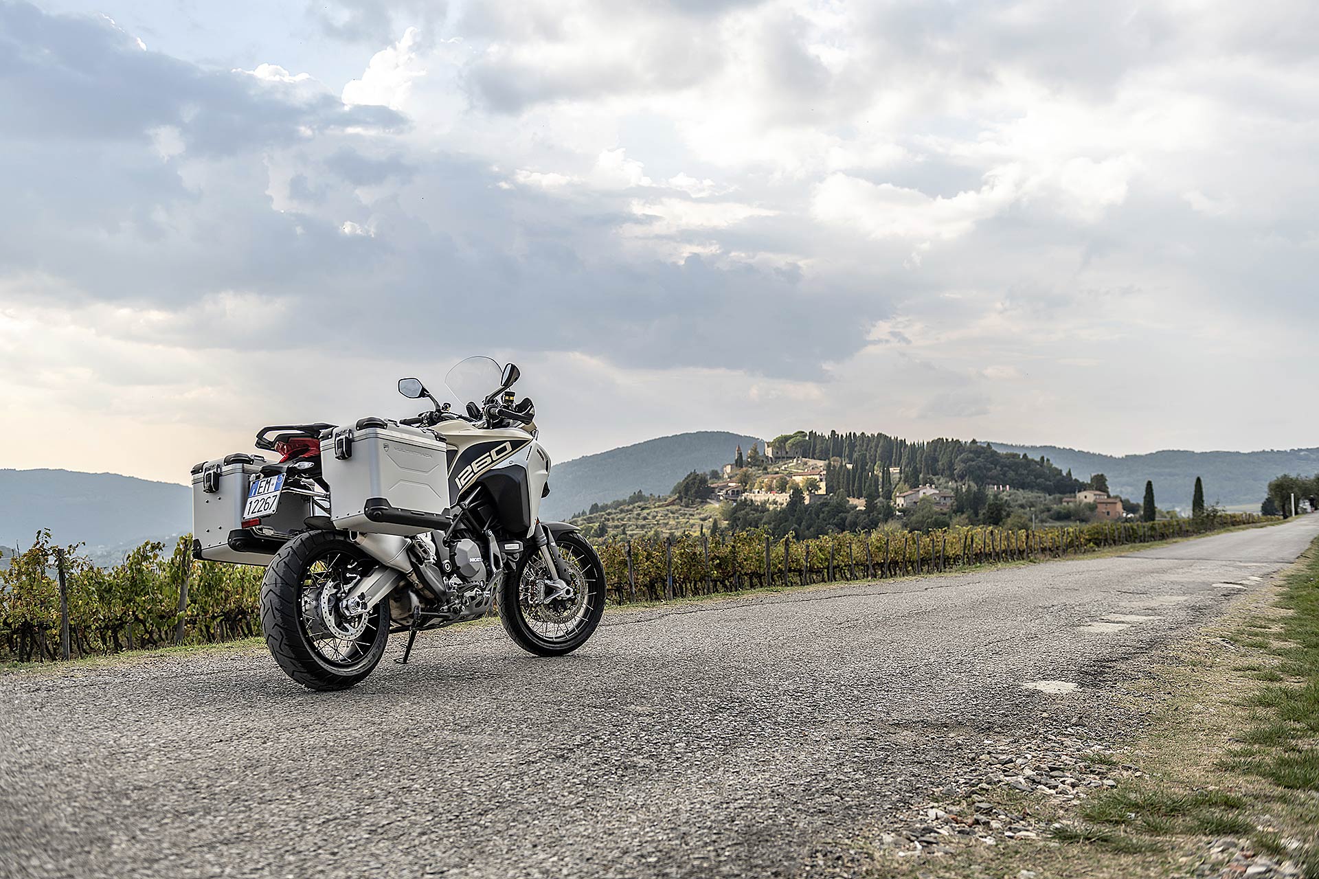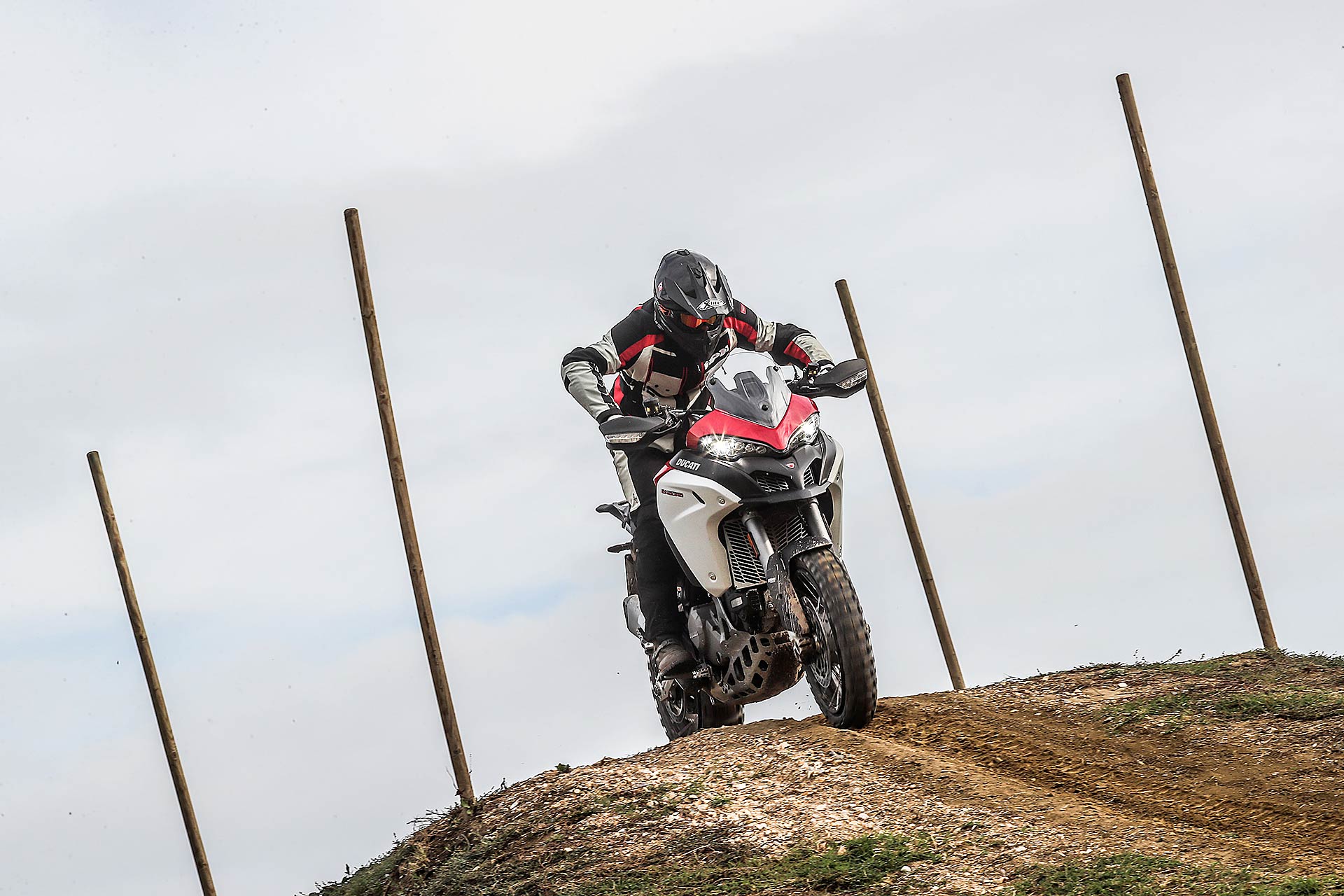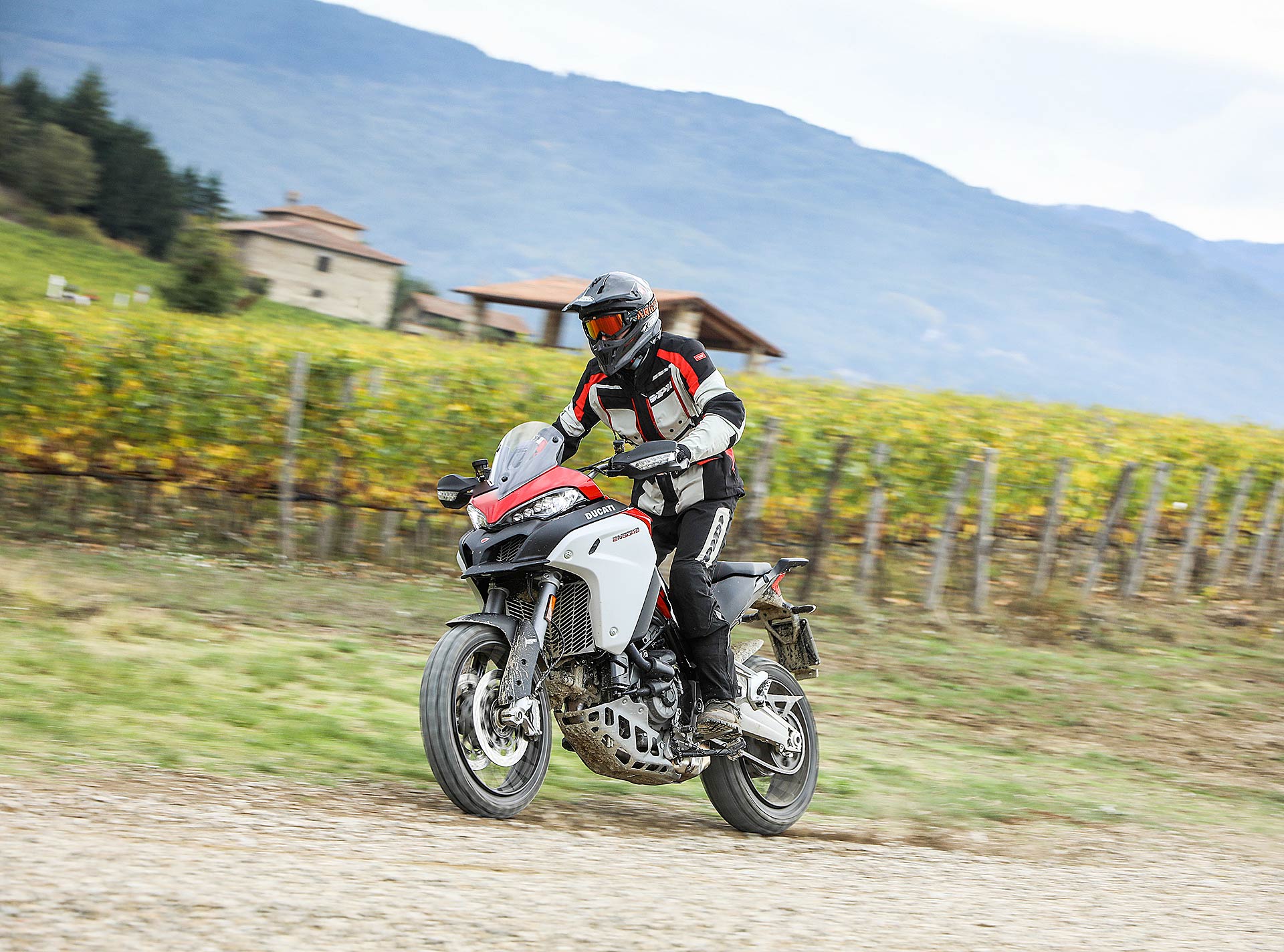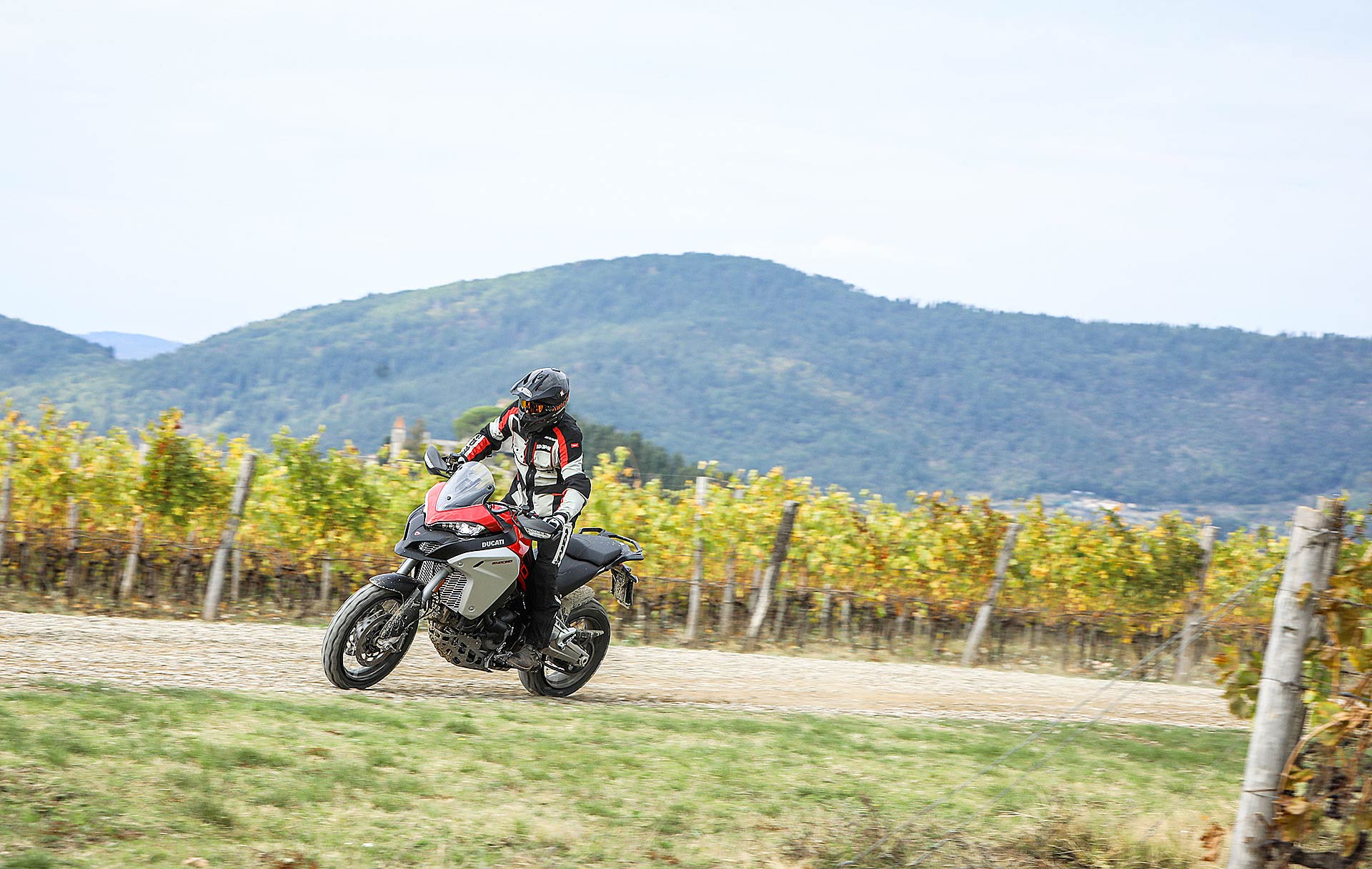 La posizione di guida è più efficace delle aspettative perché la zona tra serbatoio e motore è molto snella, ti senti inserito nella moto e non adagiato su un piano troppo alto, che renderebbe anche le manovre ordinarie un problema e una complicazione in fuoristrada. Certo, osservare la Multistrada Enduro 1260 da ferma fa impressione soprattutto se si tiene sempre in primo piano il grande serbatoio e a mente il dato tecnico del peso di 230 kg.Partiamo con il motore sulla mappa Enduro con potenza a 100 cavalli e sospensioni regolate su guidatore e bagagli. I primi metri servono a prendere confidenza con i 30 litri del serbatoio, l’avantreno che è alto con la forcella sostenuta per affrontare gli ostacoli e le gomme tassellate. La posizione in piedi sulle pedane è correttamente angolata con la linea e l’altezza del manubrio, che per gusto personale avrei preferito leggermente più alta.FINE DELL’ASFALTO: DIVERTIMENTODucati Multistrada Enduro 1260 si fa spazio anche nei sentieri più stretti con una facilità inaspettata. Ha un avantreno solido e piuttosto preciso, passa sopra gli ostacoli e anche se non ha la ruota da 21” – perfect size per l’enduro professionale – non scarta alla prima difficoltà e non prende sotto. In supporto c’è un motore dal buon carattere: morbido e sufficientemente pronto sotto dove, grazie alla coppia più che ai cavalli, con un filo di gas si ha sempre la giusta spinta anche con poco grip. Il tutto aiutato dalla prima marcia e dalla trasmissione finale più corti.