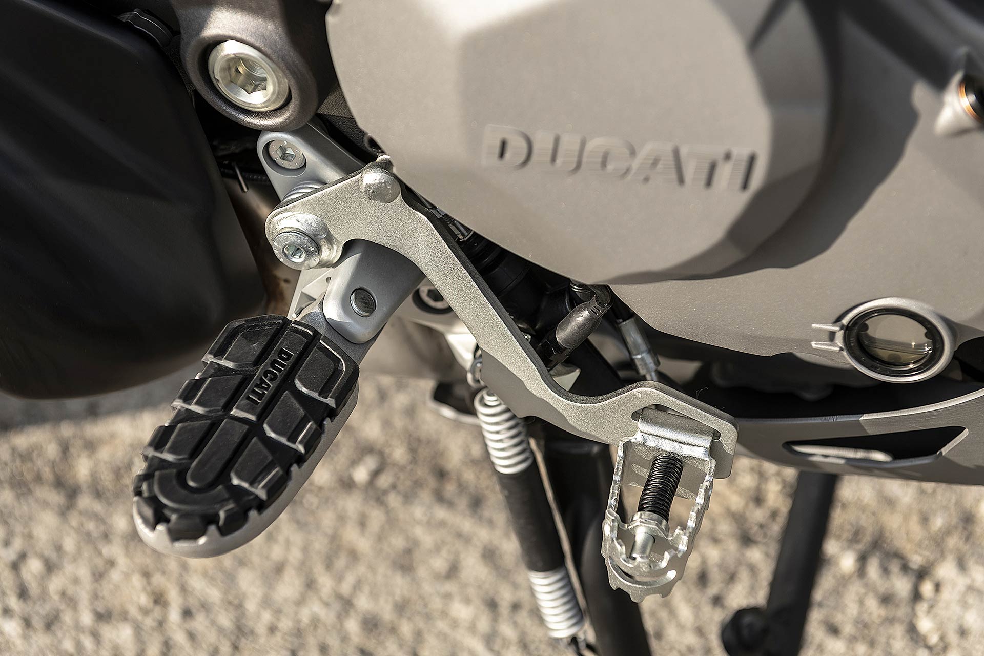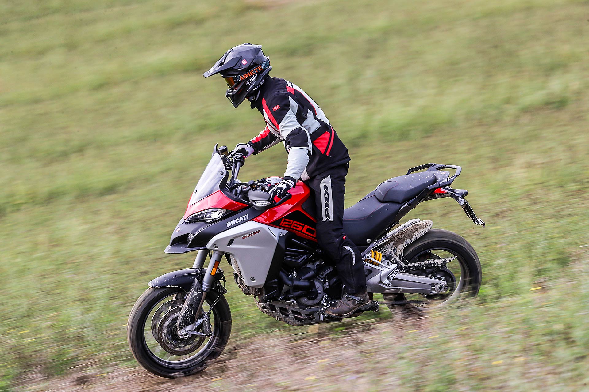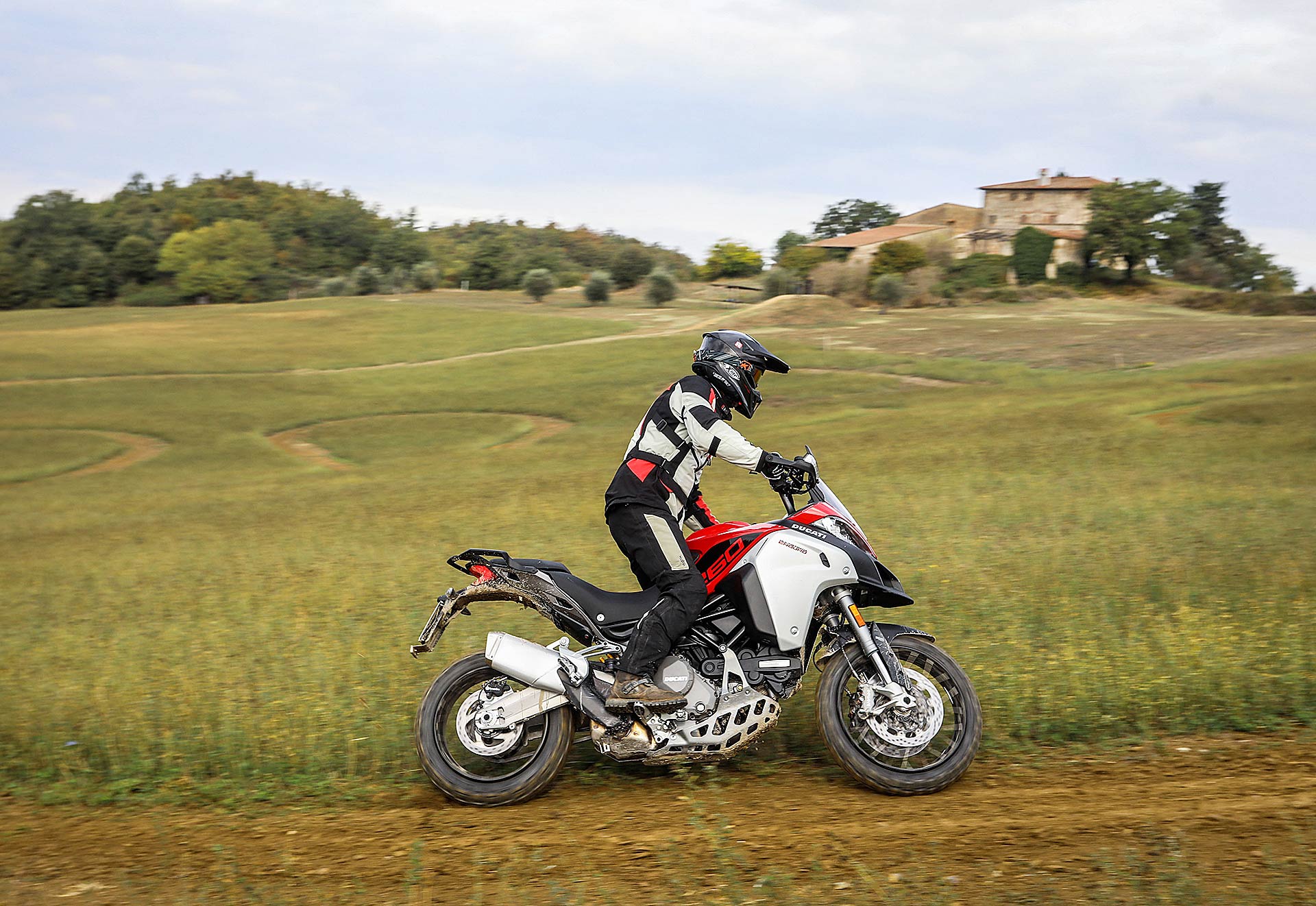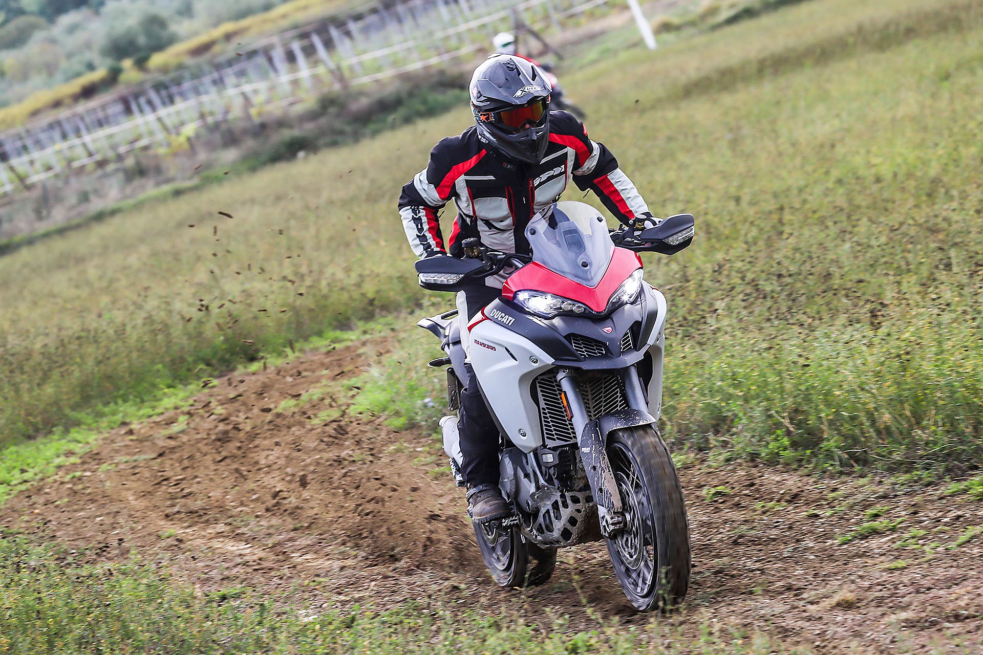 La posizione di guida è più efficace delle aspettative perché la zona tra serbatoio e motore è molto snella, ti senti inserito nella moto e non adagiato su un piano troppo alto, che renderebbe anche le manovre ordinarie un problema e una complicazione in fuoristrada. Certo, osservare la Multistrada Enduro 1260 da ferma fa impressione soprattutto se si tiene sempre in primo piano il grande serbatoio e a mente il dato tecnico del peso di 230 kg.Partiamo con il motore sulla mappa Enduro con potenza a 100 cavalli e sospensioni regolate su guidatore e bagagli. I primi metri servono a prendere confidenza con i 30 litri del serbatoio, l’avantreno che è alto con la forcella sostenuta per affrontare gli ostacoli e le gomme tassellate. La posizione in piedi sulle pedane è correttamente angolata con la linea e l’altezza del manubrio, che per gusto personale avrei preferito leggermente più alta.FINE DELL’ASFALTO: DIVERTIMENTODucati Multistrada Enduro 1260 si fa spazio anche nei sentieri più stretti con una facilità inaspettata. Ha un avantreno solido e piuttosto preciso, passa sopra gli ostacoli e anche se non ha la ruota da 21” – perfect size per l’enduro professionale – non scarta alla prima difficoltà e non prende sotto. In supporto c’è un motore dal buon carattere: morbido e sufficientemente pronto sotto dove, grazie alla coppia più che ai cavalli, con un filo di gas si ha sempre la giusta spinta anche con poco grip. Il tutto aiutato dalla prima marcia e dalla trasmissione finale più corti.