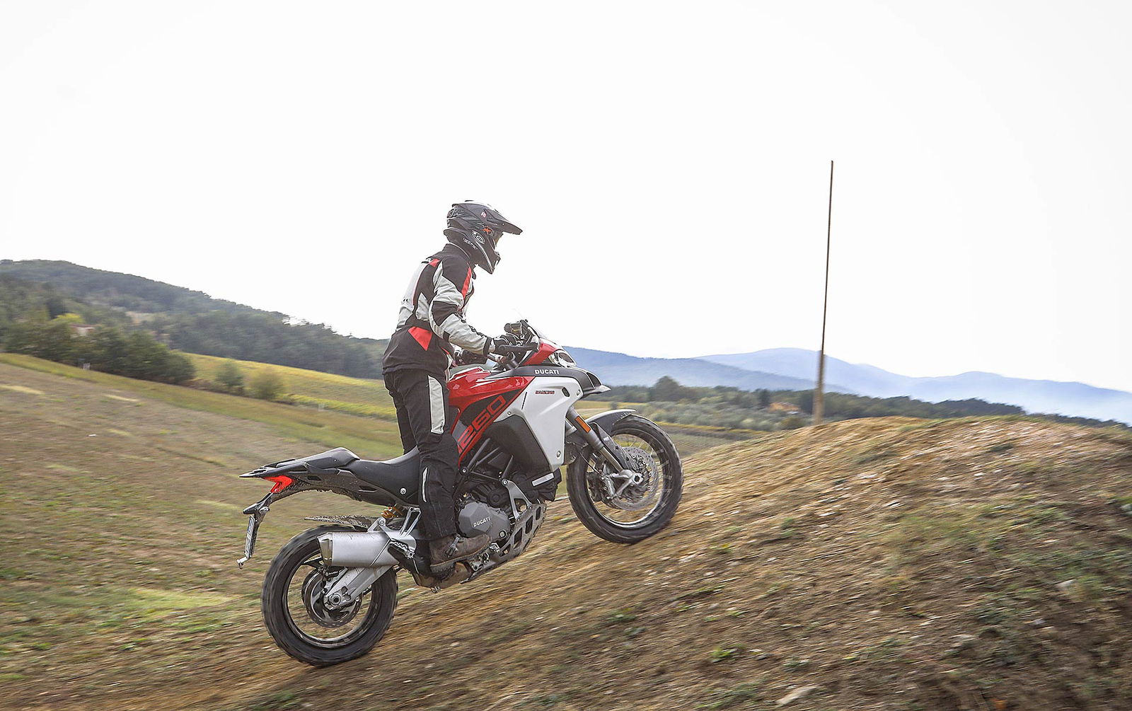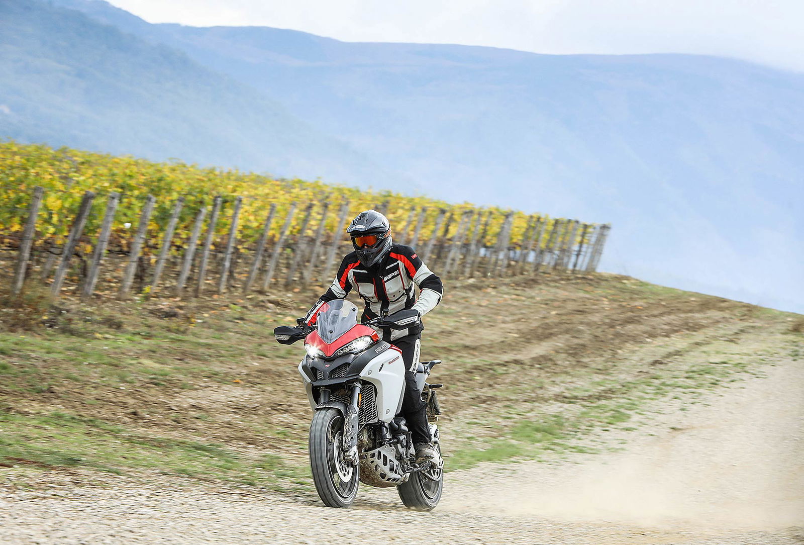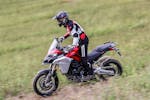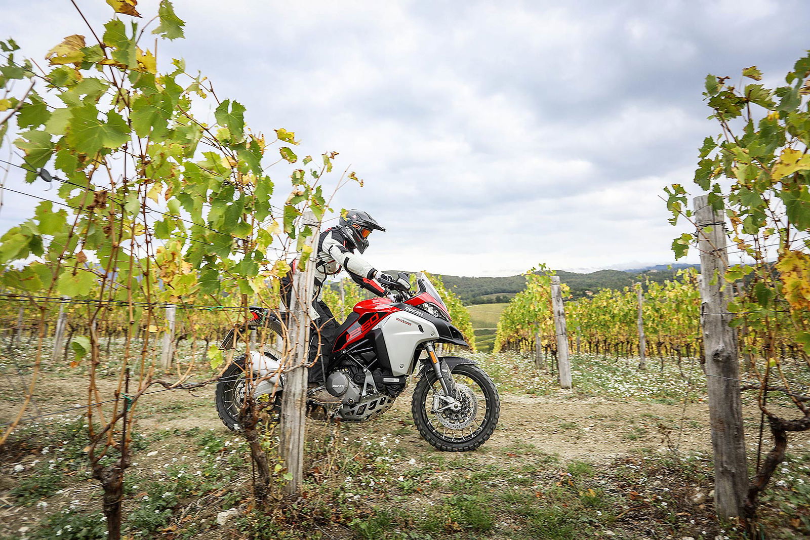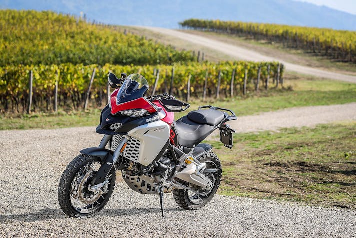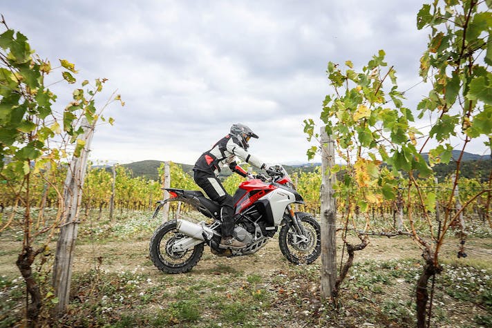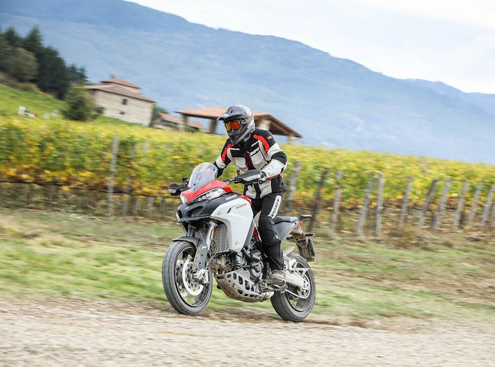 La posizione di guida è più efficace delle aspettative perché la zona tra serbatoio e motore è molto snella, ti senti inserito nella moto e non adagiato su un piano troppo alto, che renderebbe anche le manovre ordinarie un problema e una complicazione in fuoristrada. Certo, osservare la Multistrada Enduro 1260 da ferma fa impressione soprattutto se si tiene sempre in primo piano il grande serbatoio e a mente il dato tecnico del peso di 230 kg.Partiamo con il motore sulla mappa Enduro con potenza a 100 cavalli e sospensioni regolate su guidatore e bagagli. I primi metri servono a prendere confidenza con i 30 litri del serbatoio, l’avantreno che è alto con la forcella sostenuta per affrontare gli ostacoli e le gomme tassellate. La posizione in piedi sulle pedane è correttamente angolata con la linea e l’altezza del manubrio, che per gusto personale avrei preferito leggermente più alta.FINE DELL’ASFALTO: DIVERTIMENTODucati Multistrada Enduro 1260 si fa spazio anche nei sentieri più stretti con una facilità inaspettata. Ha un avantreno solido e piuttosto preciso, passa sopra gli ostacoli e anche se non ha la ruota da 21” – perfect size per l’enduro professionale – non scarta alla prima difficoltà e non prende sotto. In supporto c’è un motore dal buon carattere: morbido e sufficientemente pronto sotto dove, grazie alla coppia più che ai cavalli, con un filo di gas si ha sempre la giusta spinta anche con poco grip. Il tutto aiutato dalla prima marcia e dalla trasmissione finale più corti.