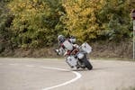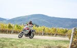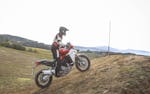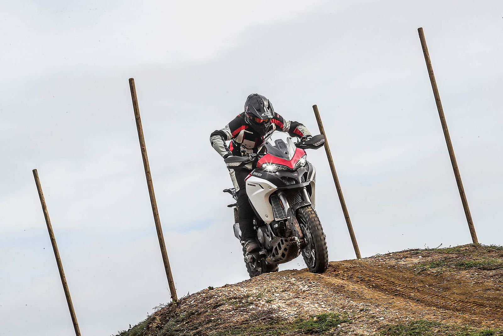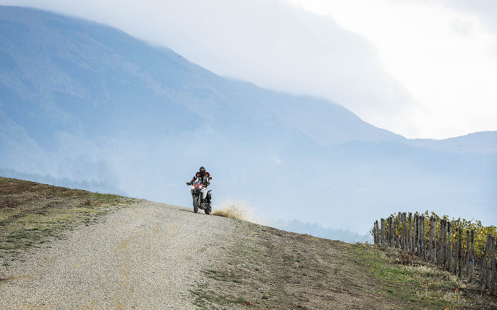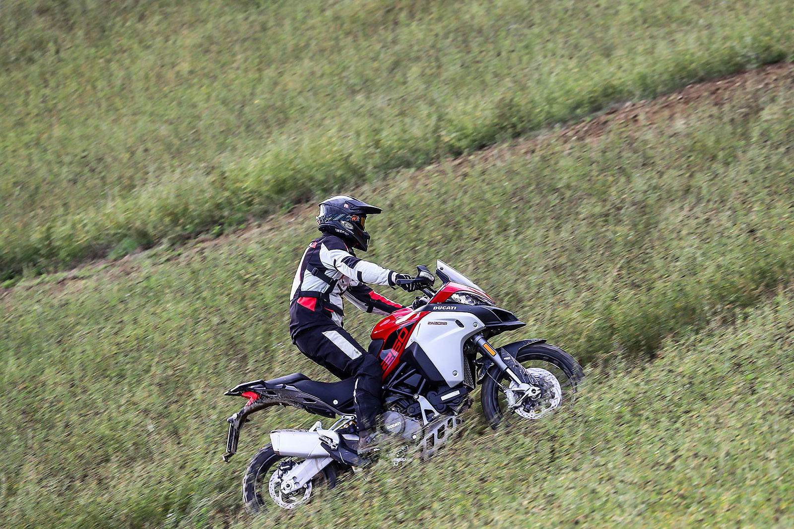 La posizione di guida è più efficace delle aspettative perché la zona tra serbatoio e motore è molto snella, ti senti inserito nella moto e non adagiato su un piano troppo alto, che renderebbe anche le manovre ordinarie un problema e una complicazione in fuoristrada. Certo, osservare la Multistrada Enduro 1260 da ferma fa impressione soprattutto se si tiene sempre in primo piano il grande serbatoio e a mente il dato tecnico del peso di 230 kg.Partiamo con il motore sulla mappa Enduro con potenza a 100 cavalli e sospensioni regolate su guidatore e bagagli. I primi metri servono a prendere confidenza con i 30 litri del serbatoio, l’avantreno che è alto con la forcella sostenuta per affrontare gli ostacoli e le gomme tassellate. La posizione in piedi sulle pedane è correttamente angolata con la linea e l’altezza del manubrio, che per gusto personale avrei preferito leggermente più alta.FINE DELL’ASFALTO: DIVERTIMENTODucati Multistrada Enduro 1260 si fa spazio anche nei sentieri più stretti con una facilità inaspettata. Ha un avantreno solido e piuttosto preciso, passa sopra gli ostacoli e anche se non ha la ruota da 21” – perfect size per l’enduro professionale – non scarta alla prima difficoltà e non prende sotto. In supporto c’è un motore dal buon carattere: morbido e sufficientemente pronto sotto dove, grazie alla coppia più che ai cavalli, con un filo di gas si ha sempre la giusta spinta anche con poco grip. Il tutto aiutato dalla prima marcia e dalla trasmissione finale più corti.