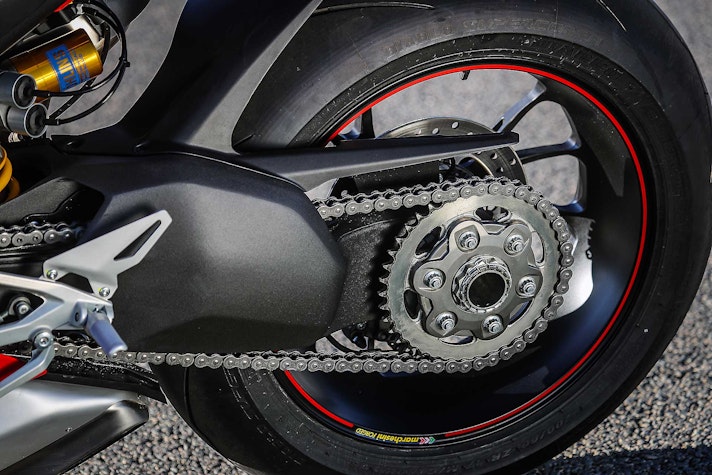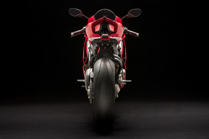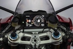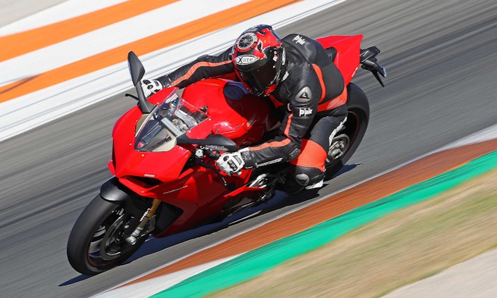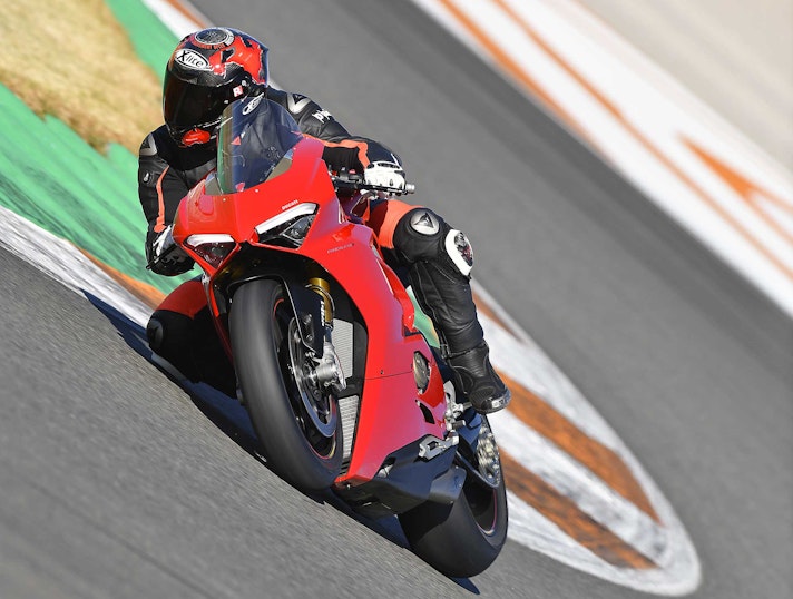 Tornando alla ciclistica, inserimento in curva a parte, mi ha colpito la precisione che ha la Panigale V4 nel descrivere perfettamente quel che accade sotto la ruota posteriore. Senti tutto, percepisci che quando apri il gas la V4 “spinge” davvero forte sul Supercorsa SP da 200/60 (unica gomma omologata per questo modello, garante di grip e maneggevolezza da pneumatico in mescola) e ogni minimo “slide” arriva dritto al fondoschiena. Quello che su altre moto giunge un po’ ovattato, in questo caso arriva secco, preciso, netto. Questo, se la pista è levigata come Valencia, dopo un po’ fa venir voglia di giocare con le perdite di aderenza. Non ho mai apprezzato questo genere di sensazioni: mi piacciono le gomme belle attaccate a terra, e di certo non vado a cercare il power steering, ma in questo caso il controllo che hai nel polso destro e l’aiuto dell’elettronica portano questa fase della guida a un altro livello.DUCATI PERFORMANCE PER STUPIRE DAVVEROSe si vuol capire di cosa è capace la Panigale V4 occorre provare per bene la versione Ducati Performance con scarico Akrapovic e mappatura. Libero dai vincoli dell’omologazione, il motore spinge furioso, (280 km/h GPS in quinta in fondo al rettilineo di Valencia), allunga con maggiore convinzione e sposta l’inizio del calo di potenza ancora più vicino alla zona rossa. Così configurata la Panigale V4 va veramente fortissimo ma paradossalmente la gestione del gas è ancora più “amichevole” (tenete sempre presente con che potenze stiamo giocando…) rispetto a quando si utilizza la mappa Race sulla versione omologata. Mappature meno anoressiche aiutano, infatti, la morbidezza di gestione, e se di supporto hai un paio di Slick SC1 ecco che capisci dove si può arrivare, senza stravolgere nulla. Qualche click alle sospensioni, 12 cv in più e 7 kg in meno. Tradotto significa quasi 2 secondi al giro rispetto alla Panigale di serie – comunque velocissima, soprattutto pensando alle Supercorsa SP di primo equipaggiamento -, ma con la sensazione, certificata dallo sconvolgente onboard di Valia che ha lasciato tutti a bocca aperta, che avendo a disposizione più dell’unico turno che ci è stato concesso si possa andare molto più forte.CONCLUSIONIQual è la conclusione dopo 70 minuti di guida? Le aspettative sono state rispettate? Secondo me sì. Uscire a testa alta da un circuito in cui stai più piegato che dritto con una moto da 200 e passa cavalli non è cosa da poco. Non si può dire che sia “facile”, come del resto non è nessuna moto da oltre 200 cv quando si vuole guidare veramente forte. Di certo il modo in cui scodella le prestazioni è da definire invidiabile.Come ho detto più sopra, trovo sia molto difficile ai giorni nostri scavare solchi troppo profondi rispetto alla concorrenza: saranno le comparative a dimostrare se e quanto le prestazioni di questa nuova V4 saranno o meno superiori. Quello che è certo è che il cambio filosofico attuato in casa Ducati su questa moto è evidente e potrà essere molto fastidioso per i concorrenti. La Panigale V4 ha tutte le carte in regola, non solo (ovviamente) per piacere ai Ducatisti, ma anche per attrarre chi fino a oggi non ha mai pensato di cavalcare una moto di Borgo Panigale. E questa, per gli altri, potrebbe essere una bella gatta da pelare.