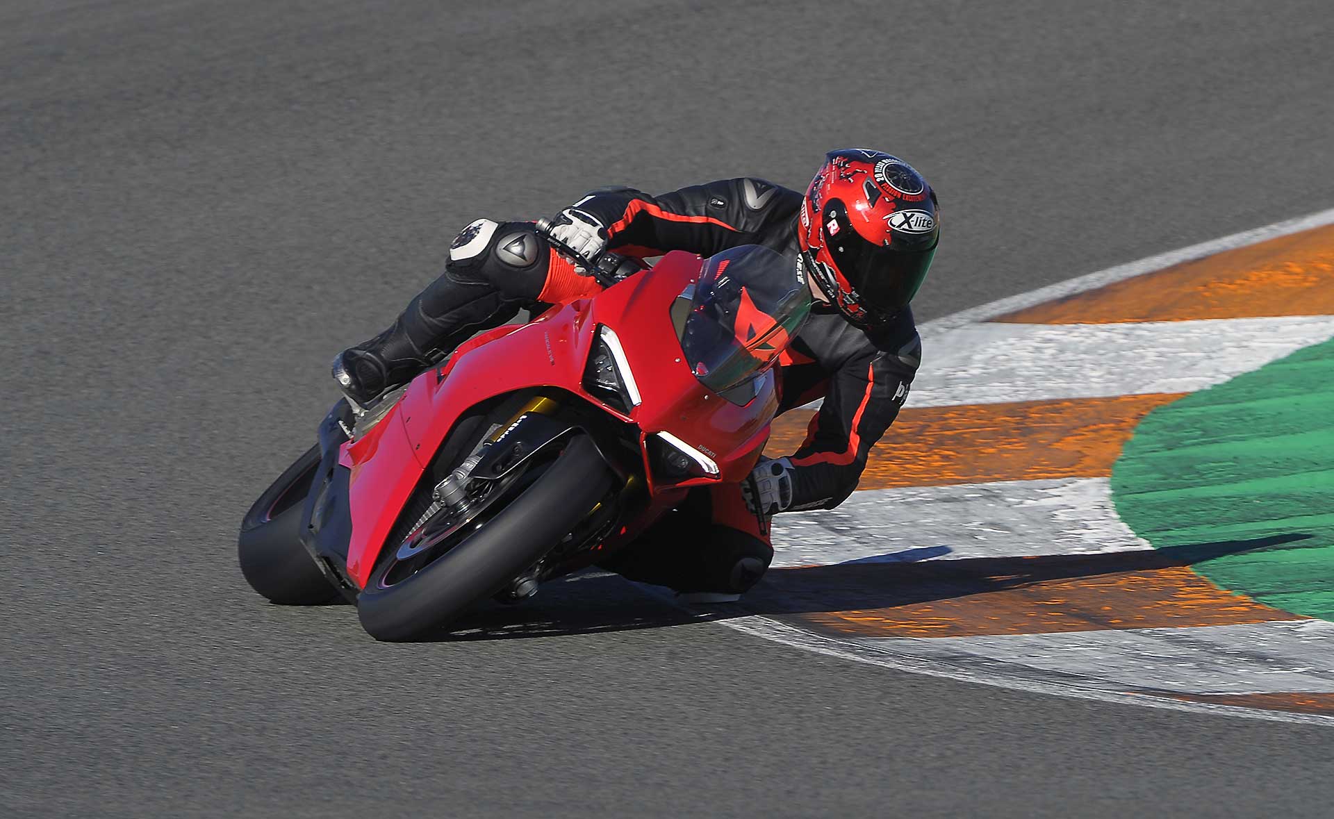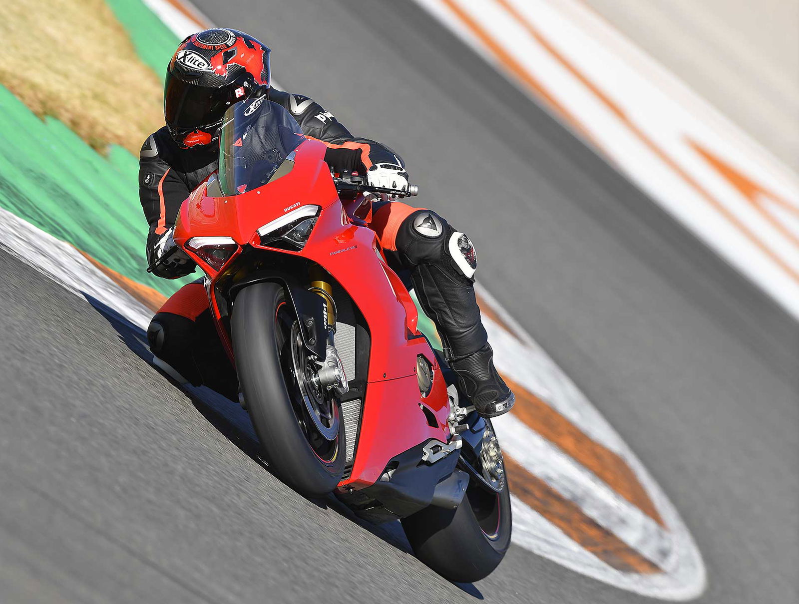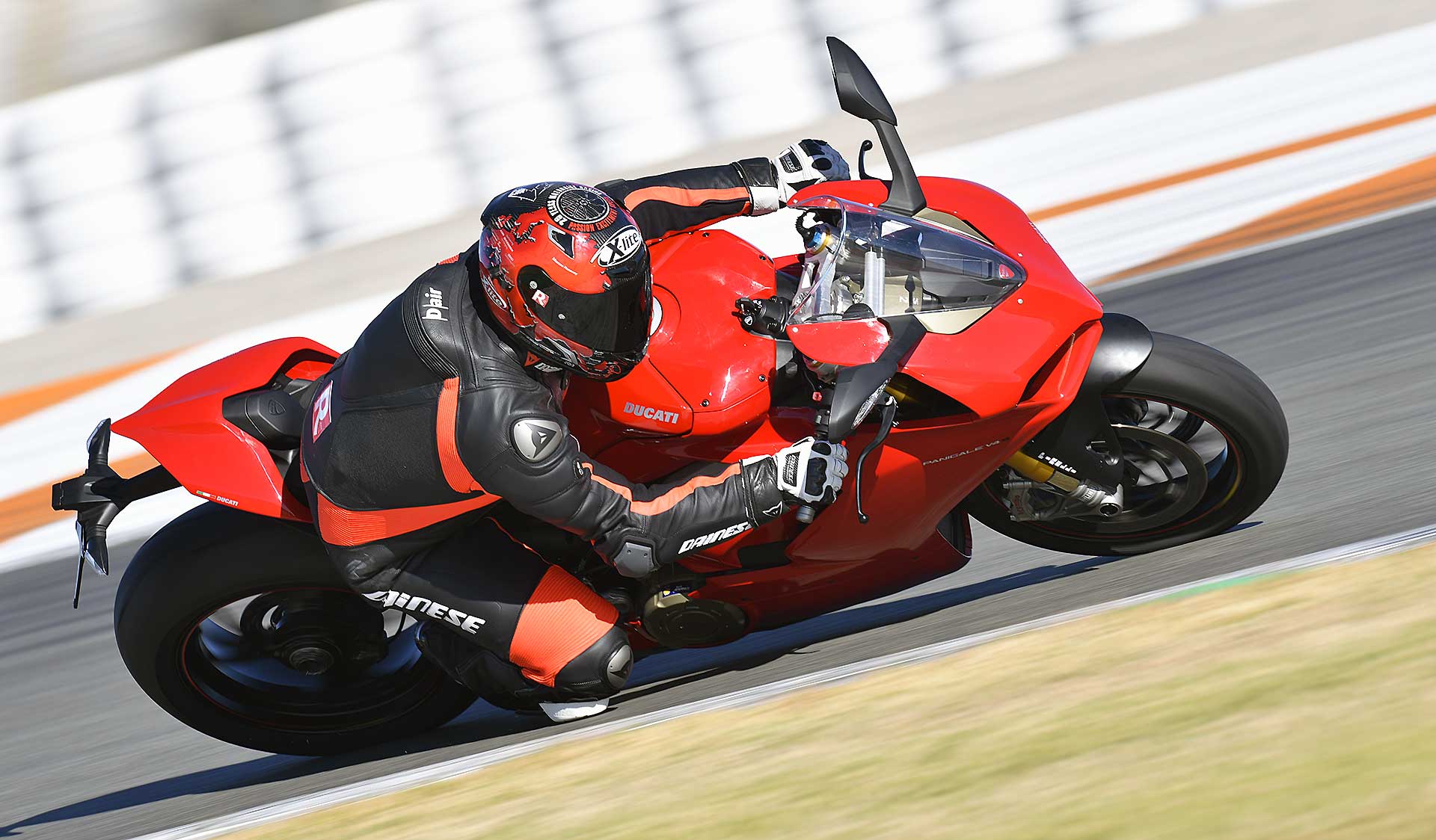 L’apporto dell’elettronica è ovviamente sempre importante, ma la mia sensazione guidando la V4 – cosa che non percepivo sulle ultime Ducati sportive – è che sia la base meccanica a essere “sana” e funzionale. Perché certe cose, come il feeling dall’avantreno in inserimento curva o l’esatta percezione di quel che accade nell’interfaccia pneumatico asfalto ogni volta che apri il gas, non sono ottenibili con l’elettronica. Elettronica che tuttavia in questo caso è a livello di eccellenza, anche parlando di sospensioni. Avevo già apprezzato le Ohlins EC 2.0 su Honda, qui trovo conferma di un funzionamento impeccabile e di una possibilità di taratura più facile e immediata. Detto questo, l’assetto con cui Ducati ci ha fatto trovare le moto per Valencia era praticamente perfetto. Ho “giocato” solo un po’ con il freno motore.ARIA NUOVAMi aspettavo che questa moto andasse forte, molto. Ed è così. Soprattutto ero curioso di verificare quanto facilmente potesse andare forte. Questo è il punto nodale, questo è quanto prometteva Ducati e questo è ciò che potrebbe convincere molti motociclisti che mai hanno pensato di guidare una bicilindrica a saltare sulla V4 bolognese. Costruire moto estreme, se vogliamo, è facile. Costruire moto estreme ma guidabili e che ti aiutino ad arrivare velocemente al limite anche se non sei Stoner, lo è un po’ meno. È questo il passo avanti più consistente che mi sento di attribuire alla Panigale V4. Pur con prestazioni superiori alla 1299, l’impegno mentale e fisico di guida è diminuito, vai più forte e fai meno fatica. Il che significa divertirsi di più e stancarsi di meno.CHIUDE ALLA GRANDEPartiamo con la mappatura Sport. La moto è amichevole, intuitiva. I vantaggi dell’albero motore controrotante sono evidenti dalle prime curve, curve in cui la Ducati si inserisce con una leggerezza e una immediatezza sconosciuta fino a oggi alle moto di Borgo Panigale. Freni-inserisci-giri la testa-punti la corda come con un mirino-chiudi la traiettoria. In questa fase della guida la Panigale V4 è semplicemente fantastica. La 1299 la dovevi “lavorare”, la V4 entra (quasi) da sola. A mio parere è eccezionale anche la fase in cui torni ad aprire il gas (e lo apri presto…), situazione in cui la gestione di quei primi, fondamentali gradi di rotazione del polso destro è davvero eccellente per precisione e risposta. Impressionante il modo in cui ti trovi a mungere la manopola a moto piegata. Inusuale la capacità di tenere la linea. Soprattutto se pensiamo che siamo al cospetto di 214 cv, che diventano 226 con lo scarico Akrapovic. Corroborante come in questo frangente si riesca a fare strada senza lottare con la moto.DNA DUCATI