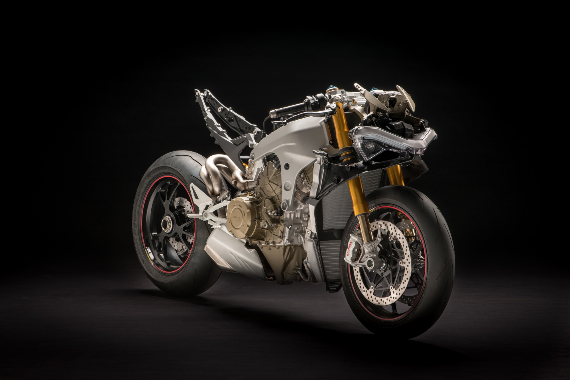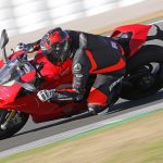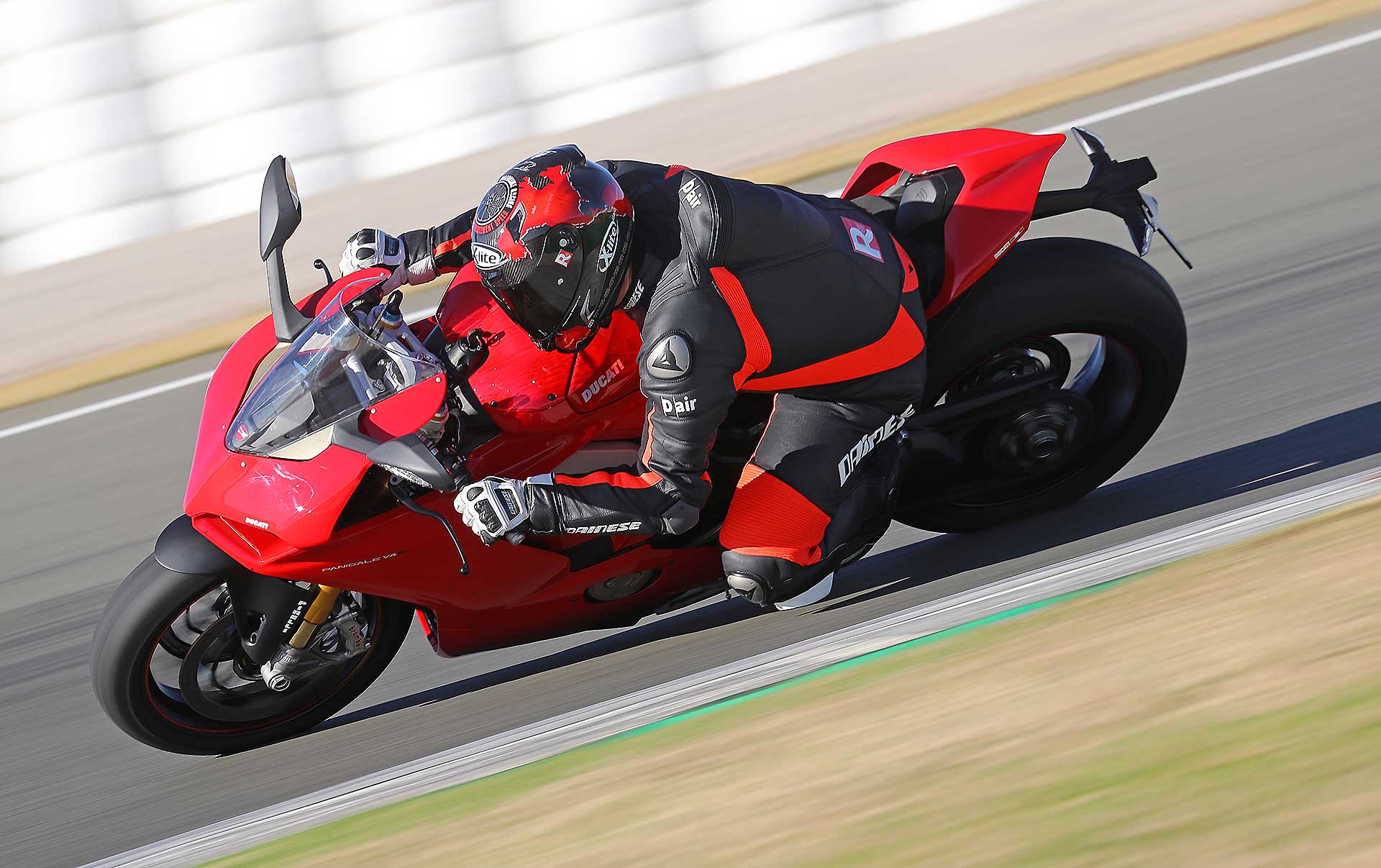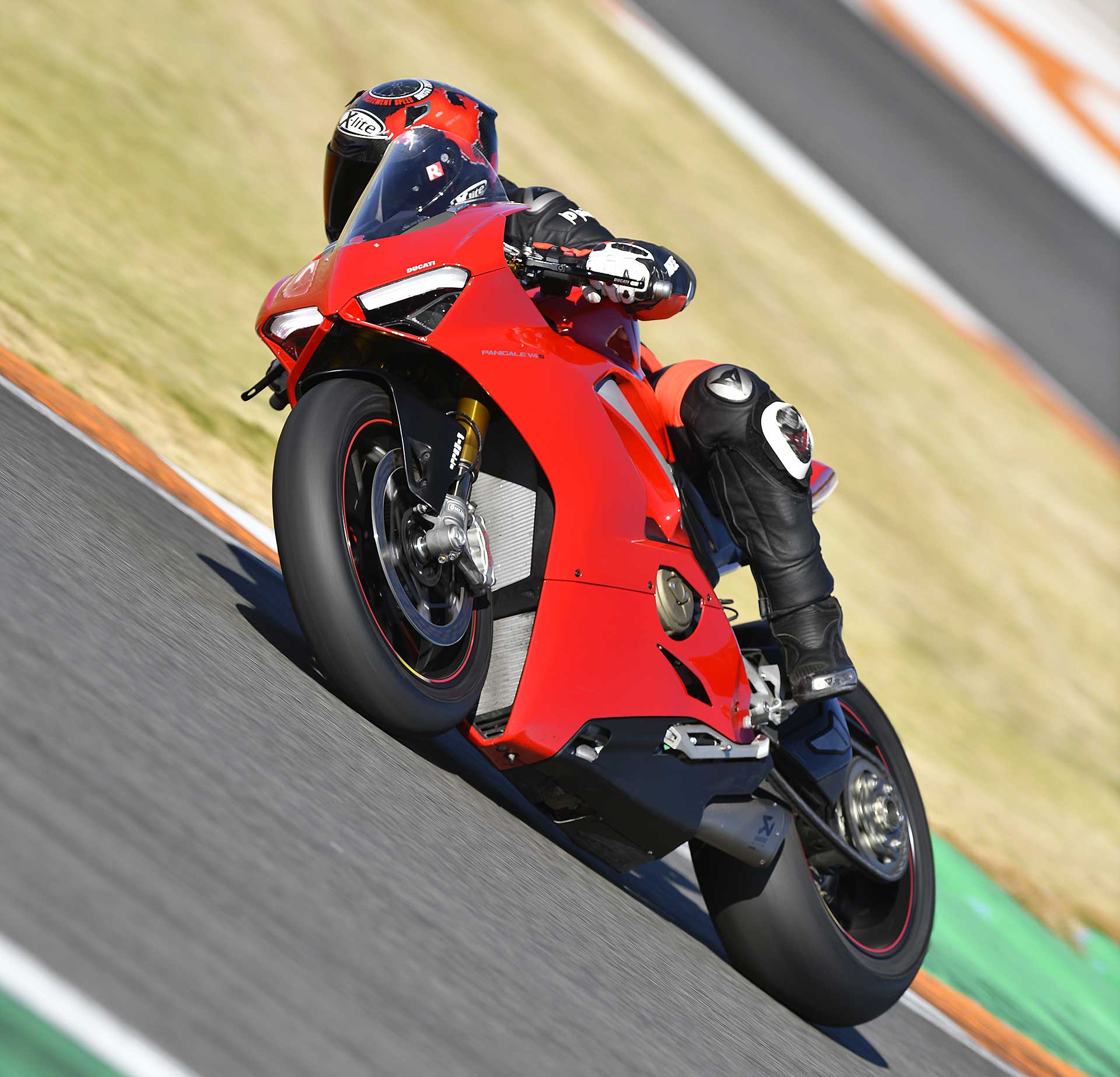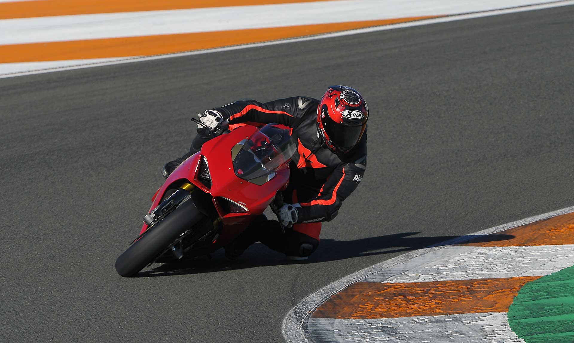 Warm up, un giro dietro a Valia a ritmo bando, giusto per prendere confidenza con moto e pista. Prima curva, seconda curva ginocchio a terra, terza curva vado sul gas come con una 600, siamo nella mappatura “Sport” e così configurata la V4 è un gattone che fa le fusa. Potenza tanta, ma gestita alla grande. Mai trovato su una Ducati un atteggiamento del genere, un’intuitività così marcata fin dalle prime curve. Ho tempo di notare la strumentazione bellissima e comprendere come navigare all’interno della gestione elettronica sia finalmente davvero intuitivo. Due i livelli di apporofondimento, uno che è possibile fare “al volo” che setta rapidamente quasi tutti i parametri, e l’altro che consente di andare nel dettaglio personalizzando la moto fino all’ultimo click.A Borgo Panigale devono aver pensato: “Se bisogna cambiare le cose allora facciamolo per bene”. La V4 alza l’asticella in casa Ducati, ma per certe cose ridefinisce alcuni parametri e punti fermi del mondo superbike.Come mi è già capitato di dire in molte occasioni, al livello tecnico attuale è sempre più difficile arrivare con una moto nuova e marcare la differenza rispetto a quanto c’è già in produzione. I passi avanti sono più piccoli che in passato, per quanto non meno importanti. E come mi è capitato di dire spesso, a questo livello le moto non si possono più “spacchettare”. Non c’è un elemento che prevarica gli altri. Moto così funzionano bene perché è tutto il pacchetto a essere efficiente, e per pacchetto intendo l’insieme di motore-ciclistica-elettronica-pneumatici. Guidando la Panigale V4 si capisce che tutto è stato sviluppato progressivamente e in parallelo fin dai primi disegni sulla carta. Una moto come questa non andrebbe così solo con un gran motore o con una gran ciclistica, oppure con buone gomme. Va così perché tutti gli elementi si “compenetrano” interagiscono l’uno con l’altro e funzionano all’unisono.CICLISTICA “SANA”, ELETTRONICA A SUPPORTO