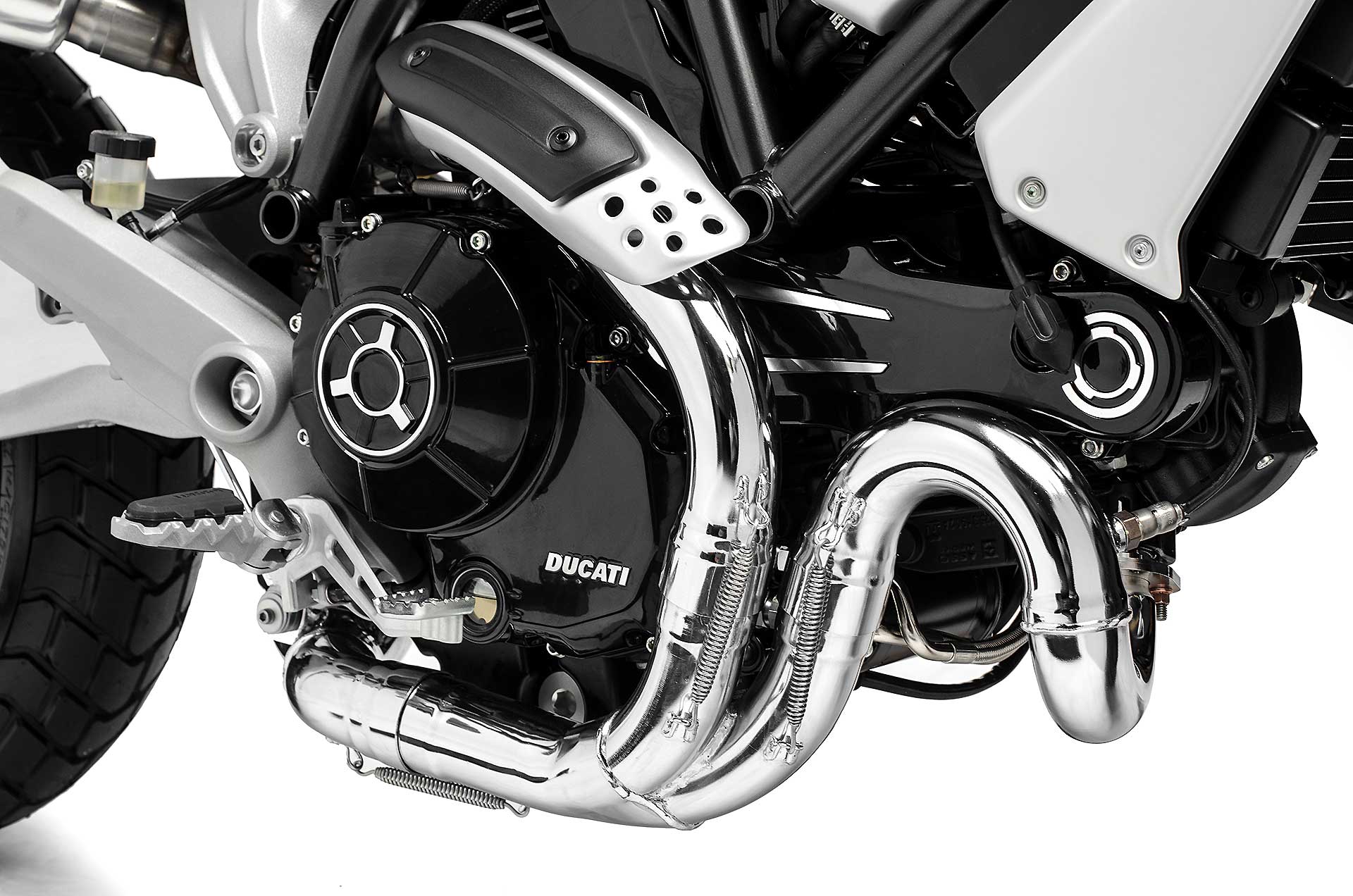 Il motore bicilindrico a L Desmodue e soprattutto i voluttuosi collettori di scarico contribuiscono a caratterizzare il lato nobile della moto, enfatizzando il design classico ma allo stesso tempo ricco di spunti contemporanei.Vintage di sostanzaPerché effettivamente, a ben guardare, di “vintage” nello Scrambler 1100 c’è l’ispirazione, non certo la componentistica né tanto meno il disegno dei particolari. Dentro il metallo si muove una coppia di grossi pistoni, quelli del classico bicilindrico con alesaggio di 98 mm e corsa di 71. Al centro della L troneggia il corpo farfallato da 55 mm di diametro, elemento essenziale del Ride By Wire e dotato di due iniettori sotto farfalla. 86 cv di potenza a 7.500 giri/min, con 88 Nm di coppia a 4.750: sono i numeri, rassicuranti, che lasciano intuire quali siano le caratteristiche del motore di 1.079 cc, ovviamente con distribuzione desmodromica e due valvole per cilindro. Due le candele per cilindro, con incrocio valvole di 16°.