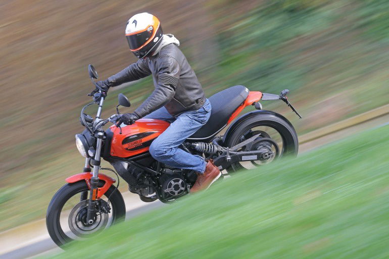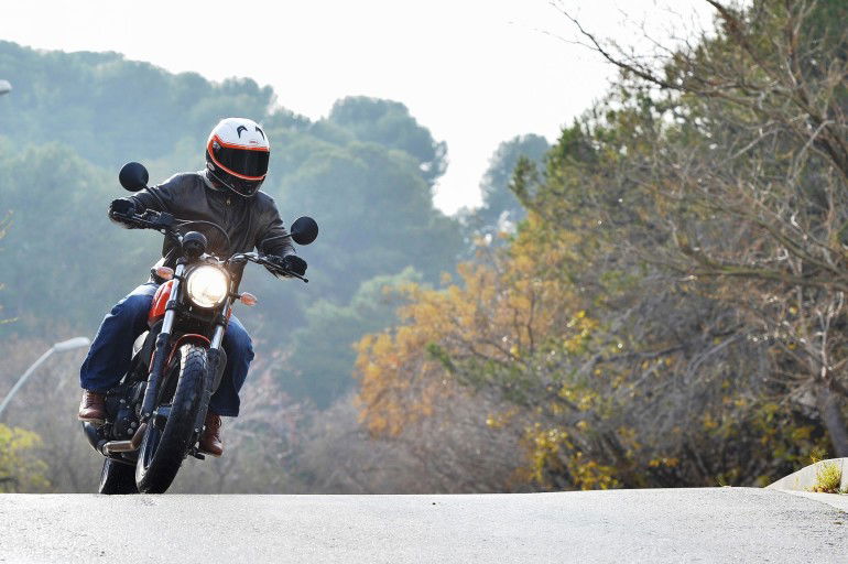 Se imbottigliati nel traffico avevo apprezzato il motore per la sua erogazione quasi da scooter, lineare e dolce, quando il ritmo è salito e le pieghe si sono accentuate, ecco uscire l’altro volto della Sixty2. Ai 5.000 giri arriva una prima spinta, seguita circa duemila giri più in alto da un’altra progressione, senza mai perdere in gestibilità. Anche spalancando il gas da centro curva, infatti, la risposta non è brusca e la potenza arriva con gradualità. La ciclistica è in perfetta sintonia con il motore e le sue caratteristiche. Il telaio e le sospensioni, con forcella, a steli tradizionali, riescono a offrire buona maneggevolezza e il giusto comfort quando si ha a che fare con pavé, tombini e rotaie, ma non pagano pegno quando gli si chiede sostegno e rigore. La scramblerina è precisa e gustosa, rapida nei cambi e, soprattutto, sempre prevedibile. Non ci si trova mai spiazzati e anche chi è meno smaliziato non si troverà in imbarazzo. La posizione in sella aiuta molto nella sua gestione: la seduta è bassa e permette di appoggiare entrambi i piedi a terra, il manubrio largo e con una piega che favorisce una postura rilassata ma sempre in controllo, sia fra le auto sia fra le curve. E l’idea che ci si fa leggendo le quote del telaio (le medesime della 800) è confermata sull’asfalto: i 24° del cannotto e i 112 mm di avancorsa conferiscono agilità, mentre l’interasse di 1.460 mm garantisce stabilità e precisione.