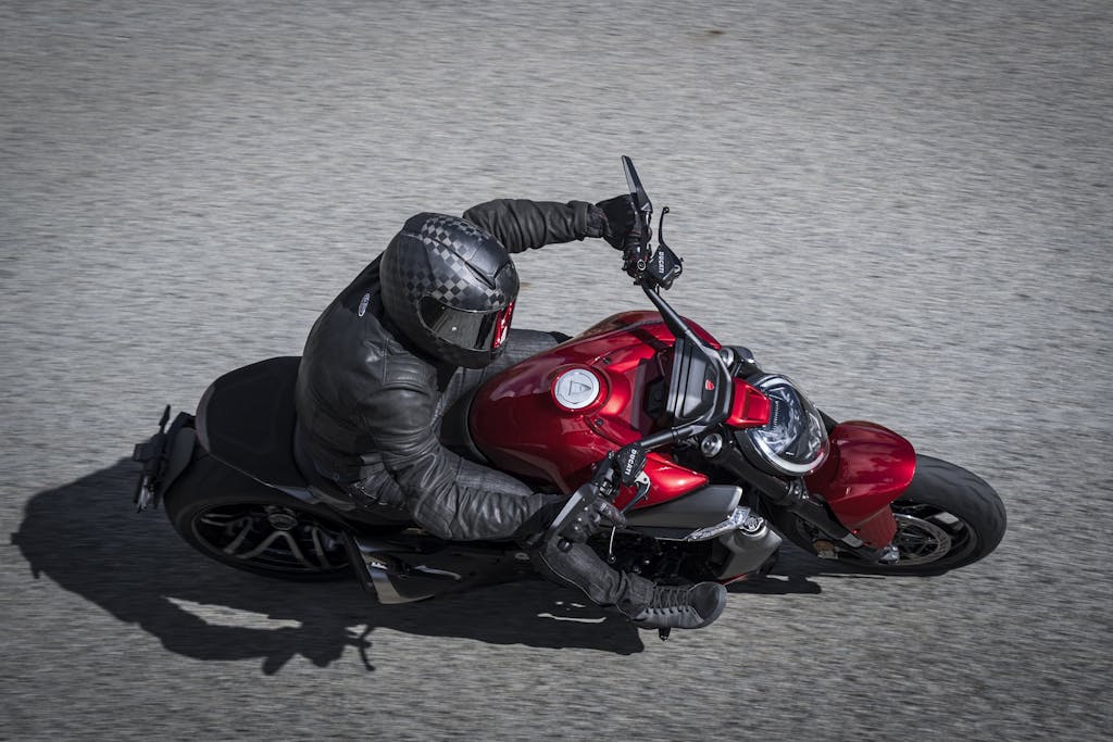 Rispetto al passato un punto di sostanziale miglioramento riguarda il monoammortizzatore, che sulle sconnessioni stradali fa bene il suo mestiere, filtrando con efficacia e garantendo un livello di comfort più che soddisfacente. La differenza rispetto alla XDiavel 1260 è netta, un passo avanti decisivo per l’uso in città e nei trasferimenti di media durata. Merita un approfondimento anche il motivo per cui questa V4 monta pneumatici Pirelli Diablo Rosso III e non i più recenti Diablo Rosso IV: la moto è stata sviluppata con i Rosso III perché in quel periodo dei Rosso IV non era ancora disponibile la misura posteriore 240/45. A proposito della gomma si può anche dire che grazie alla ciclistica molto efficace della XDiavel V4 non è difficile arrivare a usarla tutta, o quasi, senza difficoltà. E che lavori bene si capisce dalla temperatura che raggiunge il battistrada anche quando l’aria e l’asfalto, come nel corso della prova, arrivano a malapena a 10°C…