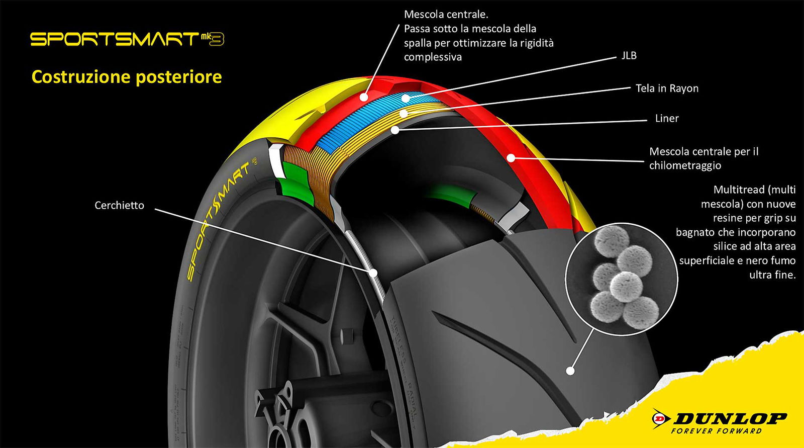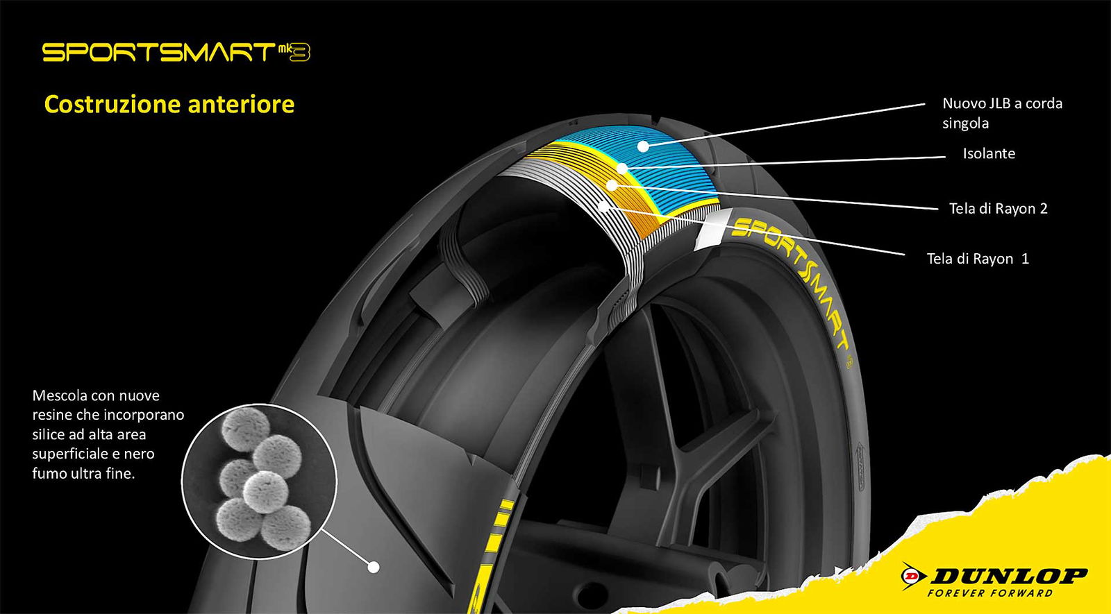 La filosofia di cui parliamo è stata battezzata da Dunlop DFF (Dynamic Front Formula) e prevede un cambio del metodo di progettazione dello pneumatico anteriore che coinvolge stampo, profilo, carcassa. La peculiarità di quest’ultima è di essere costruita con lo stesso metodo che Dunlop sta utilizzando negli pneumatici ufficiali sfruttando quindi la tecnologia JLB monfilo.Per farla facile senza entrare in troppi tecnicismi, la tecnologia JLB prevede che un filo (di aramide o acciaio secondo i prodotti) venga avvolto senza soluzione di continuità sulla carcassa nella direzione del rotolamento. Questa tecnologia seve a conferire rigidità e a impedire che in velocità la gomma si “allarghi” per effetto della forza centrifuga. Fino Il JLB era composto da una “piattina” preassemblata di tre fili che veniva avvolta sulla carcassa. La costruzione mono filo, invece, lo dice la parola stessa prevede che il filo sia singolo. Risultato? Un pelo meno di rigidezza (quella che potremmo definire “scomoda”) in favore di una gomma che si plasma meglio sull’asfalto offrendo quindi secondo Dunlop miglior feeling di guida e un feedback migliorato.