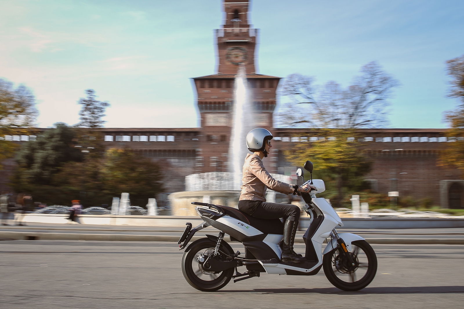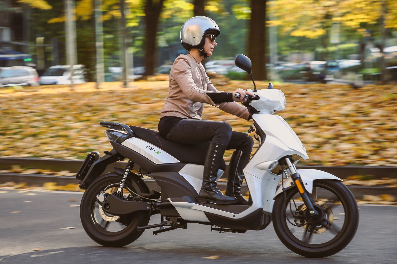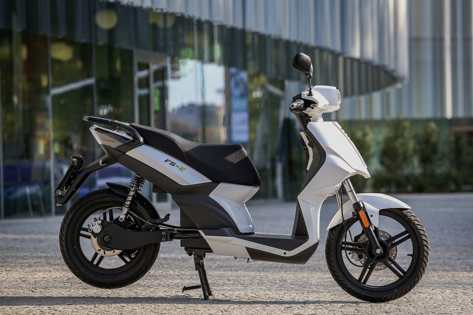 Si schiaccia un tasto e silenziosamente, senza vibrazioni, lo scooter elettrico è pronto all’uso. Un segnale acustico avvisa che basta accelerare per muoversi. L’accelerazione è decisa e addirittura le prime volte sorprende, ma ci si mette poco a imparare a dosare la manopola per far sì che la partenza sia meno brusca. Il nuovo F5-5, omologato 125, è leggero e maneggevole, facile da guidare e intuitivo. Colpisce il peso contenuto, che accentua la sensazione di grande agilità nel traffico, obiettivo primario per uno scooter elettrico a vocazione esclusivamente cittadina; le ruote alte (14”posteriore e 16” anteriore) contribuiscono a un’adeguata stabilità, associata a una piacevole sensazione di sicurezza. Ottima per la tipologia di veicolo è la frenata, decisa e modulabile, mentre sono forse un filo troppo sostenute le sospensioni, che sulle sconnessioni dell’asfalto cittadino tendono a dare una risposta fin troppo secca.