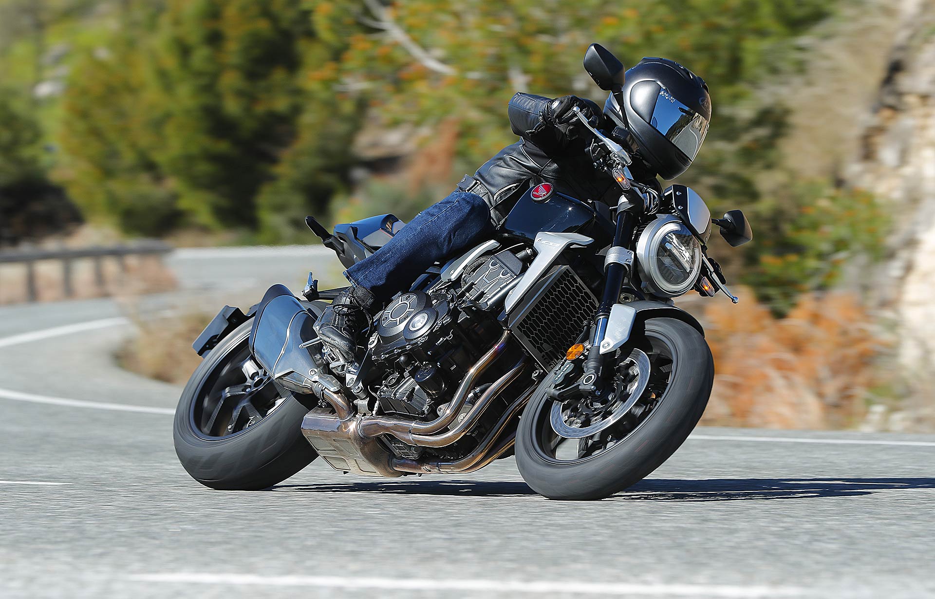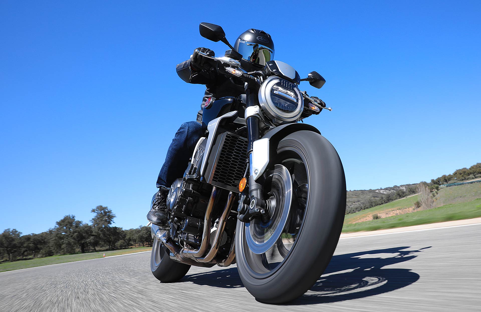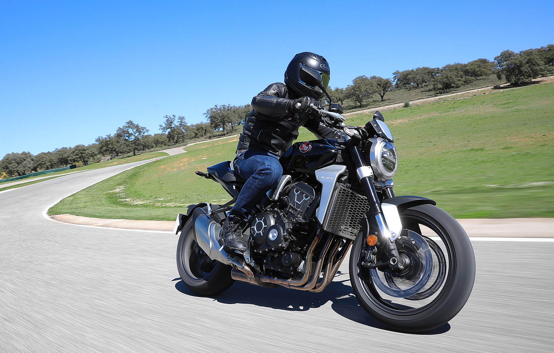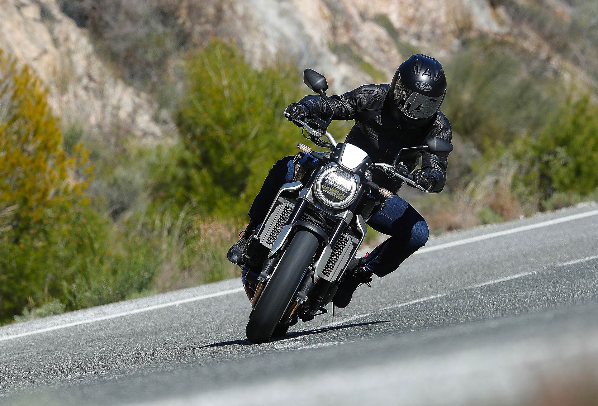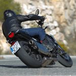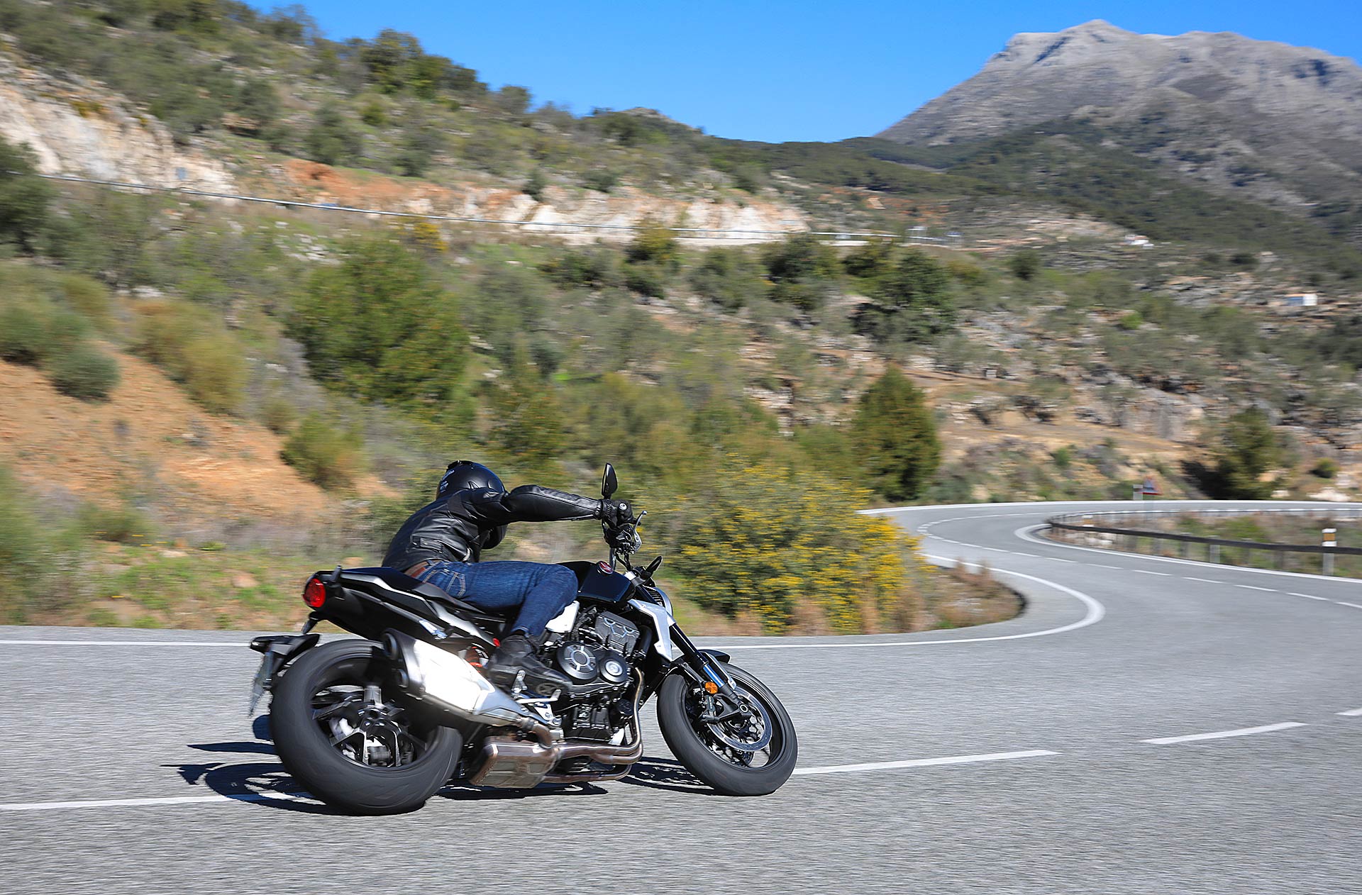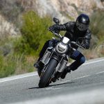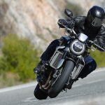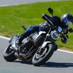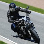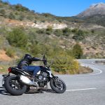 Nessun dubbioLe strade spagnole hanno la grana dell’asfalto giusta per avere grip in curva e sono lisce come un tavolo da biliardo. Il nuovo telaio in questo contesto gioca insieme a forcella e monoammortizzatore un ruolo determinante nella guida. Il trasferimento dei pesi in accelerazione e frenata è di poco conto e la robustezza della forcella in frenata aiuta a trascinare l’azione con la leva ben stretta nella mano fin dentro la curva, dove si arriva decisi e a forte velocità. Ed è in questo frangente che la CB1000R mi convince. Le sospensioni hanno struttura e qualità, sono sostenute ma scorrono e si distendono il giusto anche in accelerazione. Così la Neo Sports Café, in accelerazione fuori dalla curva non va mai a girare larga.Meno velocità più guidato