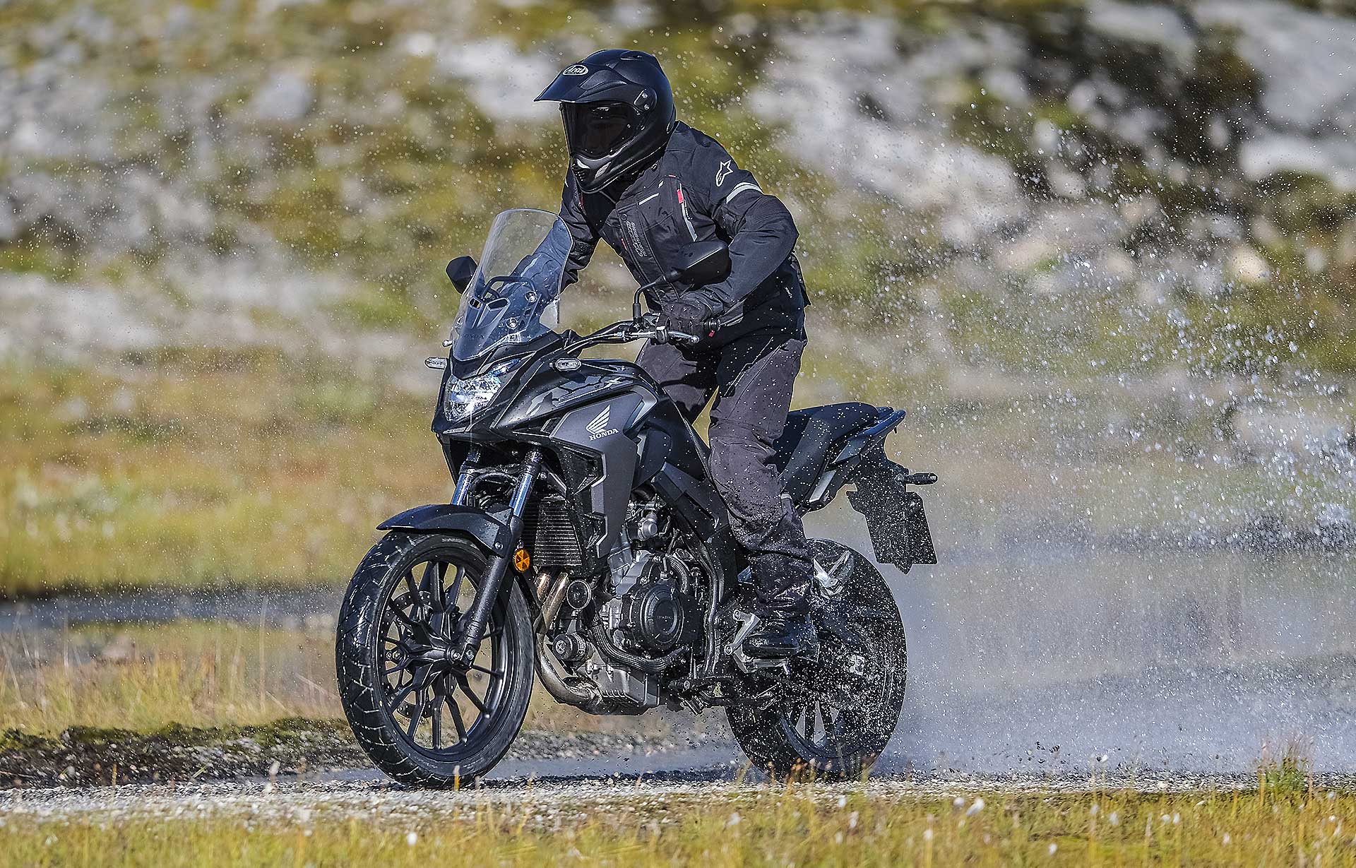 La ciclistica è accompagnata da un motore pacifico ma non insipido: per loro natura, i bicilindrici paralleli hanno una curva di erogazione piatta e lineare, senza prediligere particolari regimi. Il bicilindrico della Honda CB500X però riesce comunque a strappare un sorriso, soprattutto quando la lancetta del contagiri supera quota 5.000. Sotto tale regime è regolare ma non ha molta forza (non come quella di un monocilindrico, per intendersi): ecco perché nelle salite di montagna richiede un frequente utilizzo del cambio, che tra l’altro è corto e molto preciso, anche sotto stress.Fuori dalla strada