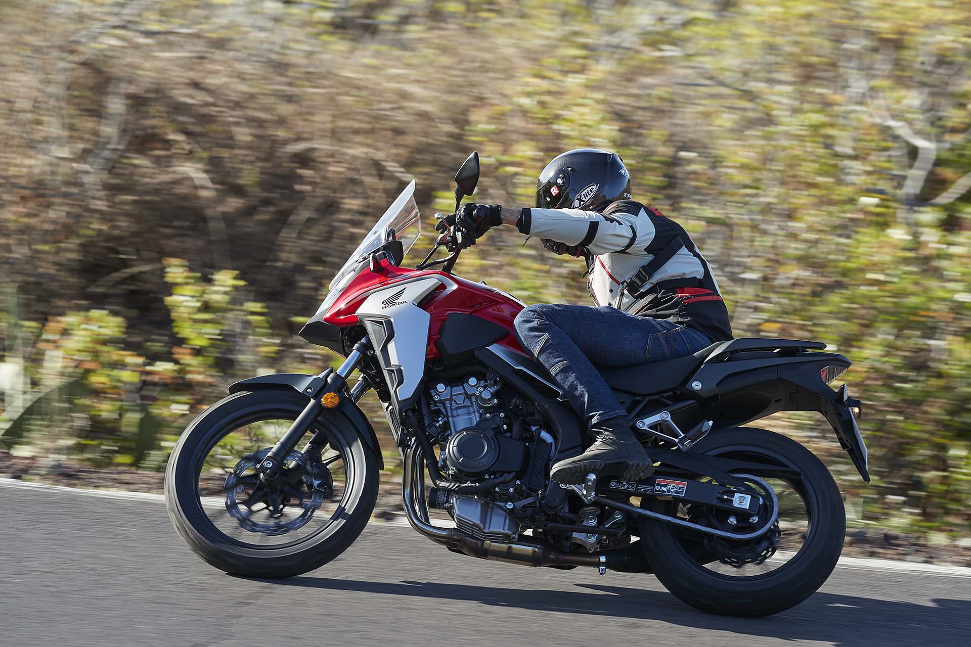 La nuova Honda CB500X è una moto matura ma semplice da gestire. L’equilibrio della ciclistica e la dolcezza di motore e comandi (cambio e frizione meritano la lode) rendono facile qualunque genere di manovra, anche nel traffico della città. Il baricentro rialzato l’ha resa solo in parte meno agile: la CB500X non risponde mai nervosa o irruenta, smorzando invece eventuali input scorretti impartiti da un pilota alle prime armi.19, il numero perfettoIl merito di questo comportamento è da attribuire al nuovo cerchio anteriore. Sacrificando un po’ di rapidità, la nuova CB curva in maniera più tonda e meno spigolosa, senza mostrare le tipiche reazioni nervose delle moto di piccola cilindrata. Si guida spediti ma disinvolti, sicuri di avere sostegno a sufficienza (le sospensioni sono lunghe ma ben tarate) e di poter correggere eventuali errori senza particolari sforzi. La guida all’attacco, fatta di staccate furibonde e ingressi in curva fulminei, non è il suo territorio: molto più naturale farsi cullare dal suo assetto confortevole ma non cedevole e dalla sua guida rotonda, quella tipica delle crossover.Piccolo urlatore