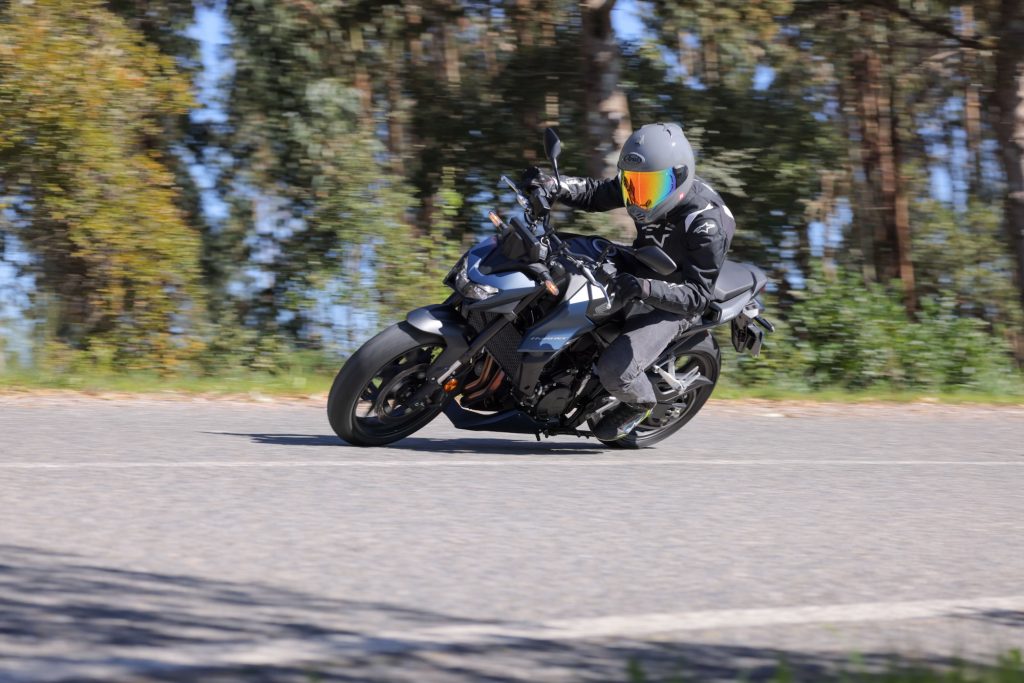 Prima di partire ho fatto mente locale per ricordare le modalità d’uso dell’E-Clucht, dato che ho provato su CB650R e CB650 serie 650. Una volta acceso il quadro e posta la moto in folle, è sufficiente inserire la prima marcia senza toccare la leva della frizione e aprire il gas. Sulla Hornet l’integrazione tra E-Clutch, acceleratore elettronico e controllo di trazione è tale che non serve modulare la rotazione della manopola. La moto non strappa, si muove docile anche a bassissima velocità, senza mai una incertezza. E quando la velocità cresce si dimentica del tutto l’esistenza stessa del sistema per gustare cambiate rapide e precise come quelle di un buon quickshifter, accompagnate però da una lodevole dolcezza negli innesti, dovuta all’intervento continuo della frizione, che si apre e si chiude per gestire al meglio i picchi di coppia durante la cambiata. I chilometri scorrono veloci sotto le ruote, senza che mai sia utile nemmeno sfiorare la leva della frizione. E questo senza che il pilota rinunci a nulla in termini di controllo della moto: decide tutto lui, dal rapporto inserito alle modalità di innesto e di scalata. E se per qualche misteriosa ragione vuole farsi carico della frizione, gli basta tirare la leva per riappropiarsi dell’incombeza, magari per togliersi lo sfizio di una bella impennata… Cambia però il feeling alla leva, perché la corsa effettiva e la tensione del cavo sono inferiori.