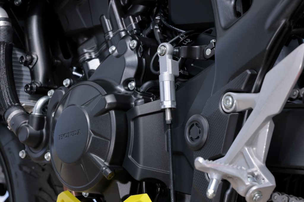 Secondo i tecnici Honda, l’E-Clutch combina i pregi della trasmissione manuale, del quickshifter e del DCT. Si tratta di una frizione a gestione elettronica, la cui logica deriva dal mondo della robotica, che vede Honda protagonista da molto tempo. Due servomotori sostituiscono l’azione manuale del pilota sulla leva al manubrio, aprendo e chiudendo la frizione; lavorano nello stesso senso per poter disporre della coppia necessaria. Già presente su altri modelli Honda come CB650R e CBR650R, l’E-Clutch mantiene sia la leva della frizione sia il pedale del cambio, e permette al pilota di prendere in ogni momento il controllo sul sistema, gestendo la frizione in modo tradizionale.