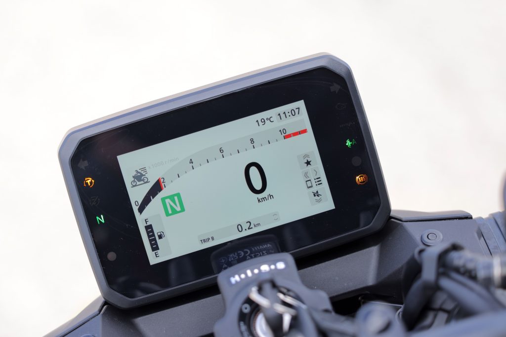 Cambiate più rapide e più dolci sono l’obiettivo dell’E-Clutch, che come detto sopra può essere spenta dalla strumentazione o disattivata temporaneamente tirando la leva della frizione. Il sistema torna in funzione se non ci sono azioni sulla leva per 5 secondi a basso numero di giri e per un secondo agli alti. La spia verde sul cruscotto, deputata a segnalare l’accensione dell’E-Clutch, si spegne per un attimo. E questo è un difetto perché non c’è nemmeno il tempo di capire che il sistema sia effettivamente disattivato. Ho provato più volte a gestire manualmente la frizione senza alcun problema: si passa al controllo manuale e dopo pochi seconti torna in funzione l’E-Clutch. Tutto semplice e lineare.
