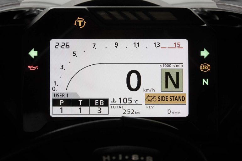 Ovviamente il comparto elettronico è da prima della classe e include (sulla SP) le sospensioni semi-attive S-EC Ohlins, con forcella NIX30 e ammortizzatore TTX36. Tutto passa per la piattaforma inerziale Bosch a 5 assi, che trasmette alle centraline motore e sospensioni le informazioni relative a rollio, imbardata e angolo di inclinazione, e le integra con numerosi altri parametri: velocità delle ruote, regime di rotazione del motore, frenata e apertura del gas. I motori passo-passo regolano compressione ed estensione anche in base alla modalità di guida selezionata fra le tre “Active” e le altrettante Manual. Più in dettaglio: A1 (Fast), A2 (Enjoy) e A3 (Safety) si basano su parametri predefiniti ma permettono di intervenire sul setup, mentre la modalità Manual è per definizione personalizzabile con la modalità del “cacciavite elettronico”. La nuova strumentazione digitale richiama l’aspetto e le funzioni dei cruscotti racing e offre tre visualizzazioni: Street, Circuit e Mechanic, quest’ultima quanto mai essenziale dato che propone soltanto contagiri, marcia inserita, percentuale di apertura dell’acceleratore, temperatura del liquido di raffreddamento e tensione della batteria. Il cruscotto dispone di una riga orizzontale di cinque LED dedicata al cambio marcia.