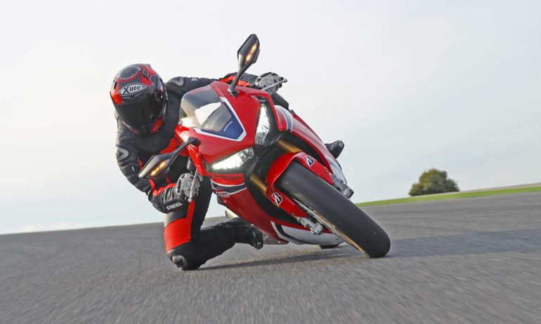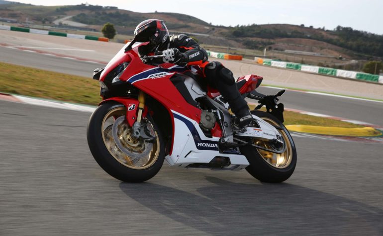 L’elettronica di gestione del motore comprende controllo di trazione su 9 livelli (Honda Selectable Torque Control HTSC) disattivabile, controllo dell’impennata, regolazione del freno motore (Selectable Engine Brake SEB) e cambio elettronico attivo anche in scalata. In sintesi, il Power Selector offre 5 livelli di controllo della potenza, con i numeri da 1 a 5 che identificano opzioni sempre più conservative; il freno motore propone tre logiche di intervento. All’ABS (cornering marchiato Nissin) si abbina il Rear Lift Control, che impedisce il sollevamento della ruota posteriore. Cinque i Riding Mode, di cui tre pre-impostati: Fast, Fun e Safe, che propongono combinazioni specifiche dei parametri precedentemente citati. I Riding Mode chiamati User 1 e User 2, invece, sono totalmente personalizzabili.Lato ciclistica vanno segnalate le immutate misure di inclinazione cannotto di sterzo e avancorsa (23°30’ e 96 mm). Cambia l’interasse (-6 mm per scendere a 1.404 mm). La ciclistica è compattissima: spicca l’impianto Brembo con pinze monoblocco M50, un vanto per una Superbike come la Fireblade. Degni di nota i 15 kg in meno di peso (ora sono 195 kg dichiarati in ordine di marcia con il carburante), frutto del lavoro su decine di componenti: dalle pareti del telaio più sottili (-300 grammi) al motore più leggero di 2 kg; dal serbatoio all’impianto di scarico, entrambi in titanio, al nuovo forcellone (-100 grammi) fino al telaio reggisella pressofuso (-800 grammi), alle ruote con disegno a cinque razze invece che sei (-100 grammi), senza dimenticare la batteria agli ioni di litio (-1.000 grammi), le plastiche più sottili e le viti più corte. I tecnici Honda sono stati evidentemente presi dalla “grammomania”: la carenatura è completamente nuova, ridisegnata per essere più stretta ed efficiente sul piano aerodinamico; l’impianto luci è interamente a LED.CBR1000RR Fireblade