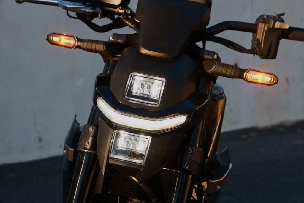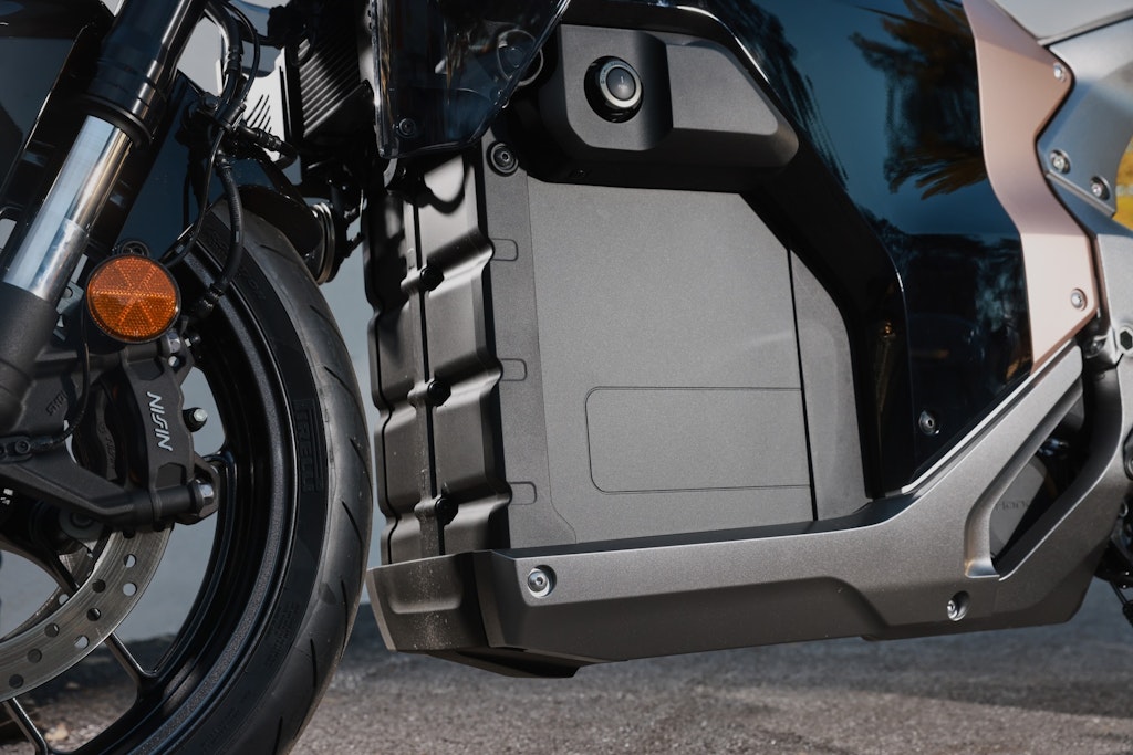 I freni utilizzano pinze Nissin a due pistoncini con dischi da 296 mm di diametro all’avantreno e un disco da 265 mm con pinza a singolo pistoncino dietro. L’ABS dispone della funzionalità Cornering. La forcella Showa BigPiston con steli da 43 mm di diametro e 120 mm di escursione non è regolabile, nemmeno nel precarico, possibilità prevista per il monoammortizzatore. Il peso dichiarato è di 217,5 kg, competitivo rispetto a molte moto a motore termico.