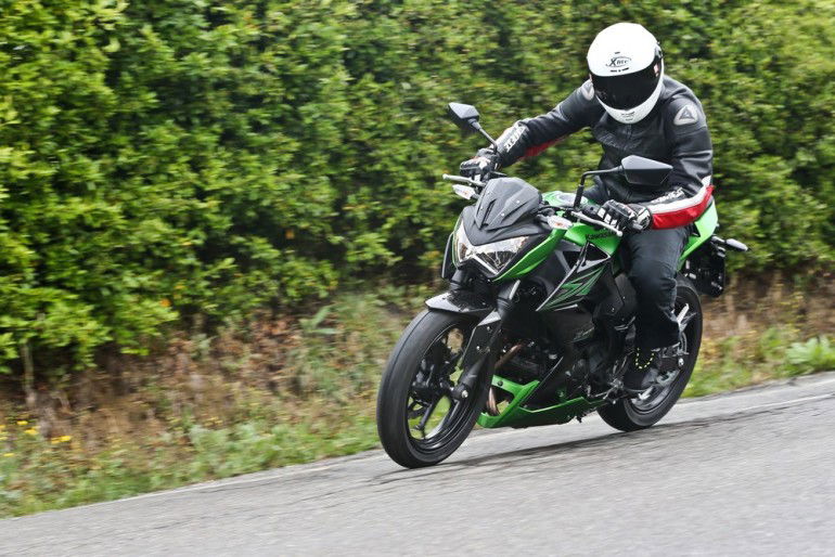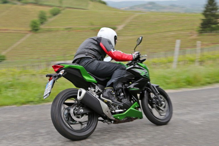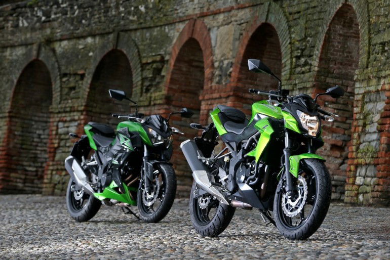 La ciclistica, come abbiamo visto, è quindi pressoché identica, mentre i cuori delle due “Zetine” battono in maniera del tutto diversa. E’ un monocilindrico a quattro valvole raffreddato a liquido il propulsore che muove la Z250 ed è capace di sviluppare 20,6 kW (28 cv) a 9.700 giri e 23 Nm di coppia a 8.200 giri. A spingere la Z300 invece ci pensa un bicilindrico parallelo a otto valvole (lo stesso della Ninja 300), capace di 29 kW (39 cv) a 11.000 giri e 27 Nm a 10.000 giri.Kawasaki Z250 SL e Z300 sono già nelle concessionarie nelle colorazioni verde e nera. Costa 4.290 euro franco concessionario la 250 (4.690 con ABS); 5.190 euro la Z300 con ABS compreso nel prezzo.Sapranno andare lontano le piccole Z? Lo sapremo con le prime risposte del mercato. Intanto la Z300 con ben 17 litri di serbatoio (11 la 250) di strada sembra volerne fare davvero tanta. RIDEEntrambe le selle sono basse (785 mm da terra), come si addice a una “prima moto”, per poter poggiare i piedi a terra con facilità; le posizioni di guida, tuttavia, sono differenti e vedono la Z250 SL molto raccolta e con il manubrio piuttosto basso. Decisamente più azzeccata e confortevole invece (anche se la sella è forse un pelo dura) quella della Z300, che è più accogliente e non stanca nemmeno dopo aver percorso molti chilometri.Borbotta il monocilindrico della 250 e frulla il bicilindrico della 300 ma, tipologie di sound a parte, i propulsori sono entrambi molto silenziosi. Per farsi sentire un po’, la Z300 può contare su uno scarico Akrapovic opzionale.Il mono è meno potente (28 cv contro i 39 del bicilindrico) ma, per la sua naturale corposità ai regimi medio-bassi e per i 20 kg di peso complessivi in meno, la Z250 SL si mostra comunque piuttosto pronta e reattiva all’apertura dell’acceleratore, anche se dà il meglio di sé quando la lancetta si avvicina alla zona rossa.Potenza spostata verso l’alto anche sul bicilindrico della Z300, che, giusto per avere un riferimento, rispetto al motore della Yamaha R3 appena provata è un tantino più pigro ai bassi regimi ma poi allunga e spinge con più carattere (nonostante qualche cavallo di potenza massima in meno).