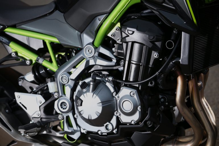 Il motore a quattro cilindri – omologato Euro 4 – è lontano parente di quello della prima Z1000. La cilindrata totale è di 948 cc, con i pistoni (costruiti con la stessa tecnica impiegata per le H2 e H2R) che scorrono per 56 mm all’interno dei cilindri pressofusi. I tecnici giapponesi hanno affinato per bene ogni componente, dall’albero motore leggero ai condotti di aspirazione di lunghezza diversa, due da 150 mm e due da 50 mm, puntando a una erogazione lineare e pastosa. La loro ricerca si è spinta nell’accordatura dell’airbox, che fa da cassa armonica per stuzzicare i timpani del pilota. In moneta sonante, la potenza massima è, come anticipato, di 125 cv a 9.500 giri, mentre il picco di coppia è di d 98,6 Nm a 7.700 giri. Quanto al reparto trasmissione, il cambio è a sei marce, con cinque rapporti ravvicinati e una sesta più lunghetta con funzione di overdrive, mentre la frizione è servoassistita e con funzione antisaltellamento.