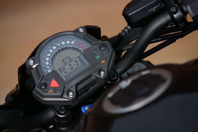 Il motore è inoltre parte stressata del telaio, che lo abbraccia con una struttura a traliccio in acciaio ad alta resistenza, il cui peso è di soli 13,5 kg. 3,9 kg è invece quanto fa segnare sulla bilancia il forcellone in alluminio, che aziona la sospensione posteriore con schema Back-Link. L’ammortizzatore, sistemato in orizzontale, è regolabile nel precarico e nel freno idraulico in estensione, proprio come la forcella a steli rovesciati da 41 mm. Ai suoi piedi ci sono pinze a quattro pistoncini che mordono una coppia di dischi a margherita da 300 mm, mentre al posteriore c’è un disco singolo da 250 mm. L’ABS è di serie ma fa storcere il naso la scelta di non usare le sue ruote foniche per un controllo di trazione. Ormai molte rivali lo montano e qui invece non si può avere nemmeno a richiesta. Parlando di altre misure, quelle delle gomme sono quasi scontate, 120/70R17 e 180/55R17, mentre interasse e avancorsa sono rispettivamente di 1.450 e 105 mm.