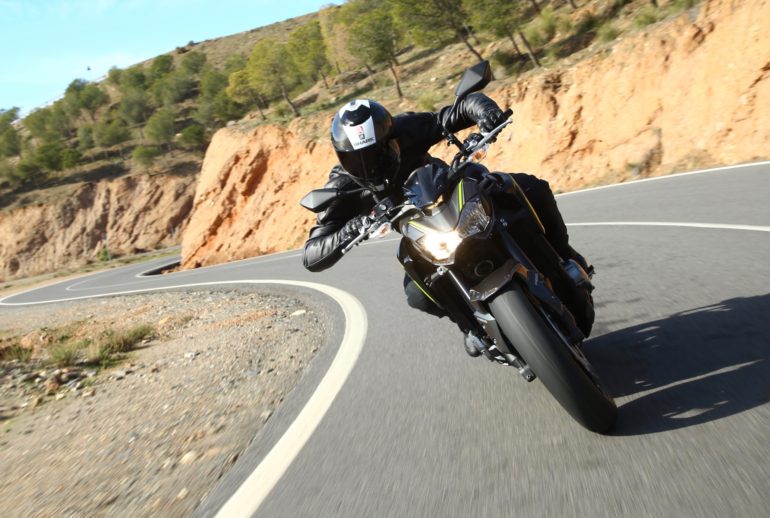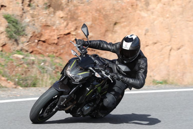 Una volta in movimento, la Z900 mette subito in mostra due qualità importanti. La frizione è morbida da azionare e il diametro di sterzata è ridotto, con il manubrio che ruota di 33° da una parte e dall’altra. Le manovre da fermo non sono dunque un problema, nemmeno per chi si trova per le prime volte alla prese con una moto di grossa cilindrata. E la sensazione di docilità non viene meno neppure con il salire della velocità. Con le masse ben accentrate e un baricentro piazzato al posto giusto, questa Kawasaki se la cava benone negli spazi stretti, con una reattività che farebbe la gioia anche di uno stuntman. Serpentine a parte, la Z900 sfoggia ingressi in traiettoria puliti e graduali e lascia un buon margine per correggere una linea impostata male o per raccordare le curve in sequenza. L’avantreno non è particolarmente carico ma rimane di norma preciso; solo forzando il passo, mi è capitato di trovarmi in percorrenza senza un gran feeling ma la colpa va divisa tra l’asfalto in condizioni non perfette e le gomme Dunlop Sportmax. La ciclistica sana della Z900 meriterebbe a mio avviso pneumatici più specialistici, che permetterebbero di sfruttare meglio anche l’azzeccata taratura delle sospensioni. Queste ultime filtrano bene non solo le buche ma anche gli avvallamenti incontrati in piega, senza scomporre l’assetto e innescare oscillazioni.