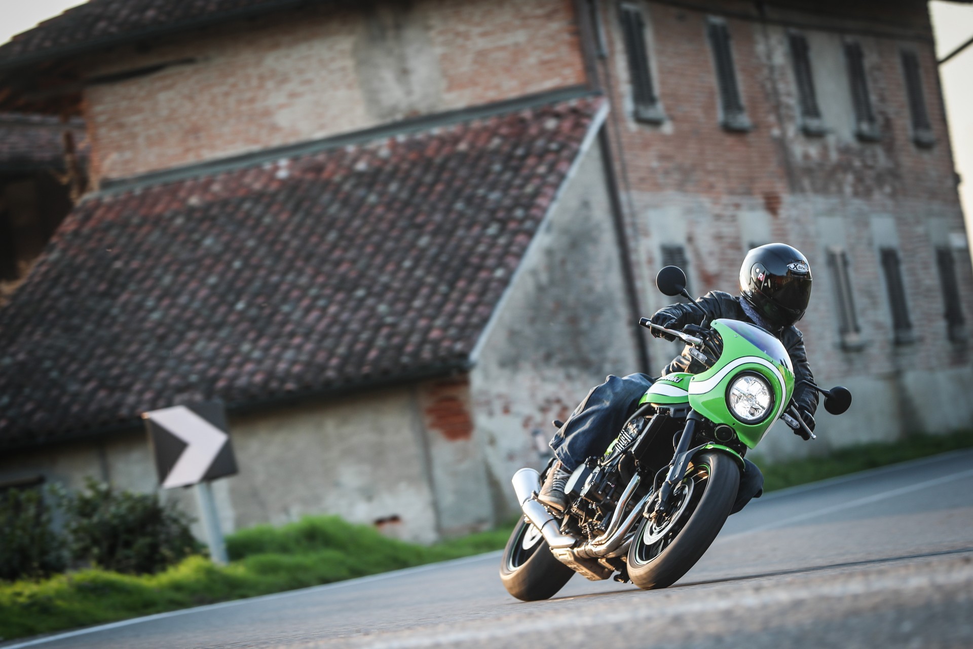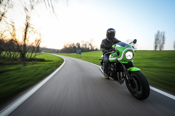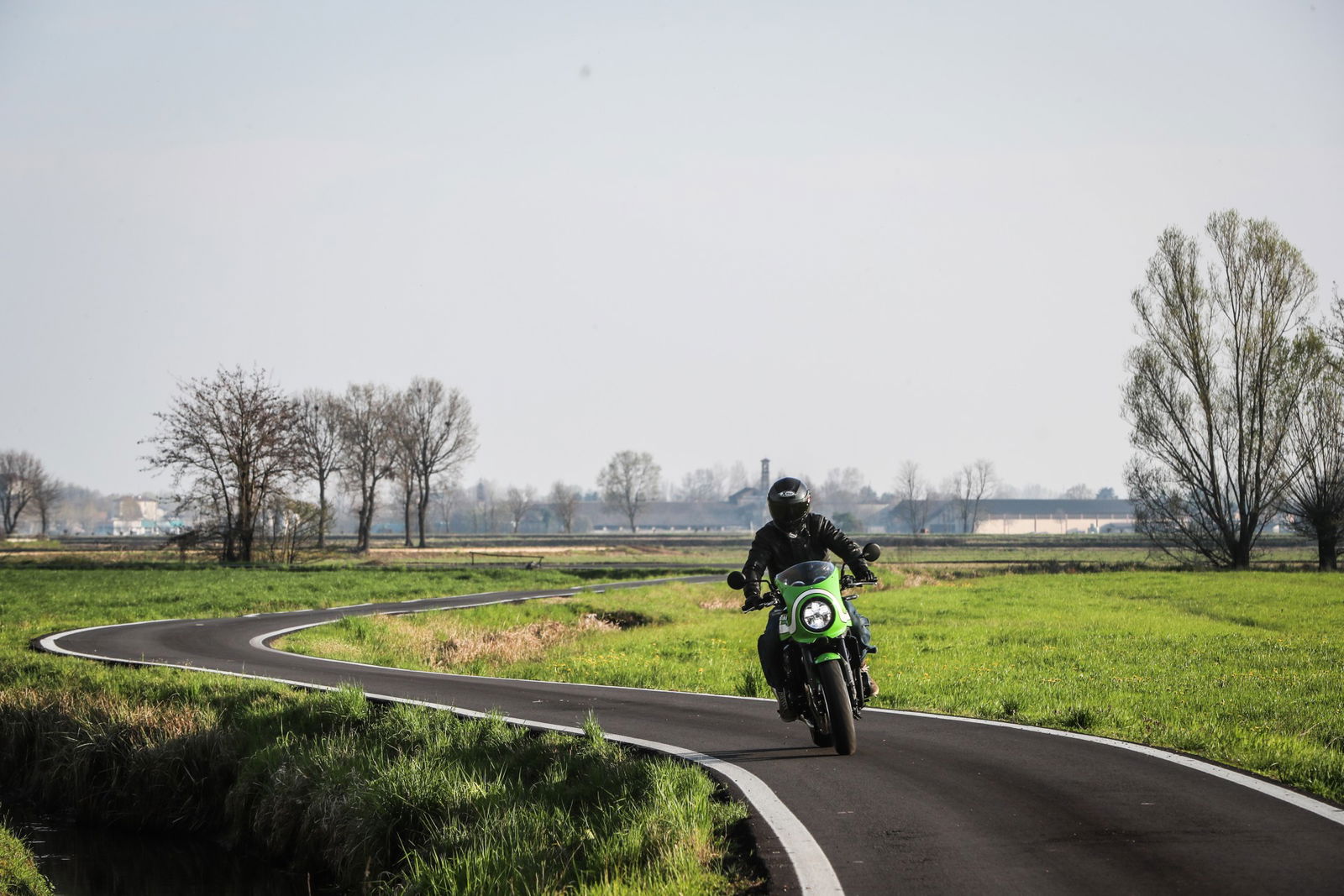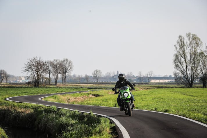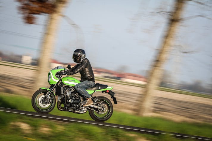 Tutta sua sorella…Dal punto di vista della meccanica e della ciclistica, se si esclude una leggera modifica al telaio per ospitare il nuovo serbatoio, nulla differenzia le due versioni, quindi prestazioni e gusto di guida sono gli stessi che vi abbiamo raccontato nel primo test della Kawasaki Z900RS. Stilisticamente, cupolino e colorazione a parte (quest’ultima porta in dote il verde lime green originale e abbina il classico fascione bianco già visto in passato sulla fantastica ZRX 1200 Eddie Lawson replica), se la si osserva con occhio artistico, la nuova Cafe ha un andamento orizzontale non così teso e lineare come la sorella Z900RS, ma è più ondulata e, potendola guardare dall’alto si noterà che ha un profilo sinuoso che richiama le curve di un corpo femminile.A distinguere la Cafe sono però alcuni accorgimenti che trascendono l’aspetto stilistico, come la sella più vicina al suolo di 20 mm e il manubrio anch’esso più basso e angolato verso il pilota. Il primo dato è una conseguenza del nuovo disegno che richiama il monoposto, mentre il secondo è un’esigenza stilistica imprescindibile per una cafe racer e che ben si sposa con il cupolino.Piace da ferma e convince quando si muoveA proposito di cupolino, la sua funzionalità è discreta (io supero di poco il metro e ottanta) perché, a meno di starvi accucciati dietro, la curvatura è più ispirata a esigenze stilistiche che a necessità pratiche. Il risultato è indubbiamente ben riuscito e la nuova Cafe è armoniosa e, sapientemente parcheggiata nel mezzo della movida milanese dei Navigli, ha fatto girare molte teste.Dai Navigli alla campagna a Sud di Milano ci si arriva abbastanza in fretta, attraversando un lungo tratto di pavè congestionato di auto e un breve tratto di strada a scorrimento veloce a più corsie. Situazioni che confermano le sensazioni della prima prova, con un sensibile on-off, una forcella che filtra meglio degli ammortizzatori(comunque regolabili), una frizione burrosissima e un motore così elastico che lo si può guidare come un monomarcia, dai 1.500 ai 10.000…La Kawa Z900RS Cafe non è una motocicletta che invita a tirare, anche se quando la strada si apre, il gusto di dare una manata di gas e sentire la spinta vigorosa del quattro cilindri accompagnata da un ruggito esaltante ce lo togliamo senza troppi preamboli. Leggermente più caricata sull’avantreno della sorella, resta tuttavia molto comoda e si guida rilassati anche se, lo si capisce da subito, se le si chiede di fare la cafe racer ubbidisce con un certo piacere.Finita la scampagnata, fra fattorie, campi coltivati e stradine che due macchine non ci passano, riportiamo la Z900RS a Milano in tempo per far brillare il suo verde fra le luci dei locali in Porta Genova. Si trova a suo agio anche qui, vezzosa e consapevole del suo charme.