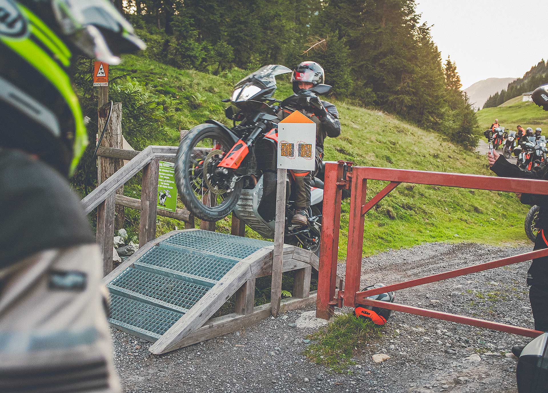 Già che siamo in argomento motore dico che mi è piaciuto molto, KTM ha ben calibrato l’erogazione per questa moto centrandola sul range 3.500-6.000 che, oggettivamente, è quello più usato su strada. A questo regime il Twin austriaco e reattivo al gas, ben dotato quanto a spinta e beve pochissimo (4,3 l/100 km il consumo alla fine del viaggio). E poi la frizione è morbida il giusto e il quickshifter piacevolmente rapido nei “tagli” (meglio di molti altri quickshifer stradali) anche se un pelo contrastato negli innesti. La mappatura Rally (optional) consente di modificare la risposta al gas (tre livelli: Street, Rally, Off Road) e il controllo di trazione in modo più puntuale (8 livelli regolabili on-fly). Con la risposta Rally piuttosto aggressiva, forse pure un pelo troppo quando si viaggia a bassa andatura. Preferisco la Street, alla fine: morbida nel cosiddetto “pick up”, ti fa sentire in mano il motore con l’erogazione che poi evolve in modo proporzionale all’apertura. Il tratto in off road di oggi mi ha fatto capire che l’ergonomia è centrata anche per la guida in piedi, solo la sella potrebbe essere un pelo più smussata negli spigoli.Finisce la giornata che non sono stanco ho ancora voglia di guidare, la moto è leggera piacevole e la sella bassa toglie un sacco di pensieri ad ogni manovra. Per chi come me non ha le gambe lunghe è la panacea. Domani giornata piena ci aspetta la regina delle strade austriache il Grossglockner e forse ci aspetta pure la pioggia. Del resto un viaggio è un viaggio.GIORNO 2 QUATTRO STAGIONI IN UN GIORNOGIORNO 3 SI TIRANO LE SOMME